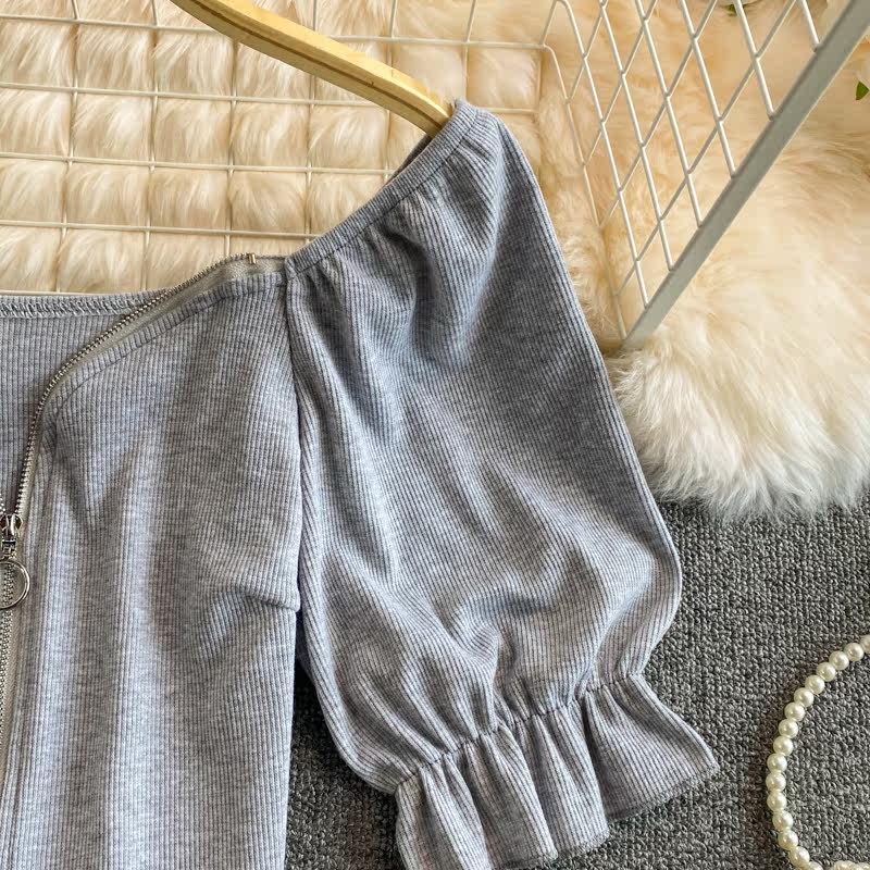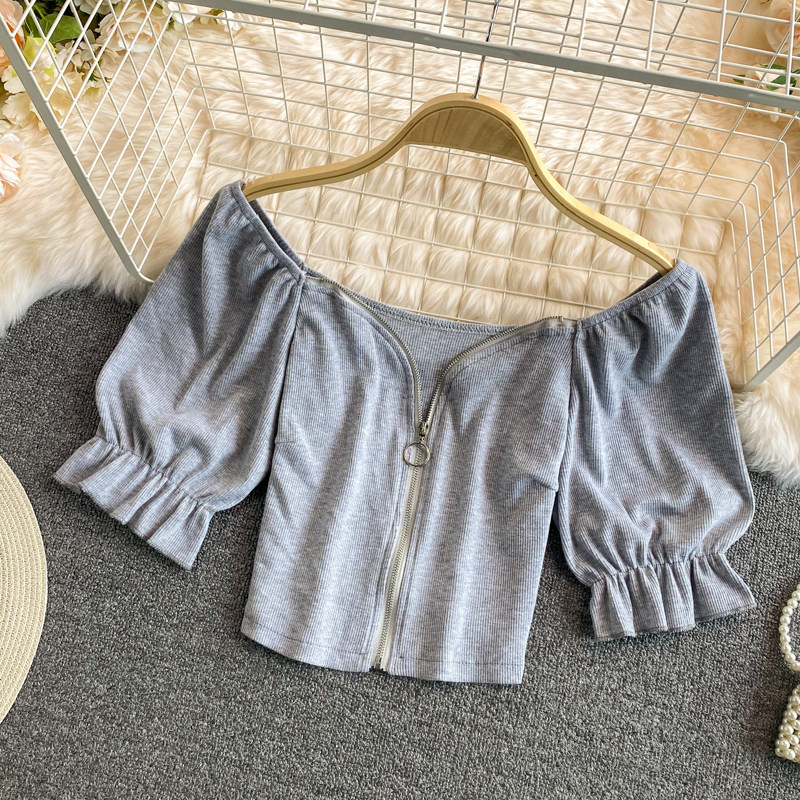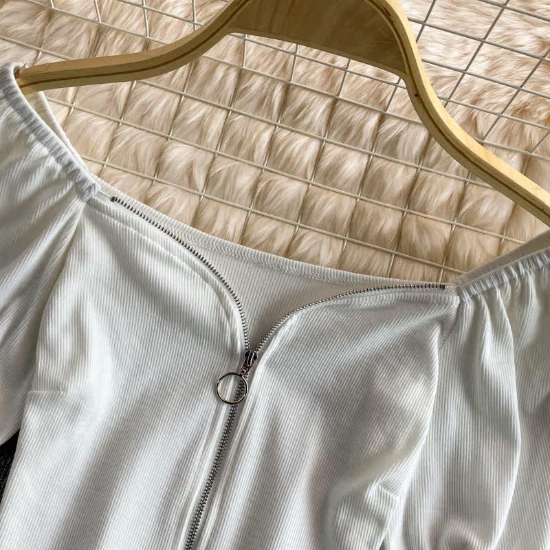 Летняя короткая футболка с молнией, короткий рукав, 2021 года, рукава фонарики, французский стиль, квадратный вырез