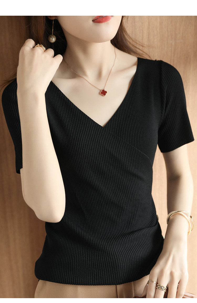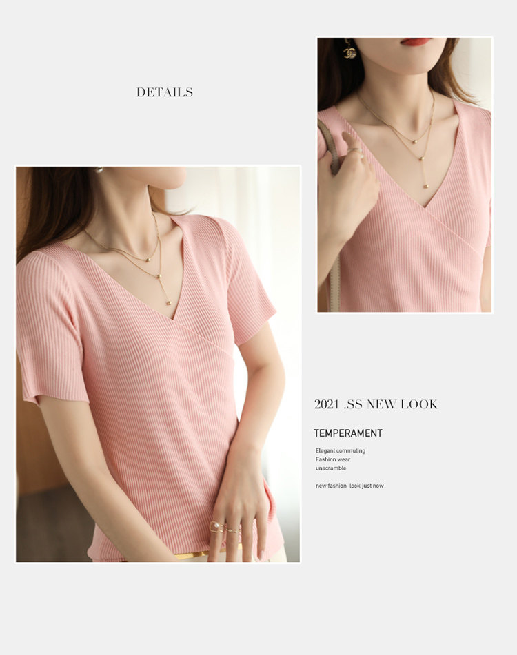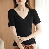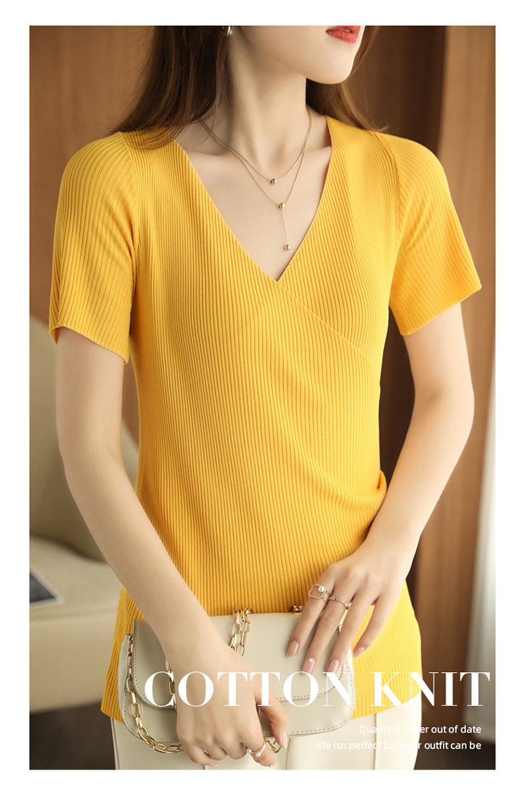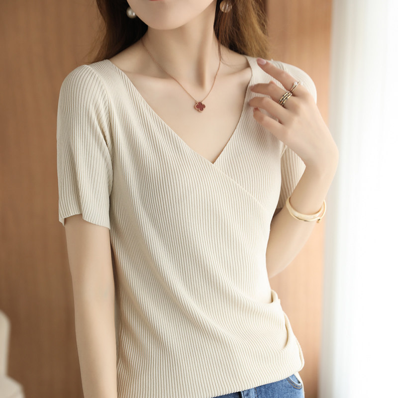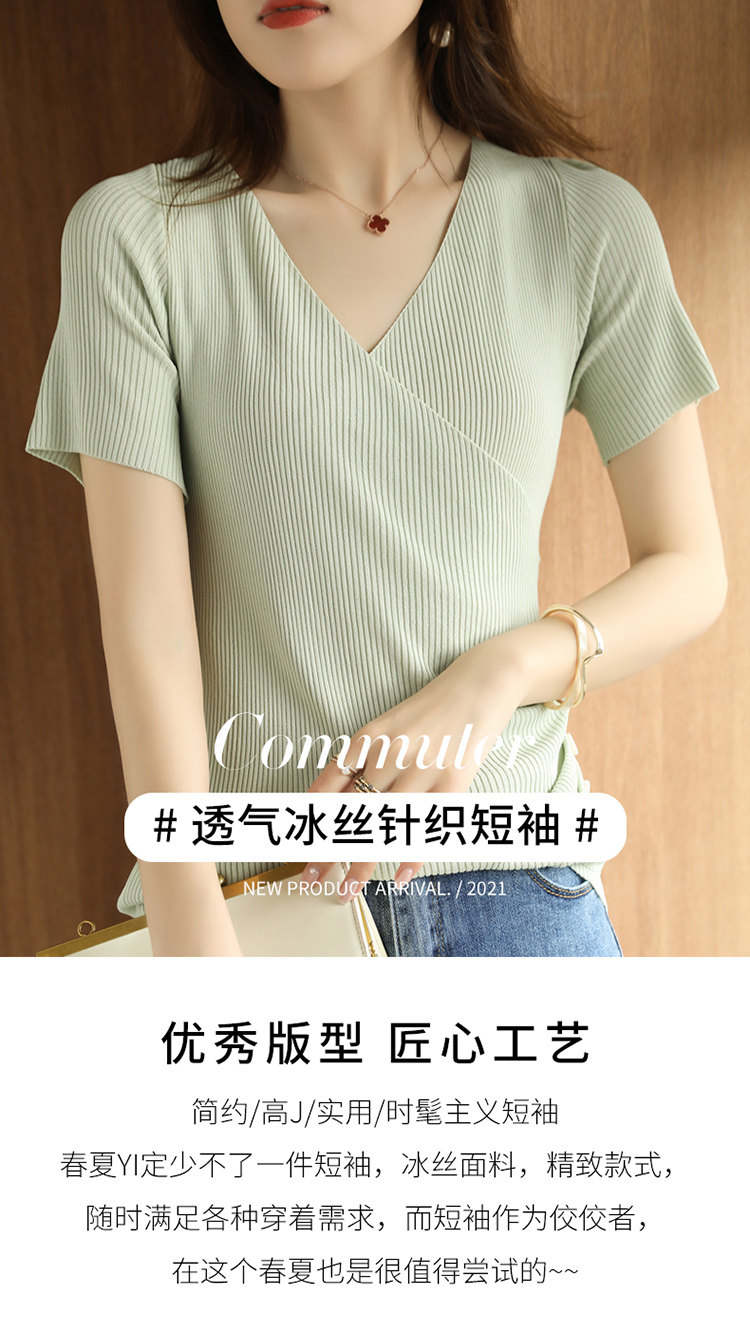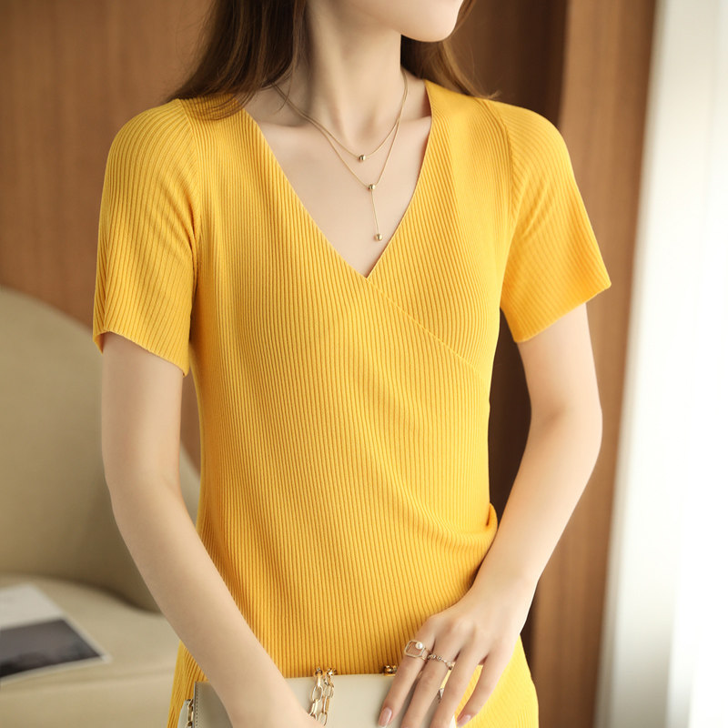 Летняя шелковая дизайнерская тонкая футболка, 2021 года, короткий рукав, V-образный вырез, тренд сезона, облегающий крой