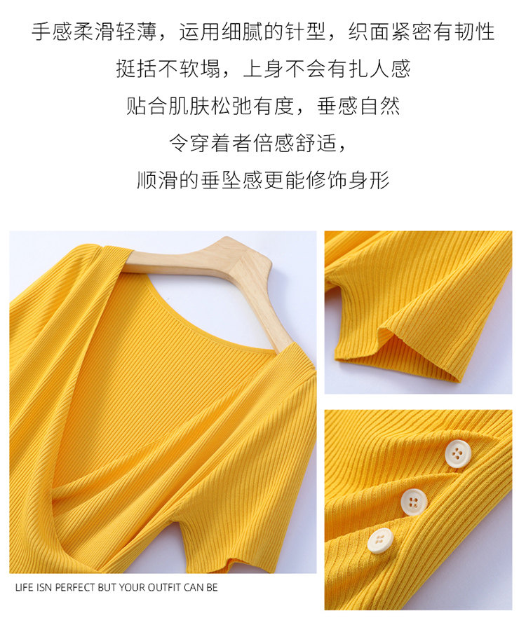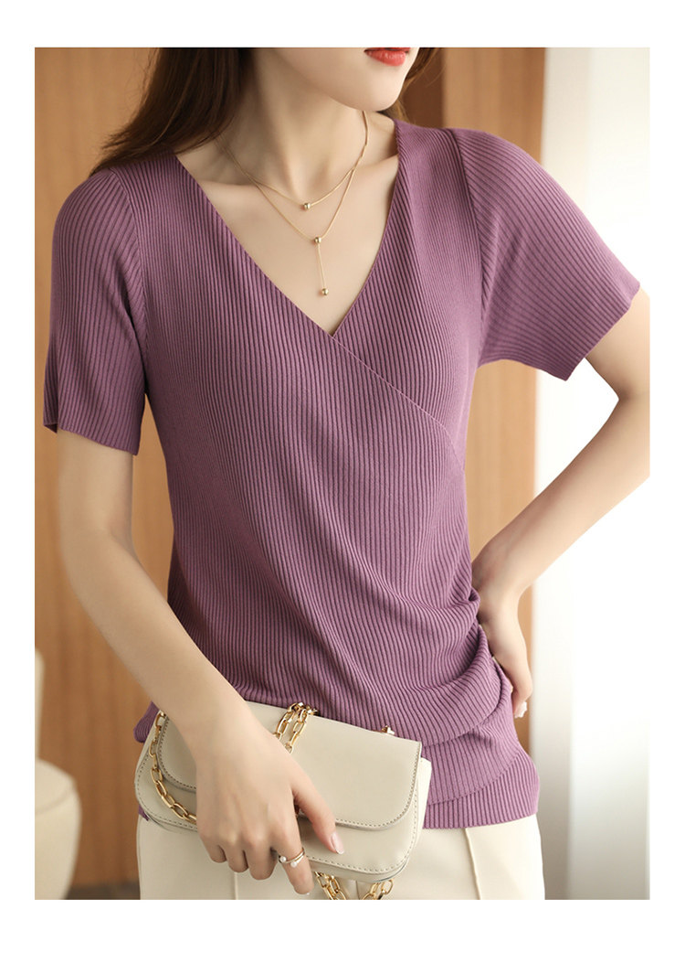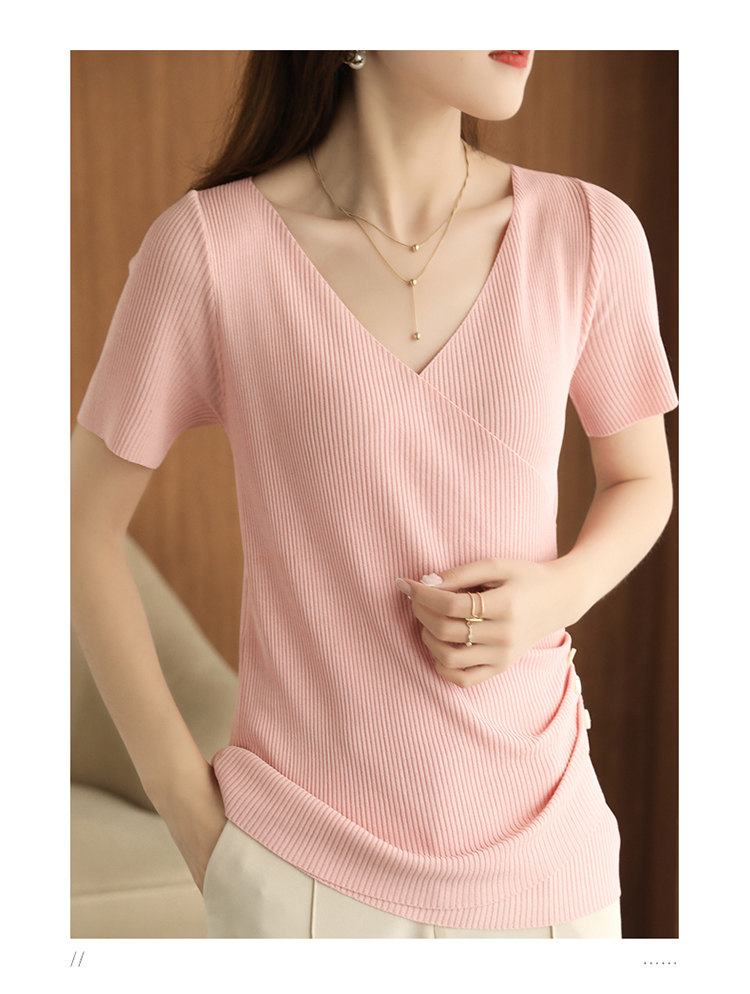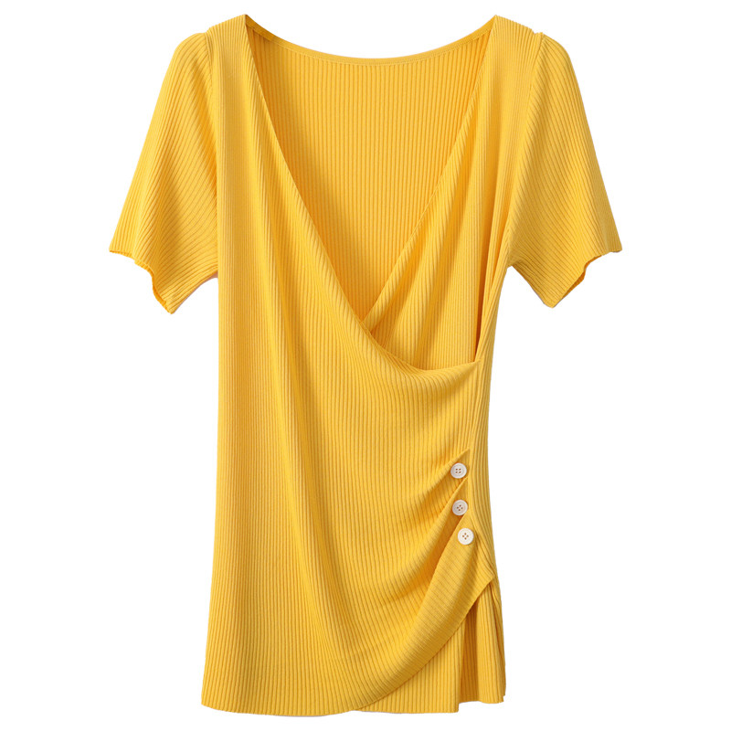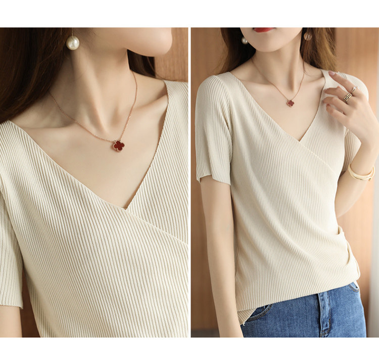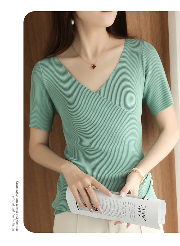 Летняя шелковая дизайнерская тонкая футболка, 2021 года, короткий рукав, V-образный вырез, тренд сезона, облегающий крой