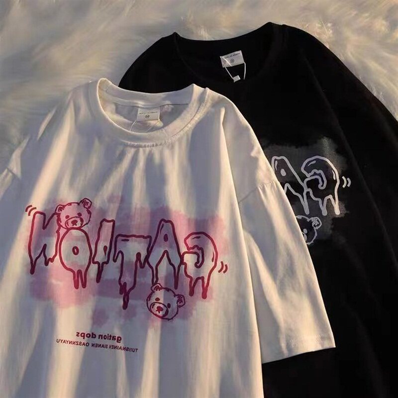 Летняя хлопковая дизайнерская футболка с коротким рукавом для школьников и студентов, коллекция 2022, тренд сезона, с медвежатами, свободный крой