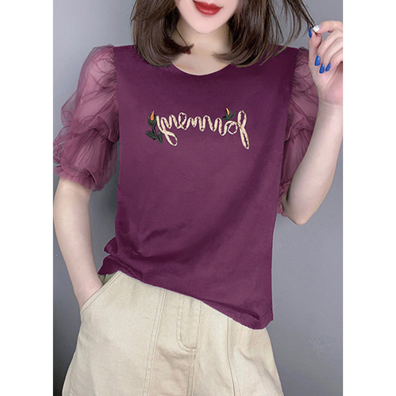 Сиреневая футболка, кружевная базовая летняя одежда с круглым воротником, в западном стиле, с вышивкой, короткий рукав