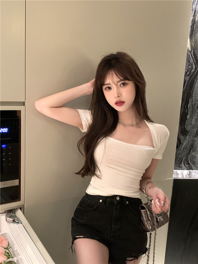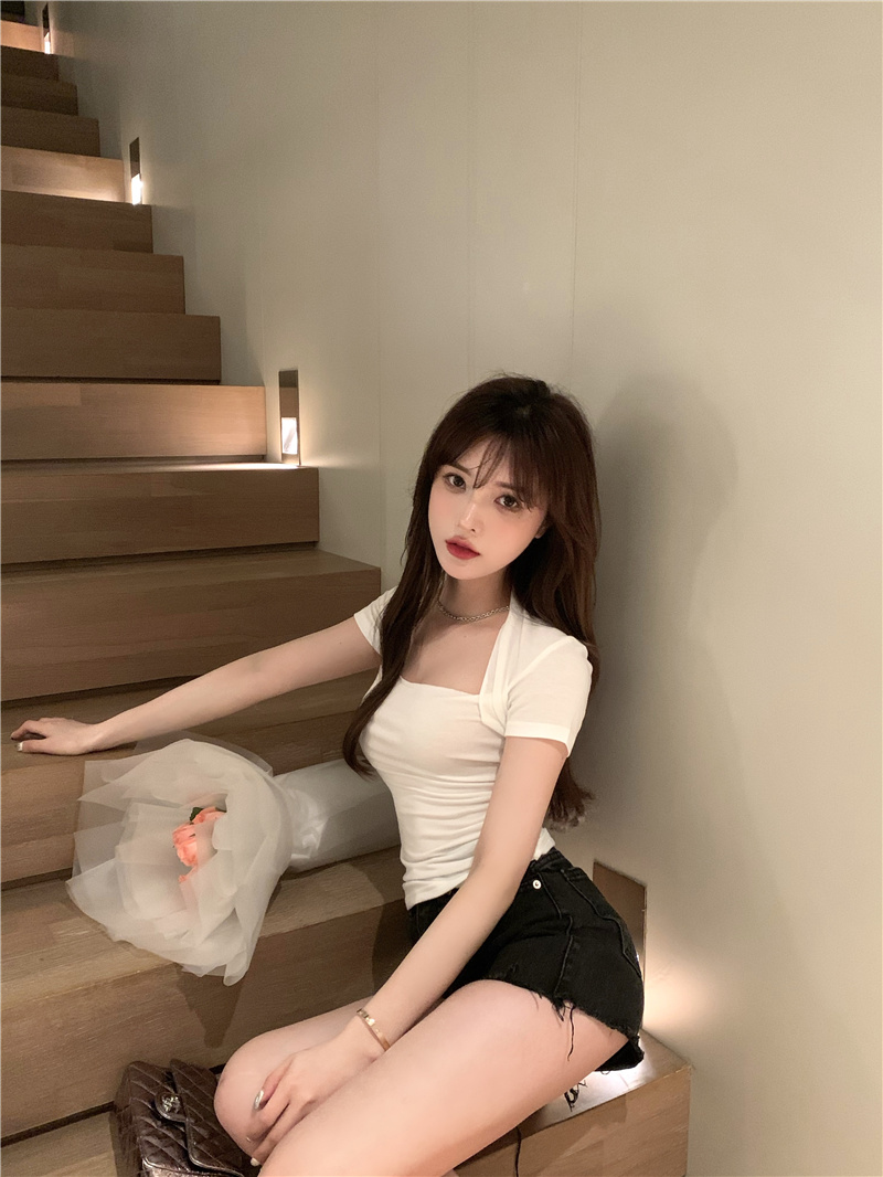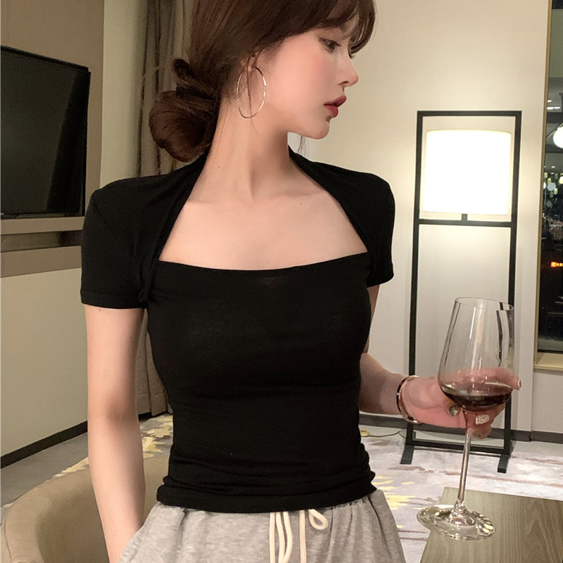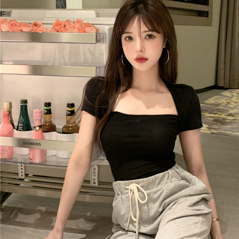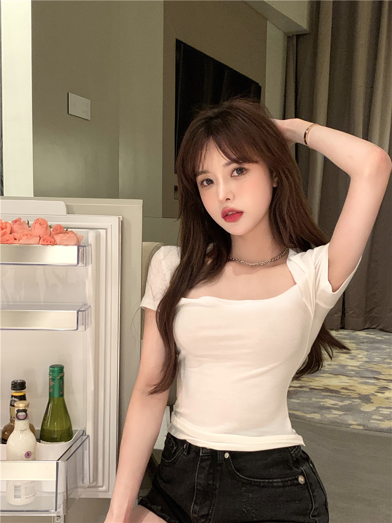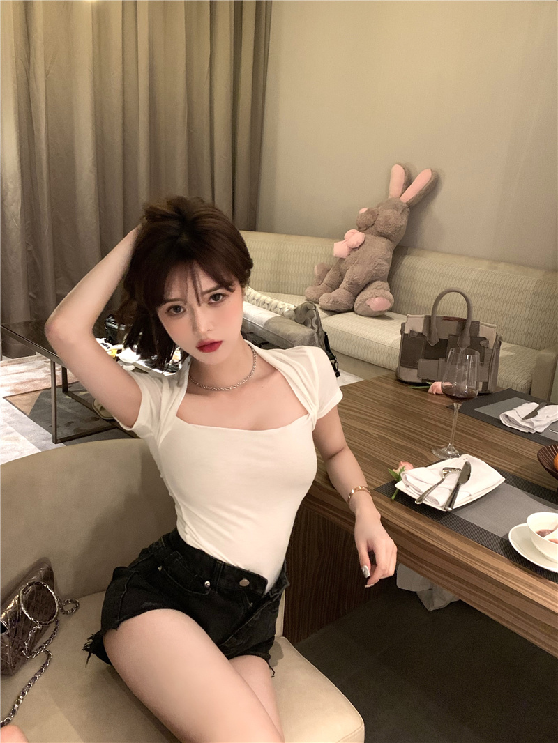 Хлопковая приятная телу летняя сексуальная дизайнерская футболка, квадратный вырез, тренд сезона