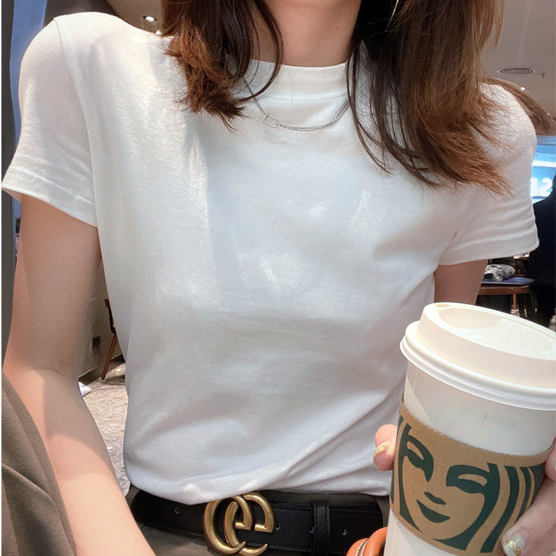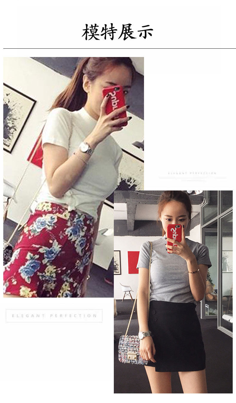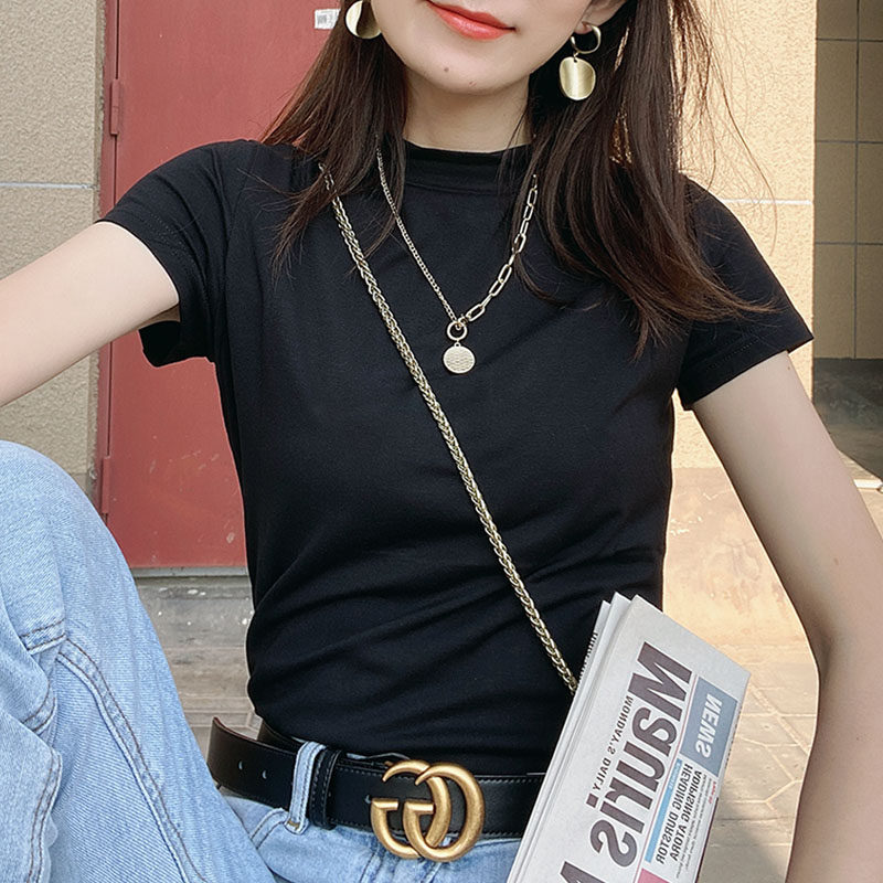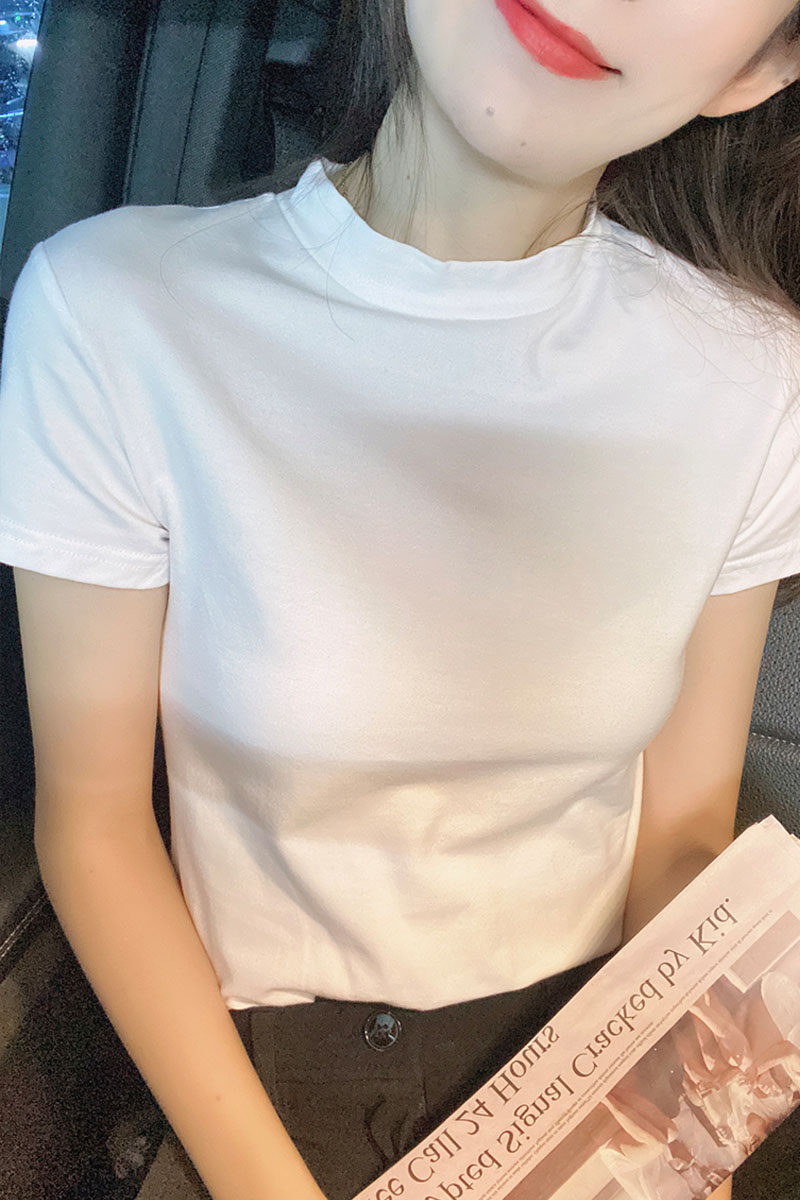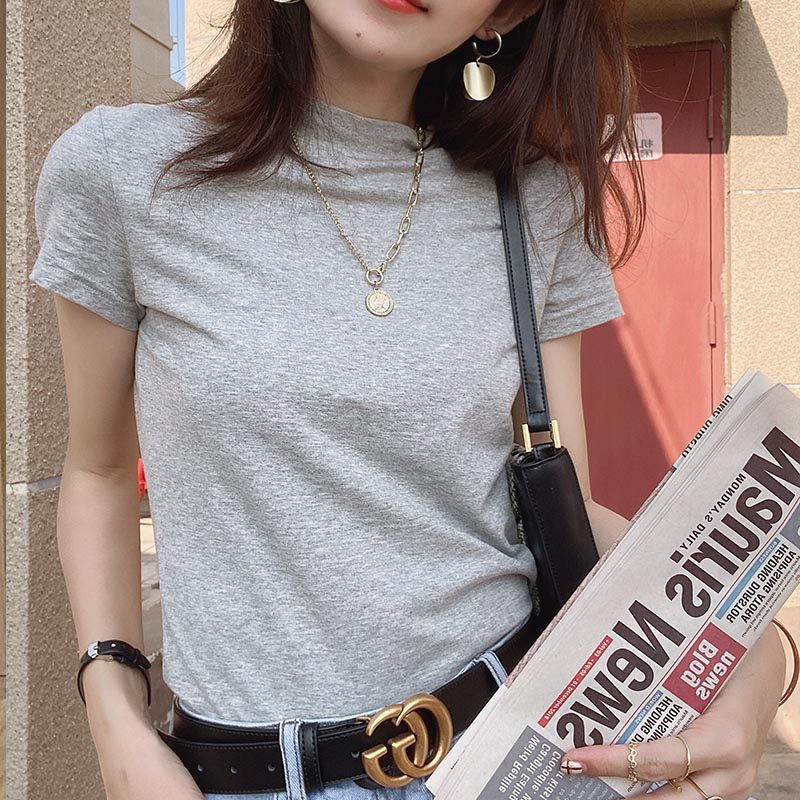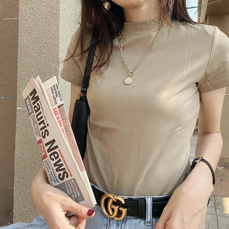 Хлопковая цветная базовая приятная телу футболка с коротким рукавом, облегающий крой, в обтяжку, высокий воротник
