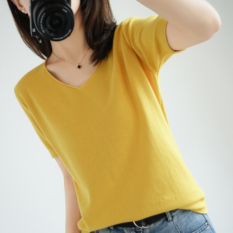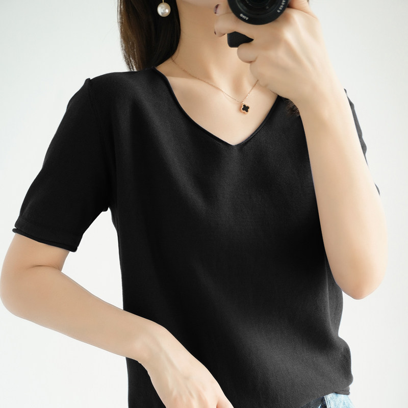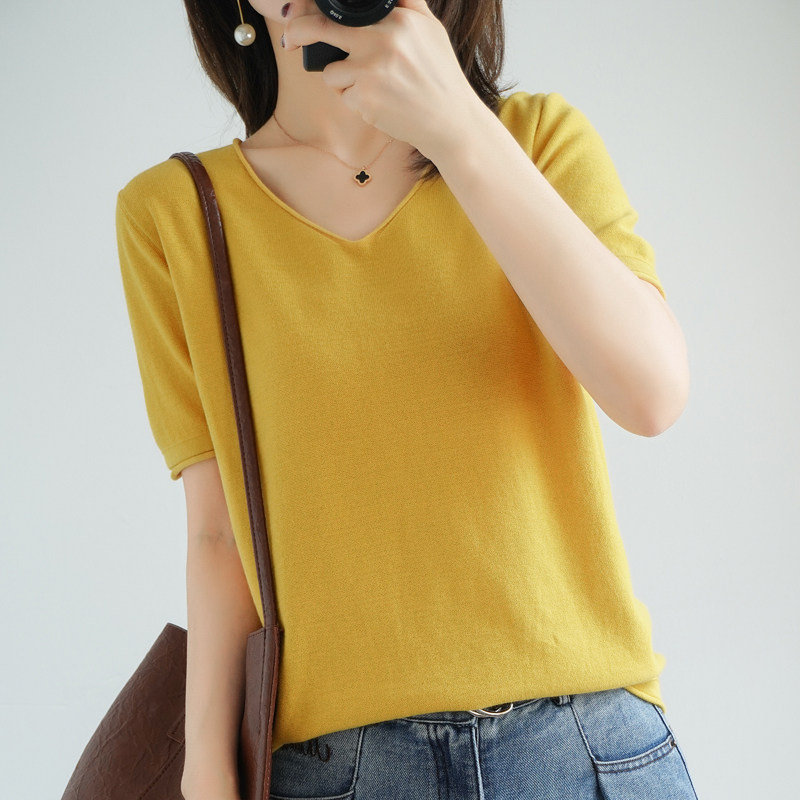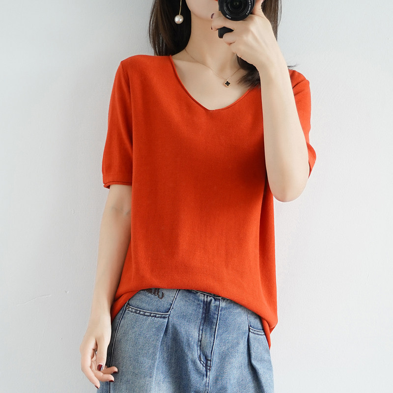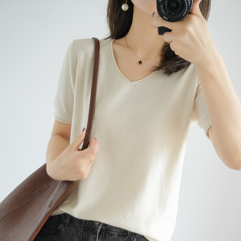 Хлопковая трикотажная летняя тонкая базовая приятная телу футболка, сезон 2021, V-образный вырез, свободный крой, из хлопка и льна