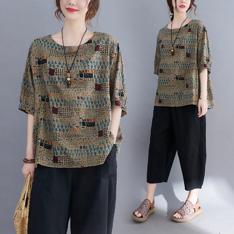 Летняя ретро этническая футболка для отдыха с круглым воротником, в западном стиле, большой размер, из хлопка и льна, оверсайз, этнический стиль