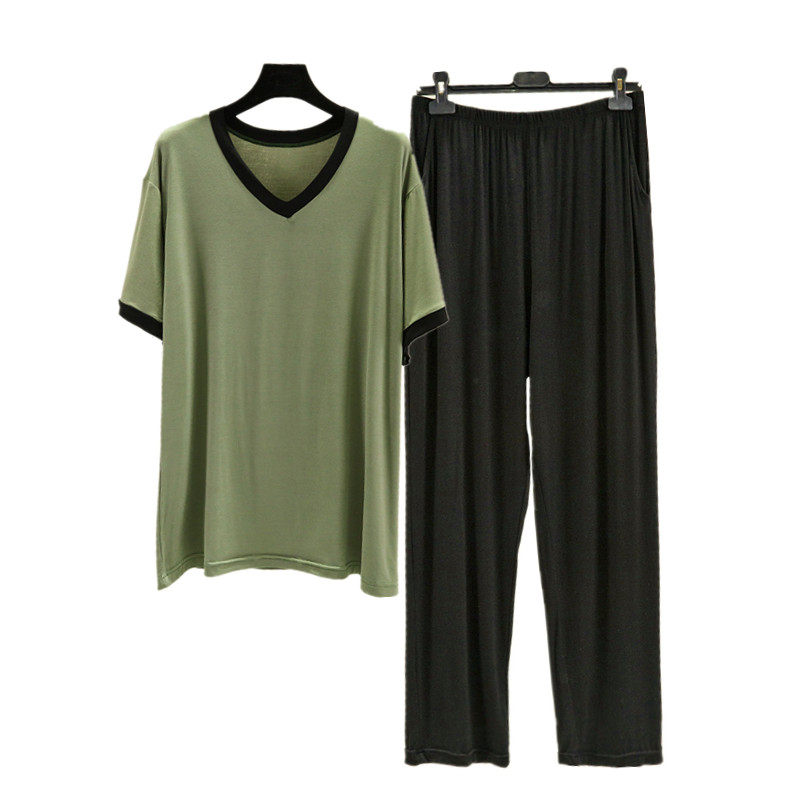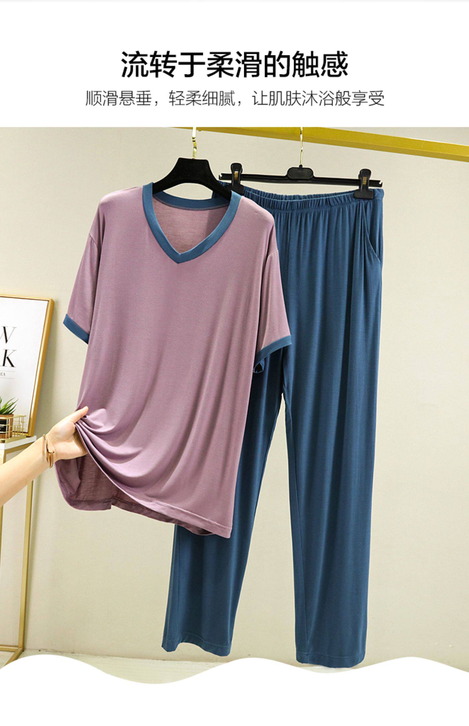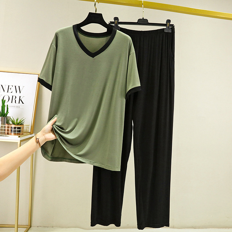 Футболка, штаны, тонкая пижама, комплект, V-образный вырез, большой размер, свободный крой