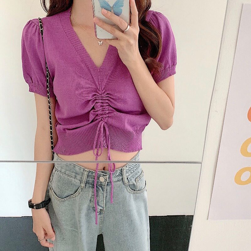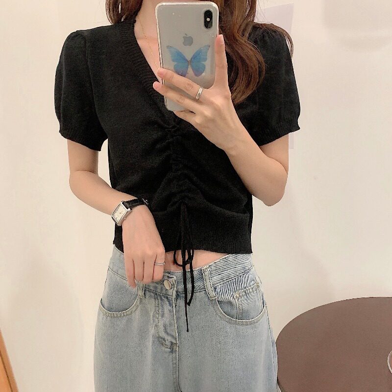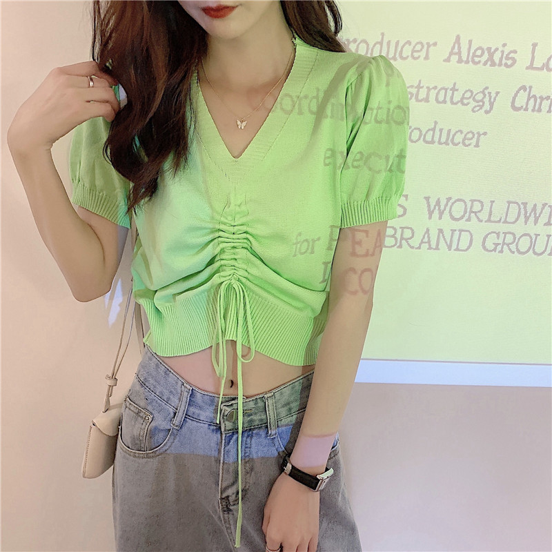 Летний дизайнерский трикотажный шелковый свитер, тонкая футболка с коротким рукавом, высокая талия, тренд сезона, облегающий крой, V-образный вырез