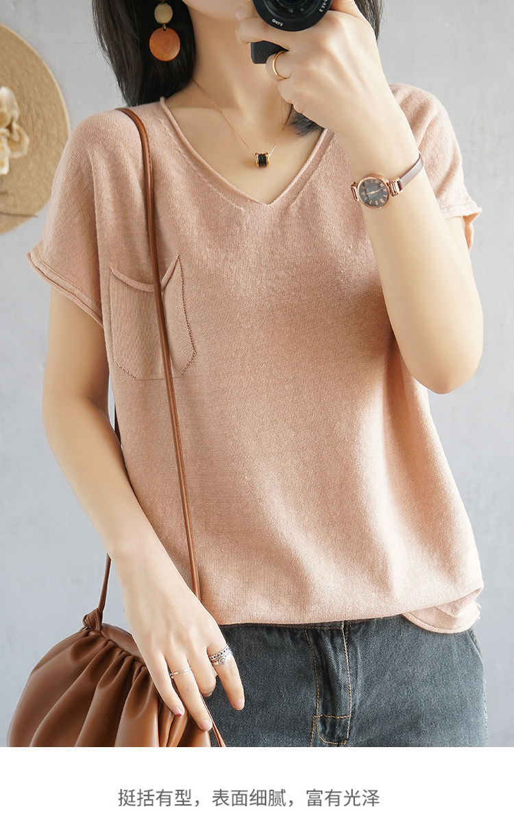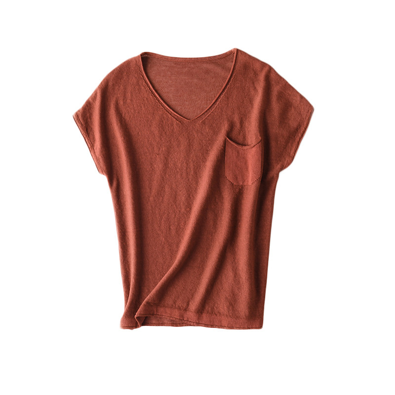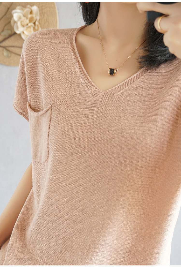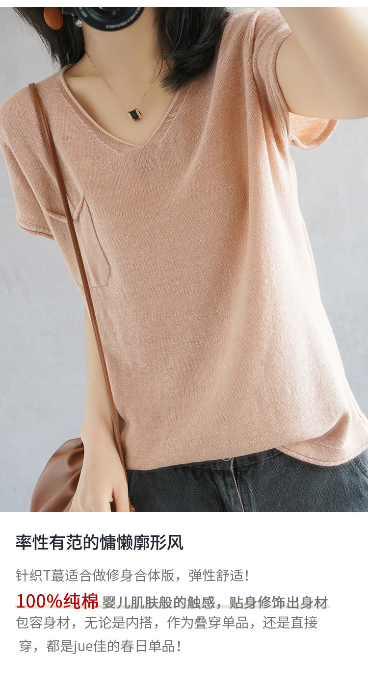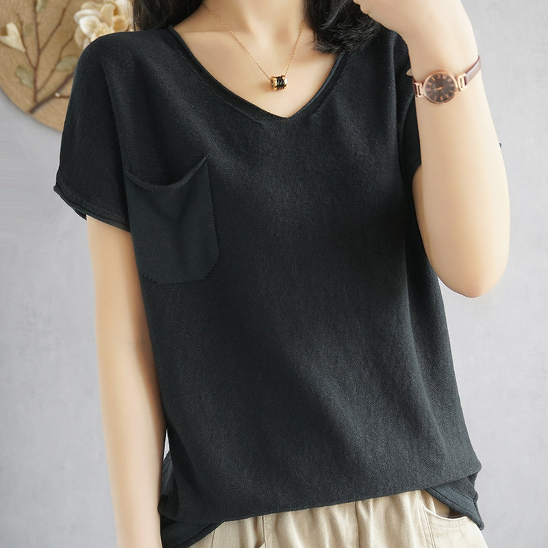 Тонкая хлопковая трикотажная футболка с коротким рукавом, майка топ, V-образный вырез, свободный крой, из хлопка и льна