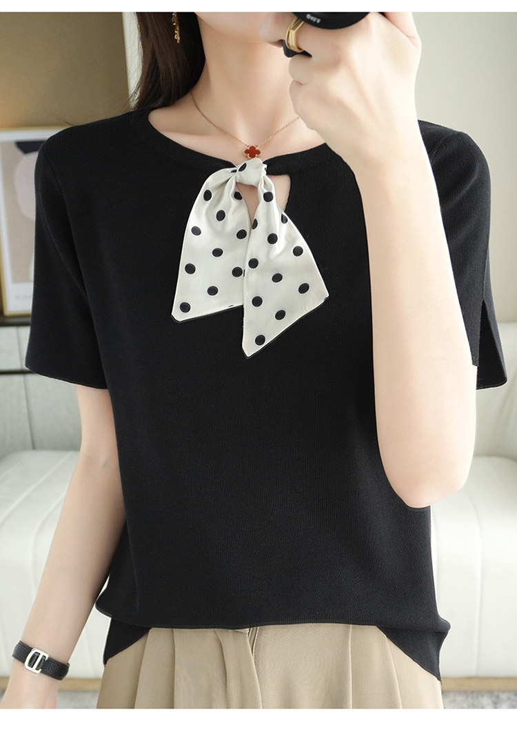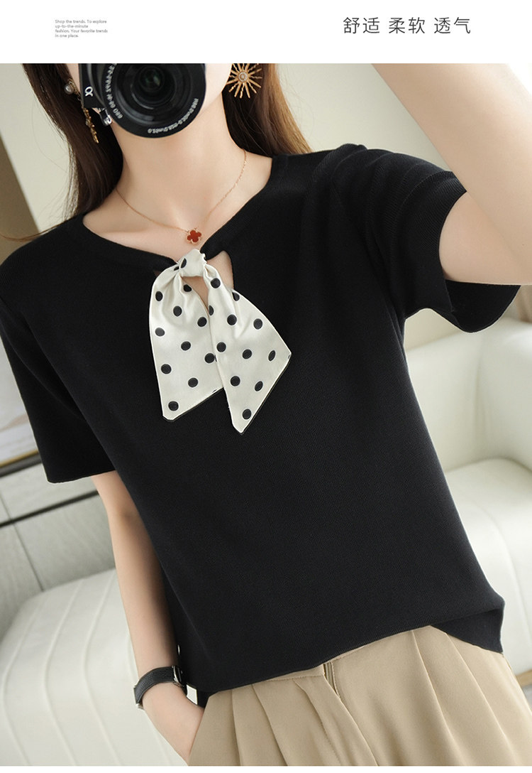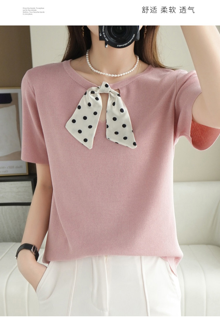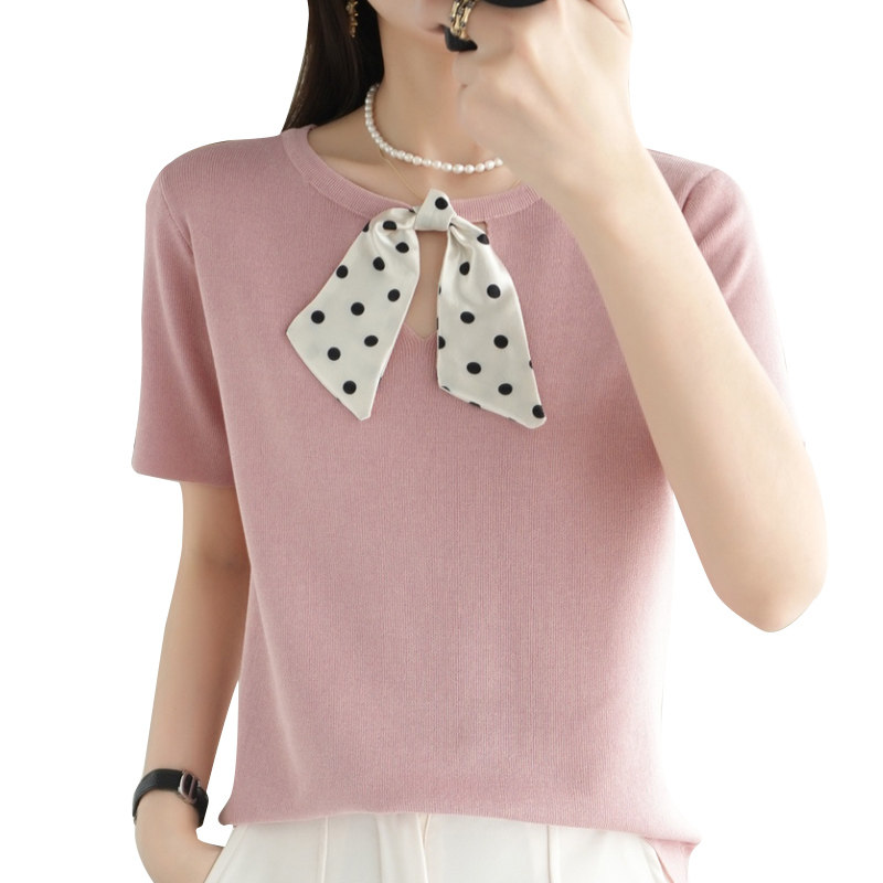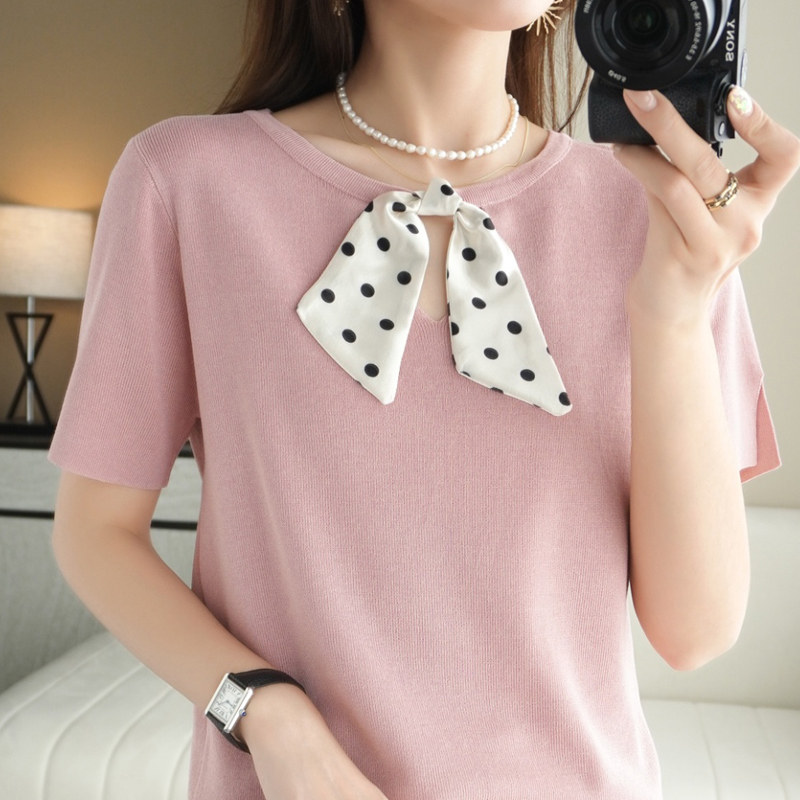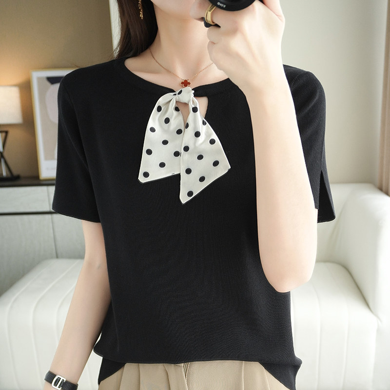 Трикотажная футболка с коротким рукавом с круглым воротником с бантиком, базовая короткая рубашка