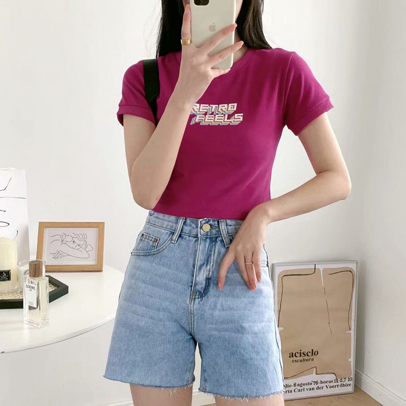 Брендовая летняя футболка с коротким рукавом, короткий универсальный ростомер, в корейском стиле, высокая талия