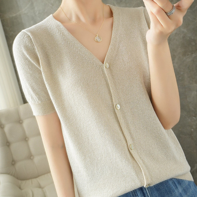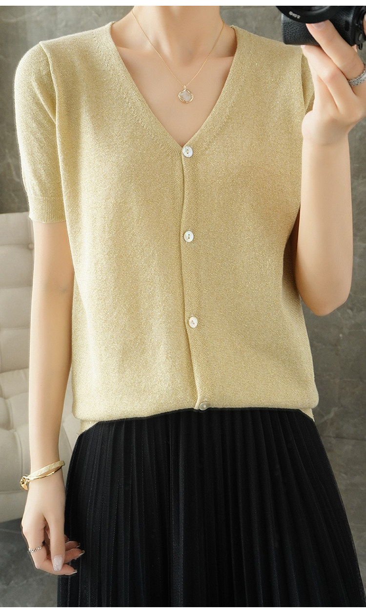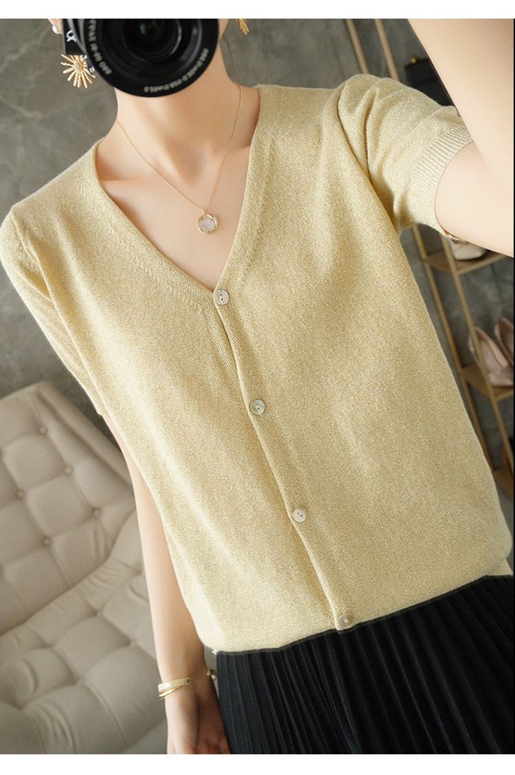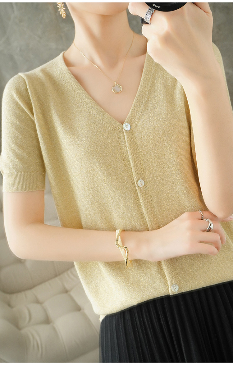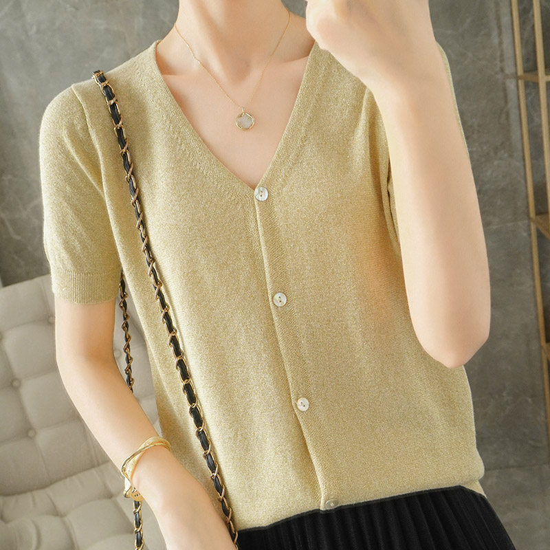 Тонкая золотая футболка, трикотажный шелковый короткий кардиган, сезон 2021, V-образный вырез, короткий рукав