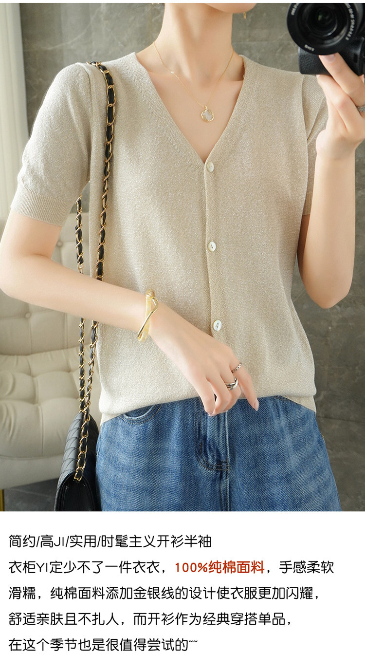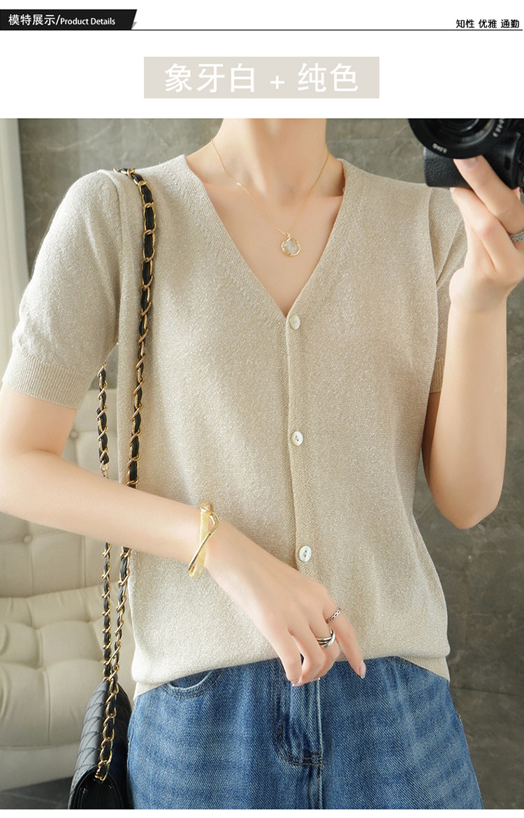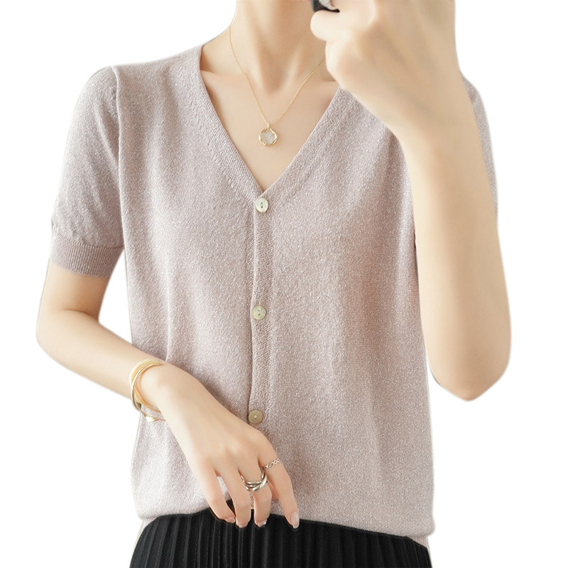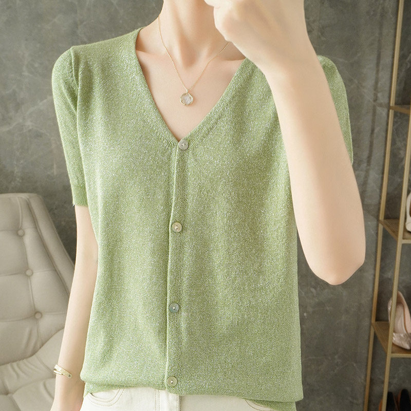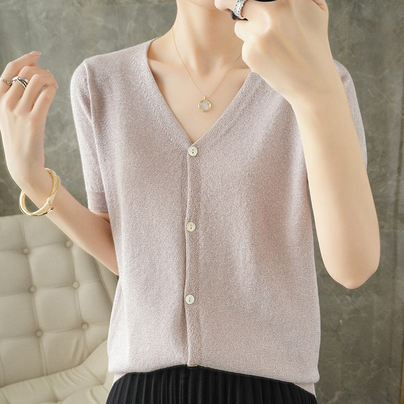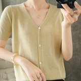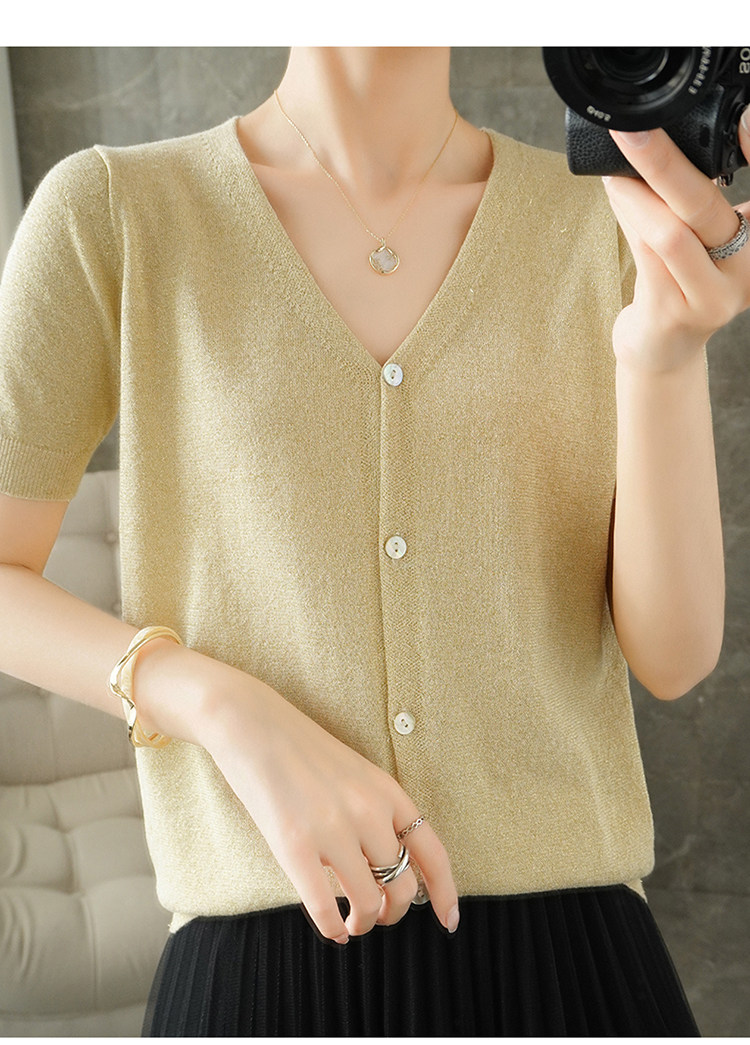 Тонкая золотая футболка, трикотажный шелковый короткий кардиган, сезон 2021, V-образный вырез, короткий рукав