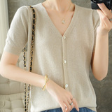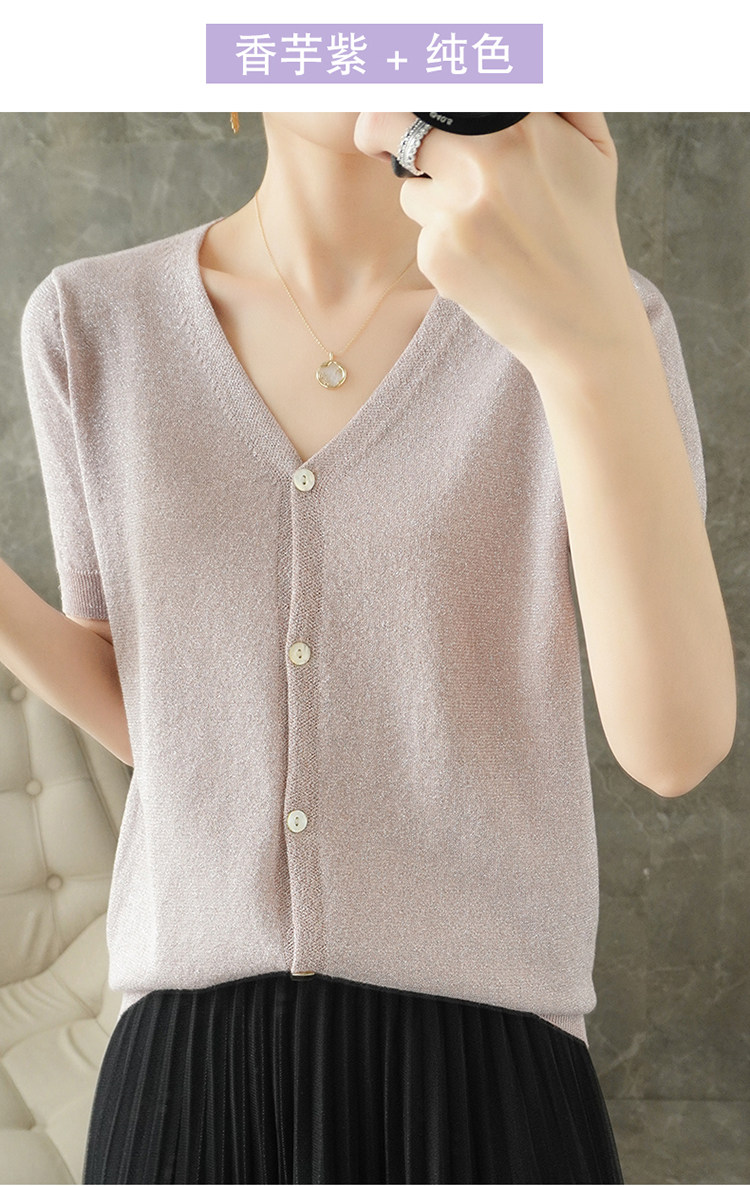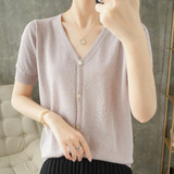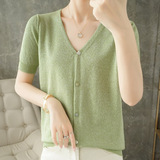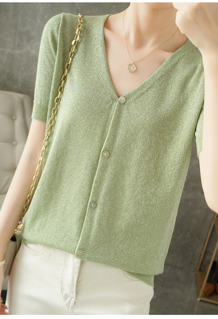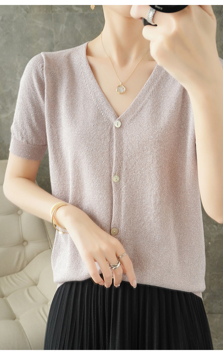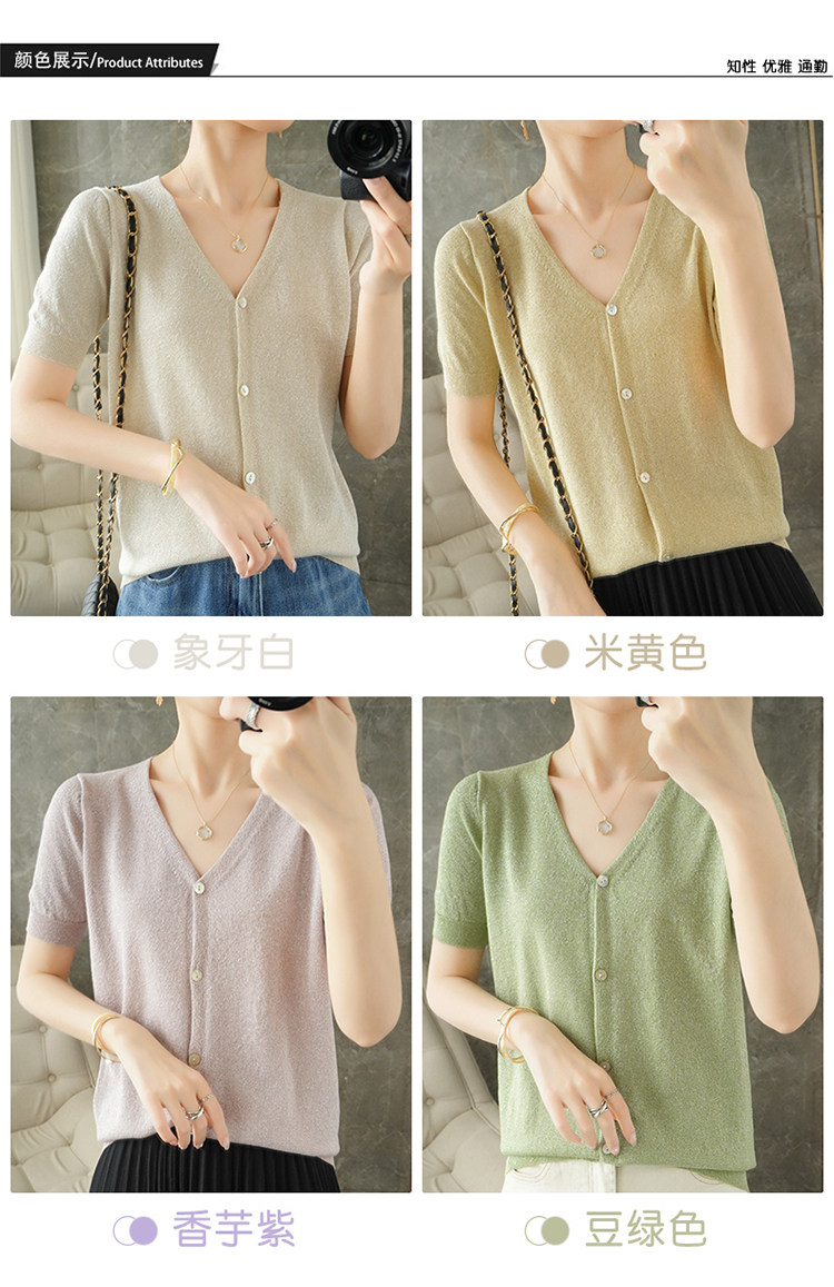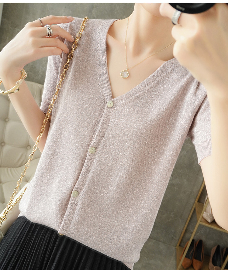 Тонкая золотая футболка, трикотажный шелковый короткий кардиган, сезон 2021, V-образный вырез, короткий рукав