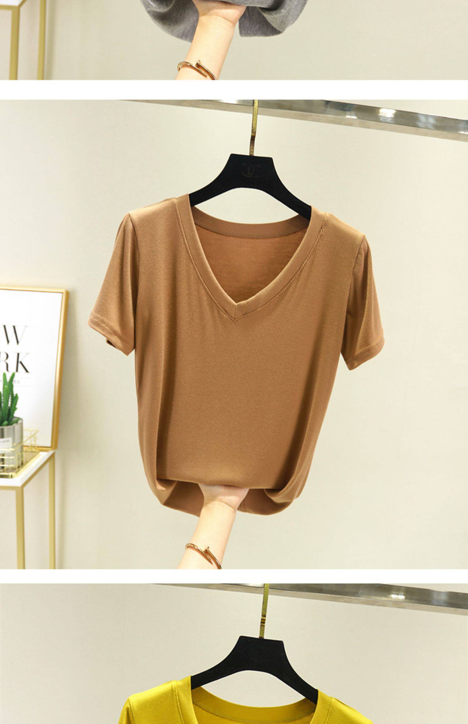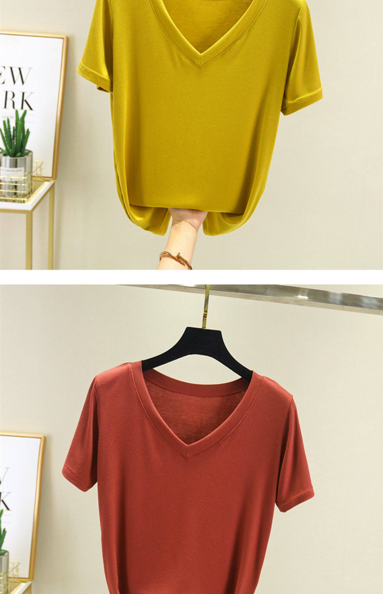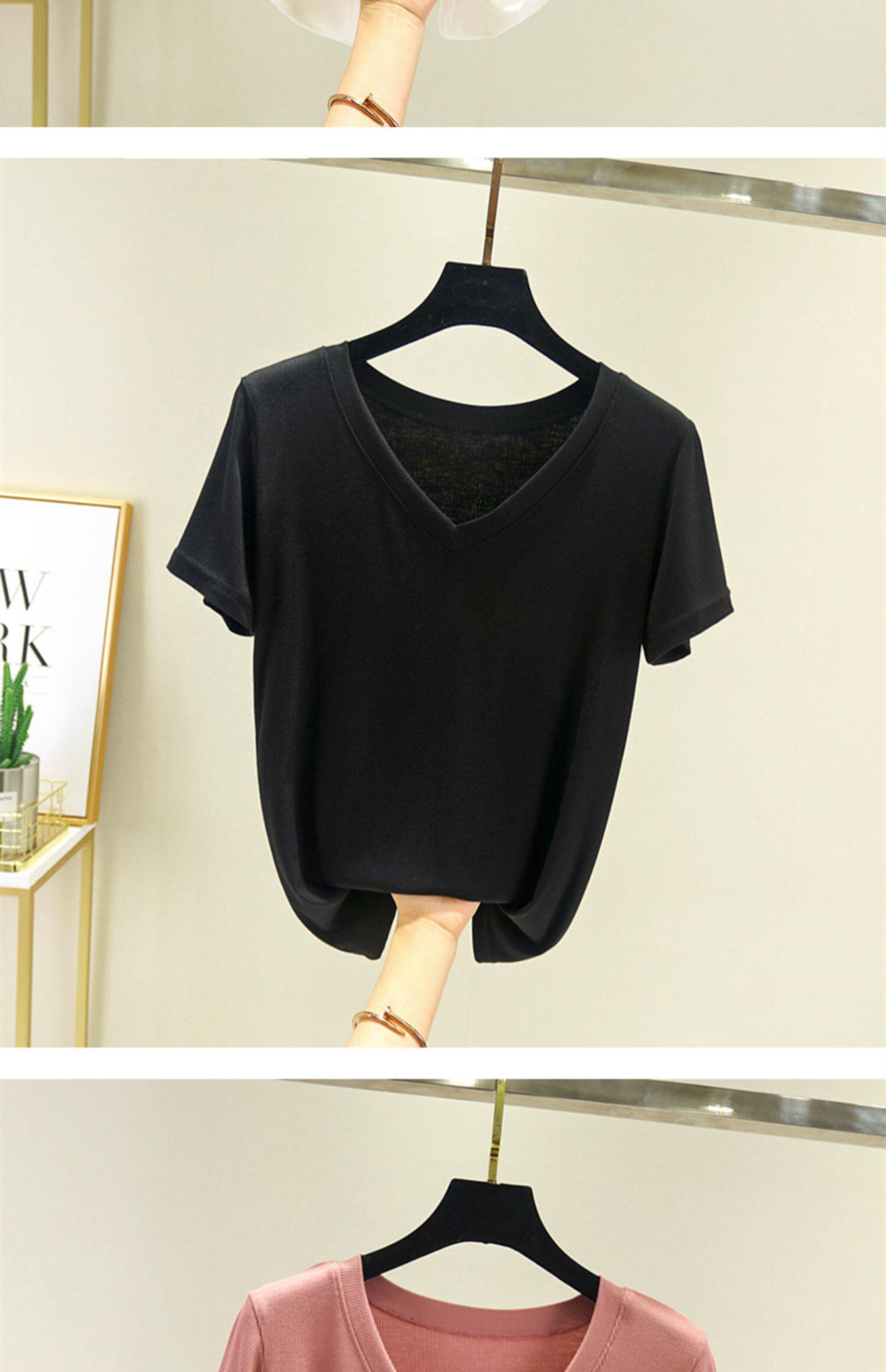 Летняя тонкая базовая приятная телу футболка с коротким рукавом, коллекция 2023, V-образный вырез, свободный крой