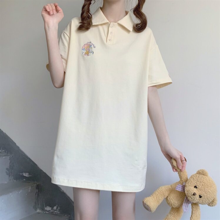 Летняя японская милая длинная футболка, воротник поло, с медвежатами, свободный крой, средней длины