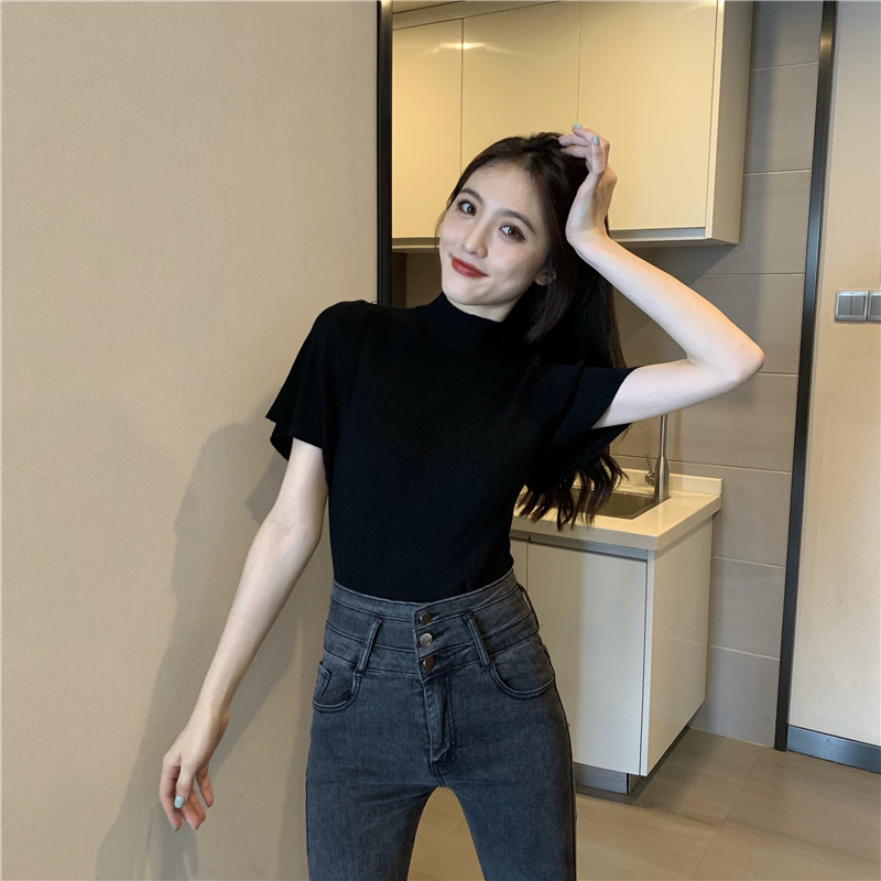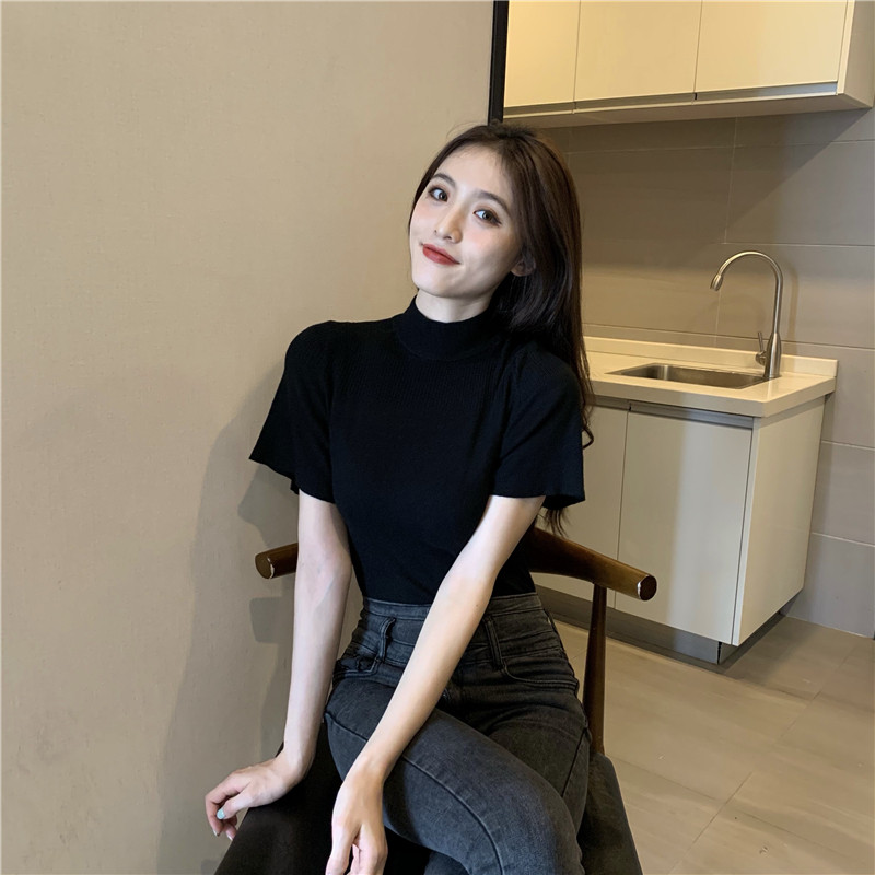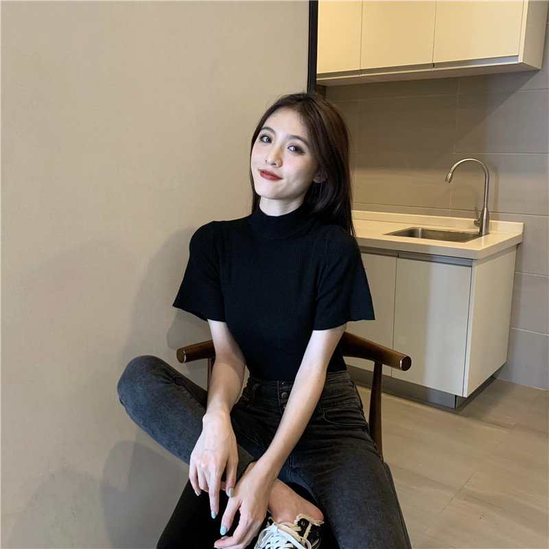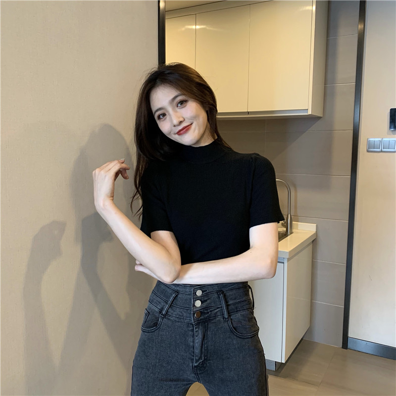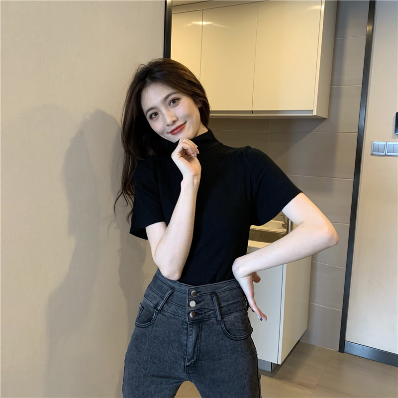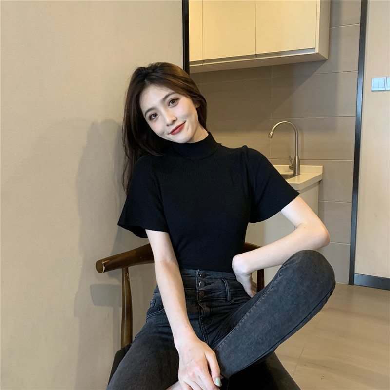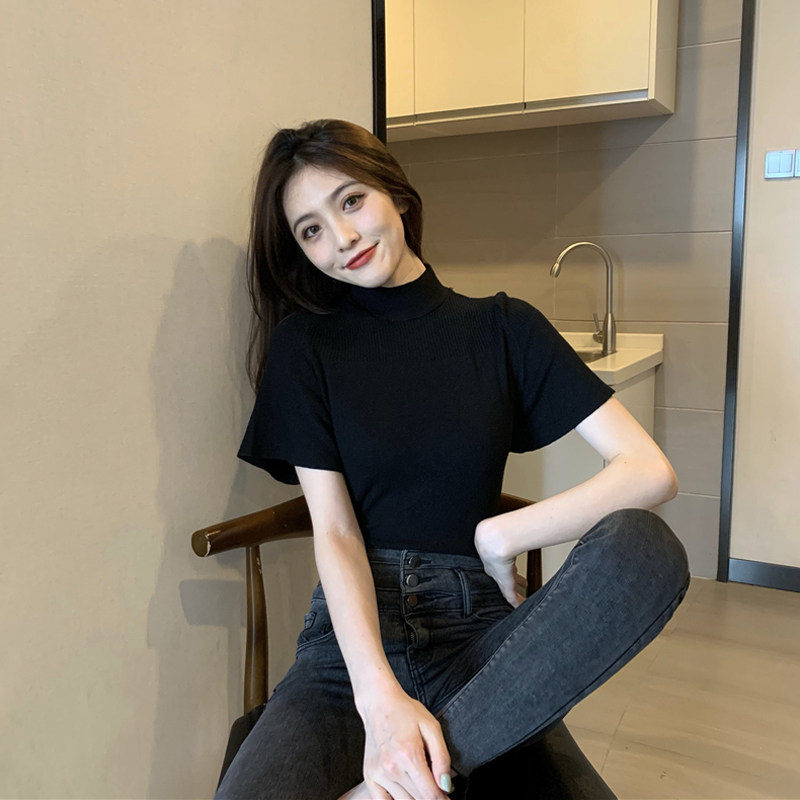 Трикотажная тонкая летняя приталенная черная короткая футболка, высокий воротник, короткий рукав, 2025 года