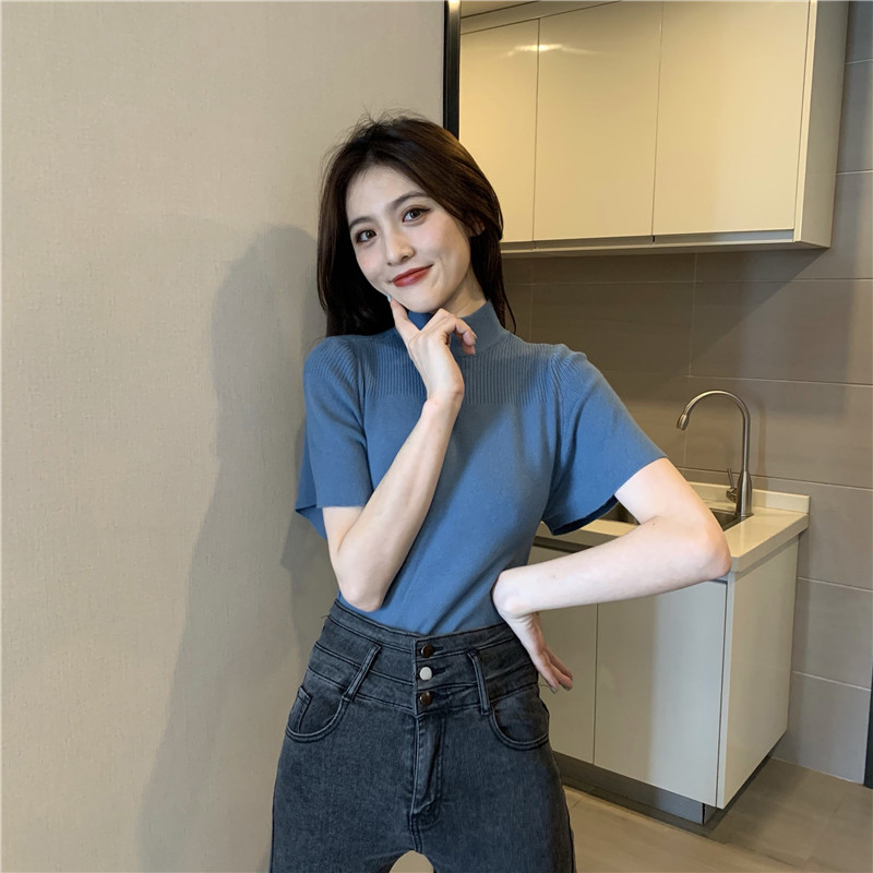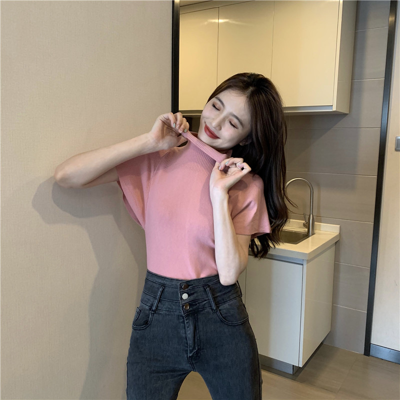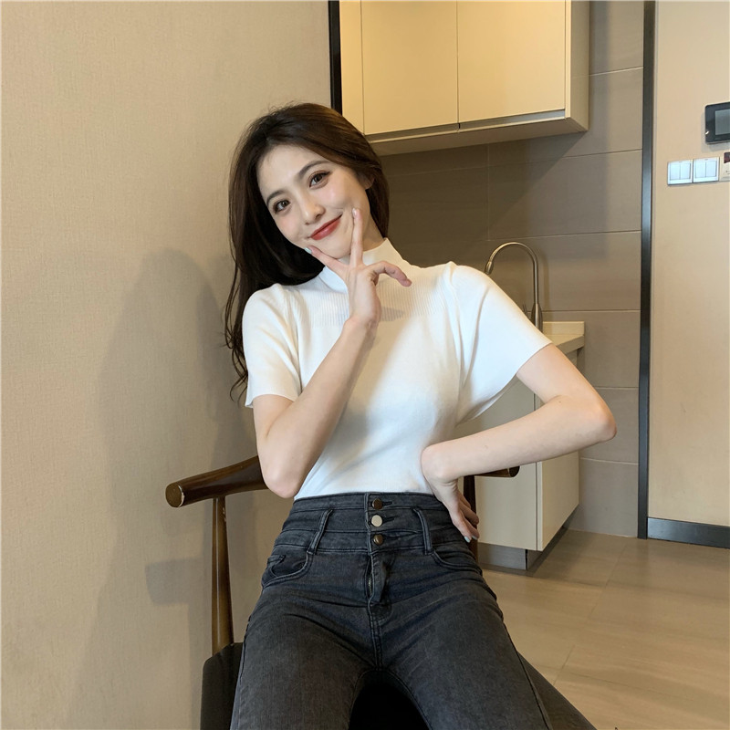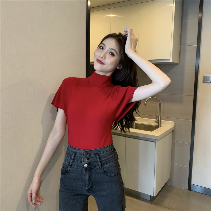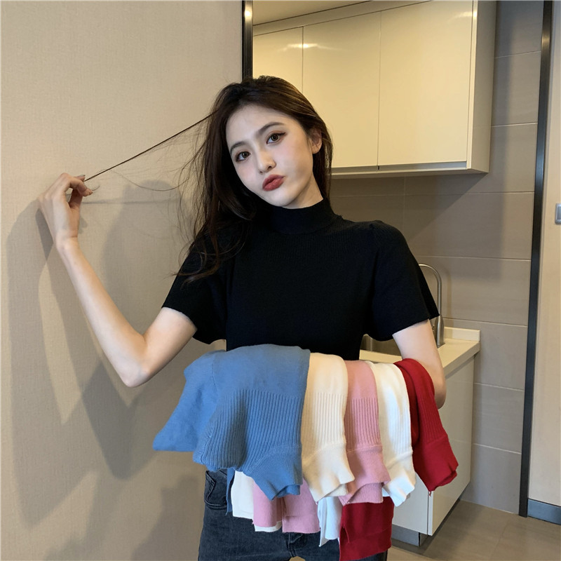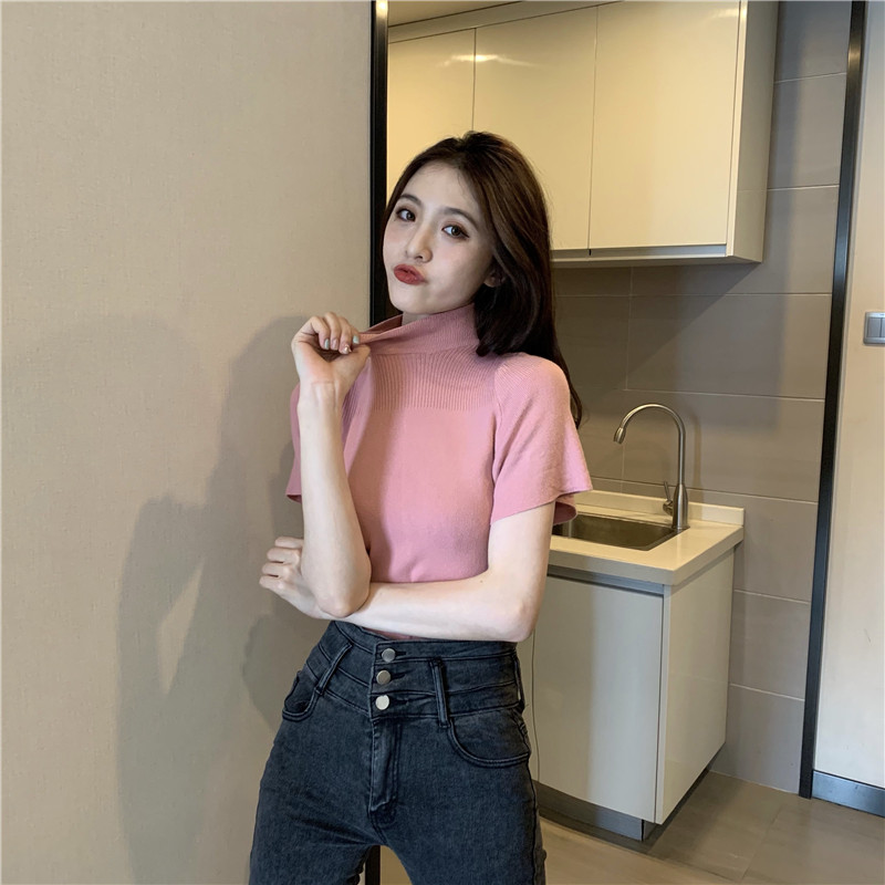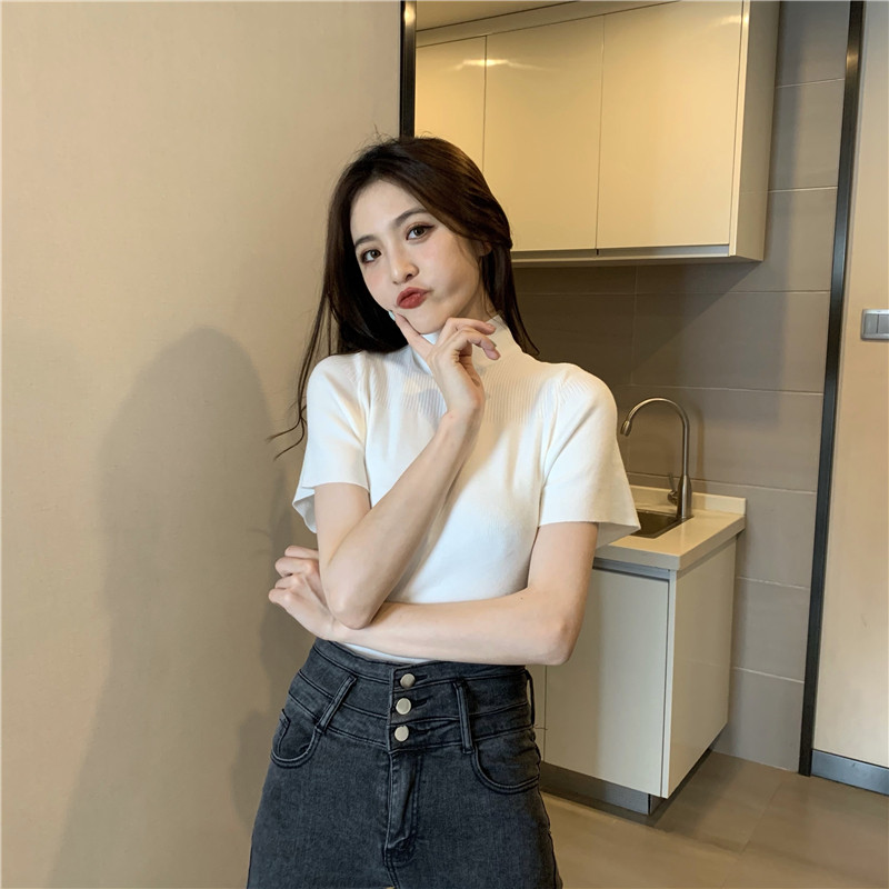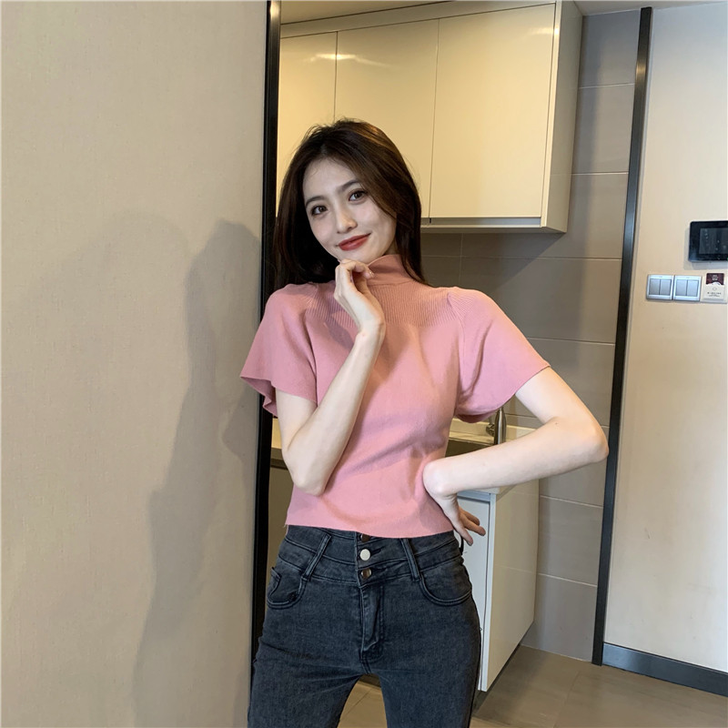 Трикотажная тонкая летняя приталенная черная короткая футболка, высокий воротник, короткий рукав, 2025 года