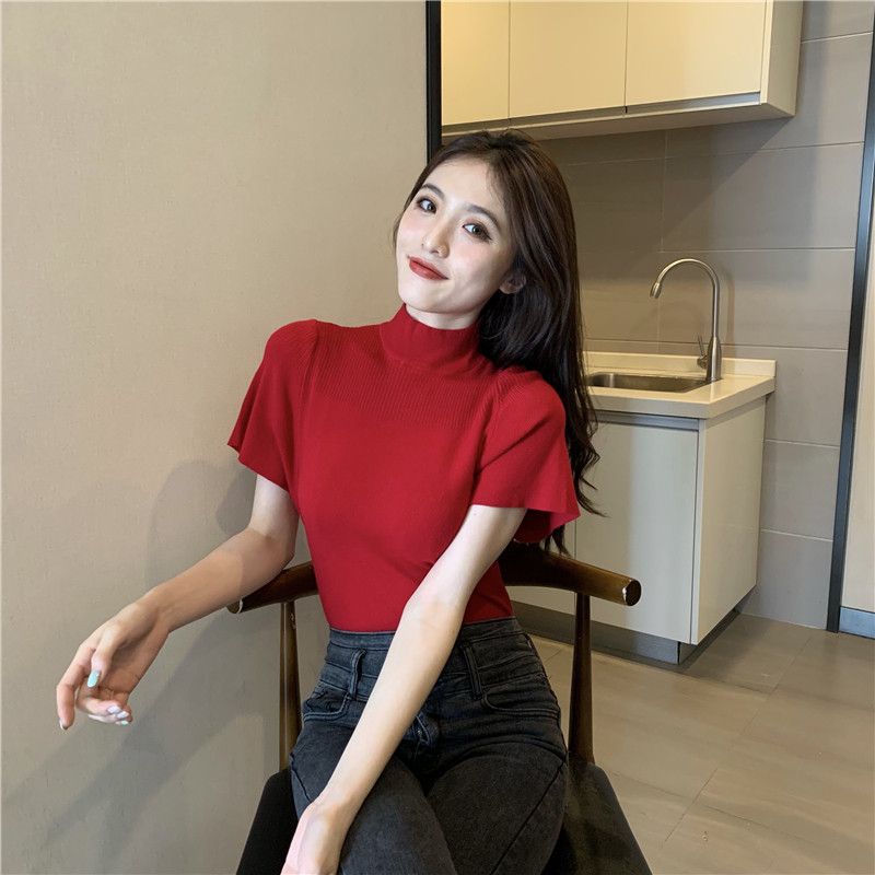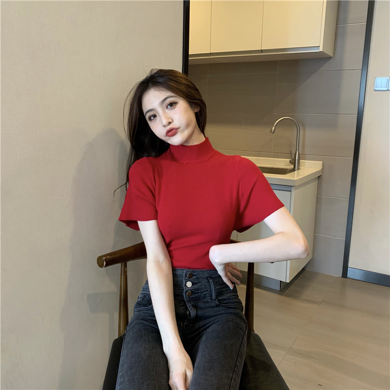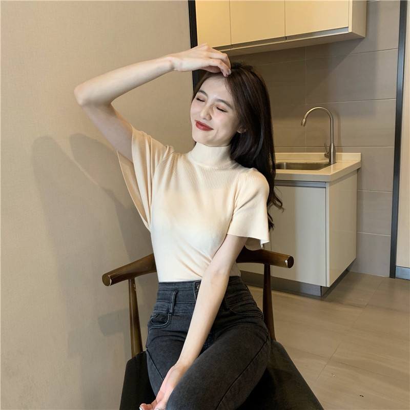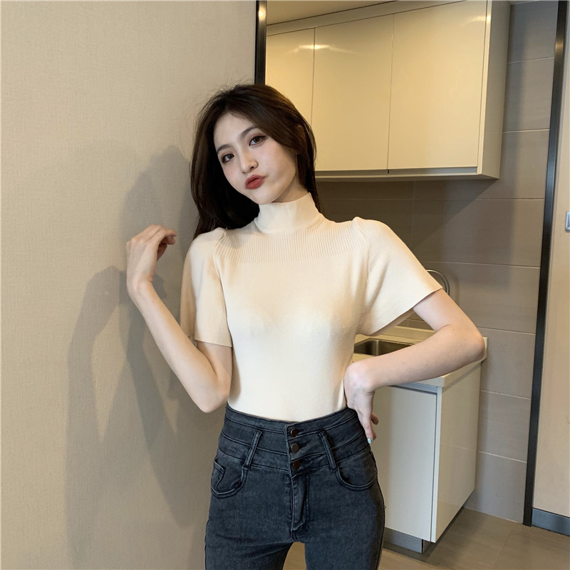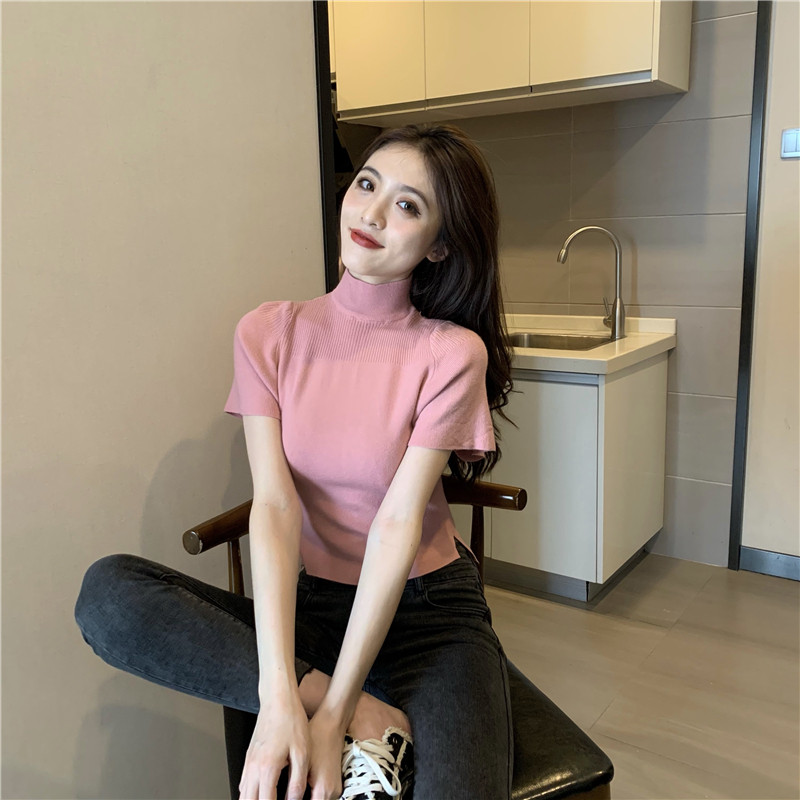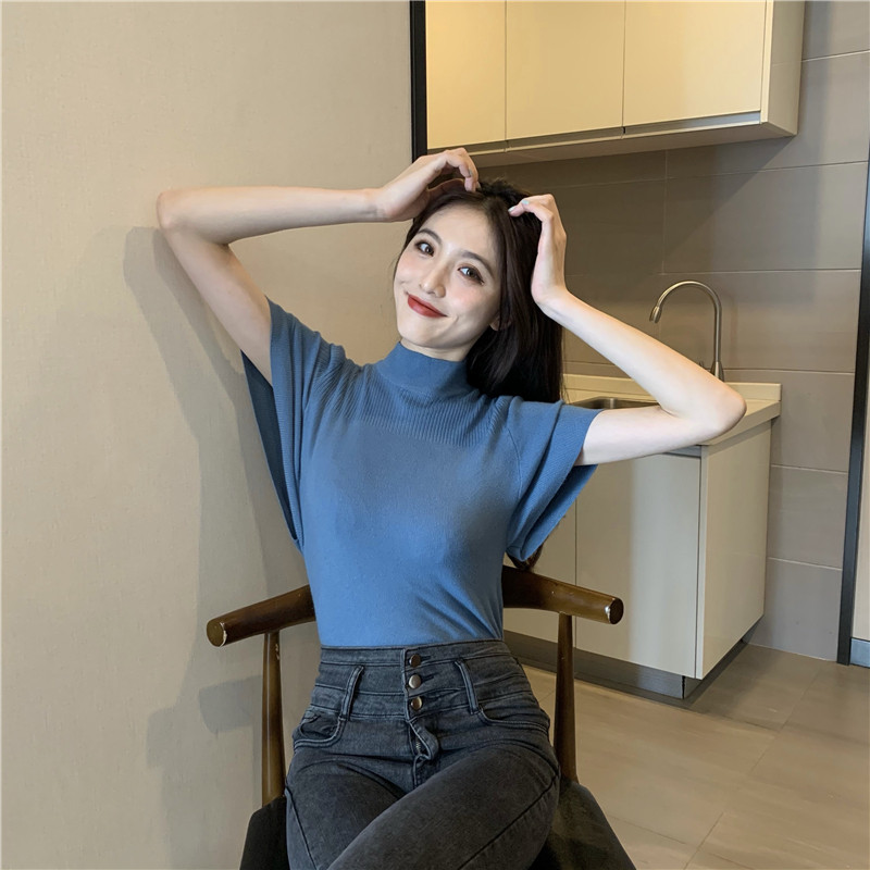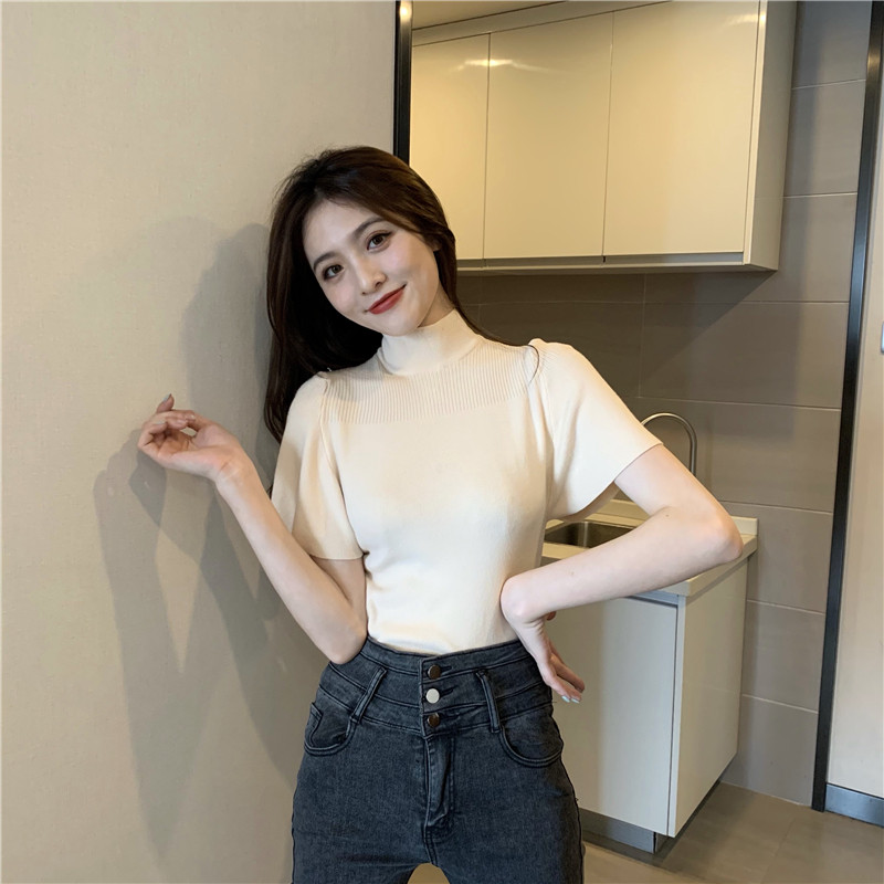 Трикотажная тонкая летняя приталенная черная короткая футболка, высокий воротник, короткий рукав, 2025 года