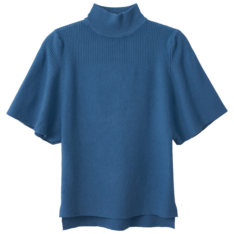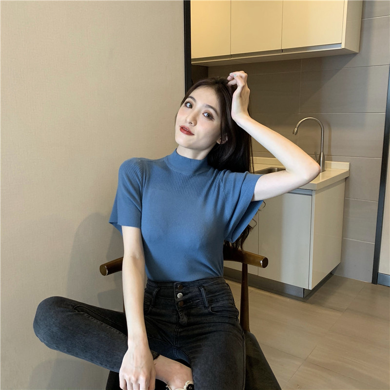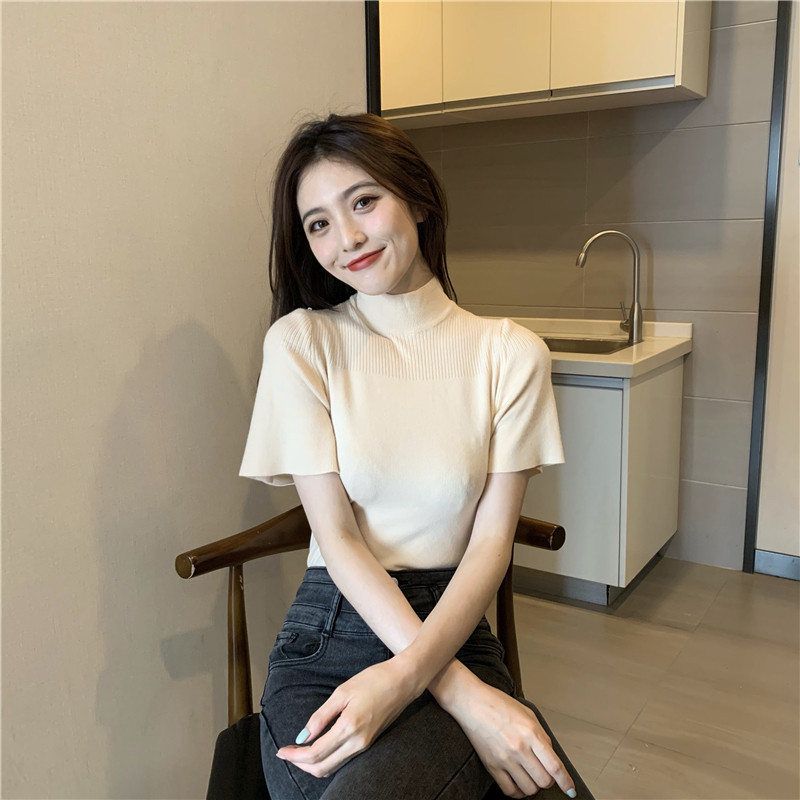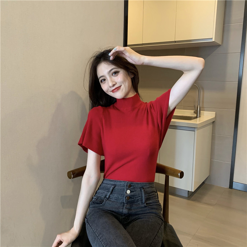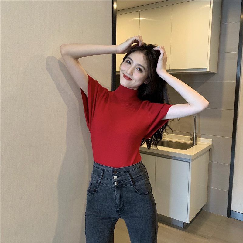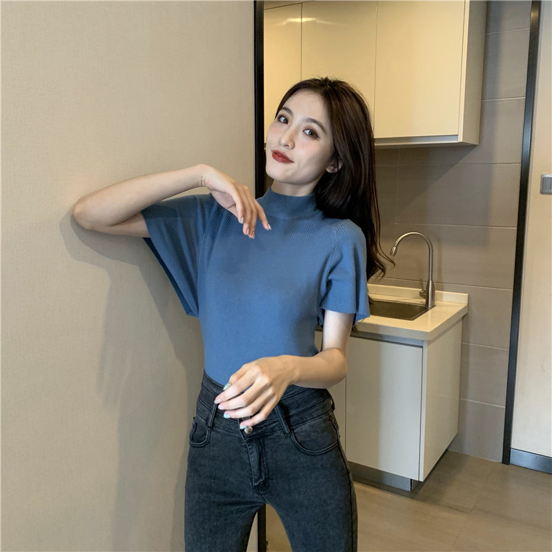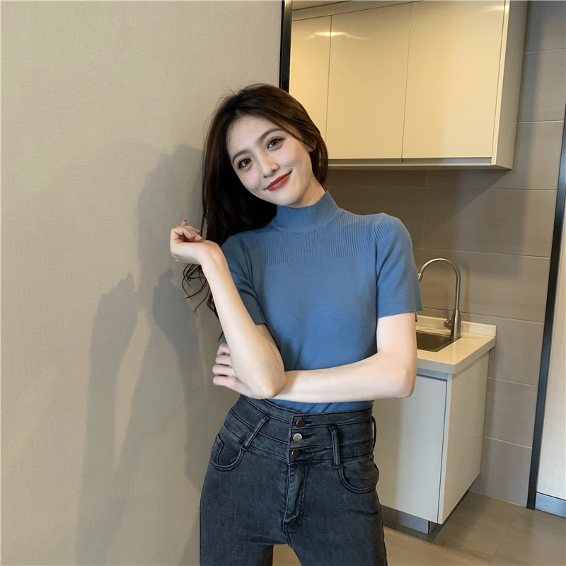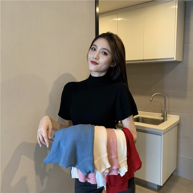 Трикотажная тонкая летняя приталенная черная короткая футболка, высокий воротник, короткий рукав, 2025 года