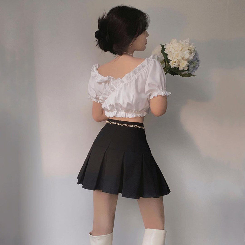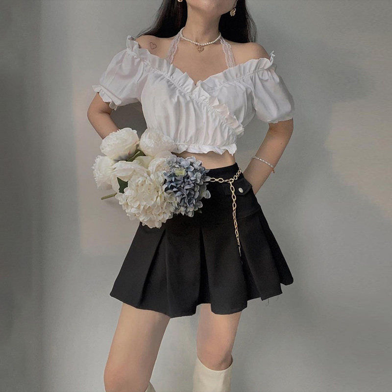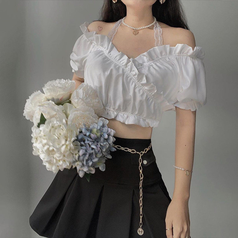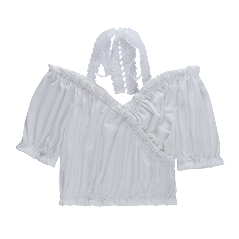 Кружевная белая небольшая дизайнерская рубашка, открытые плечи, короткий рукав