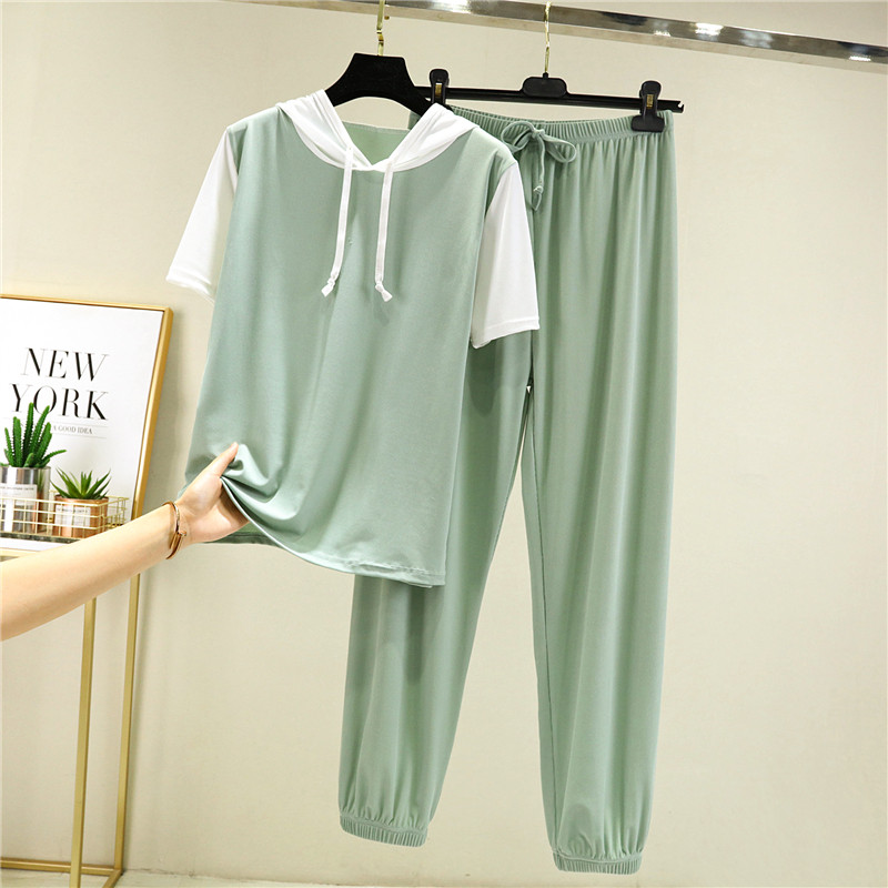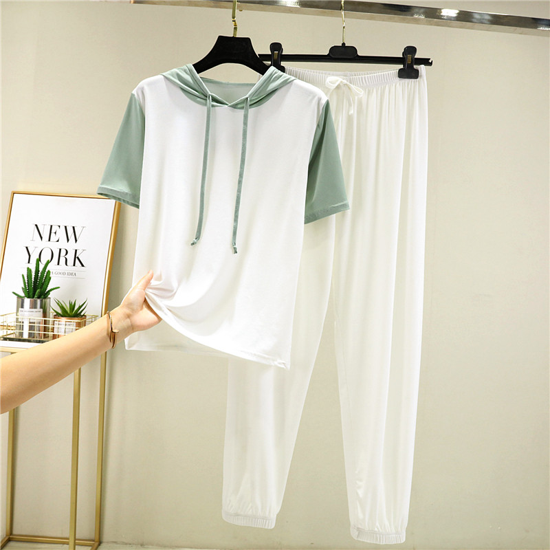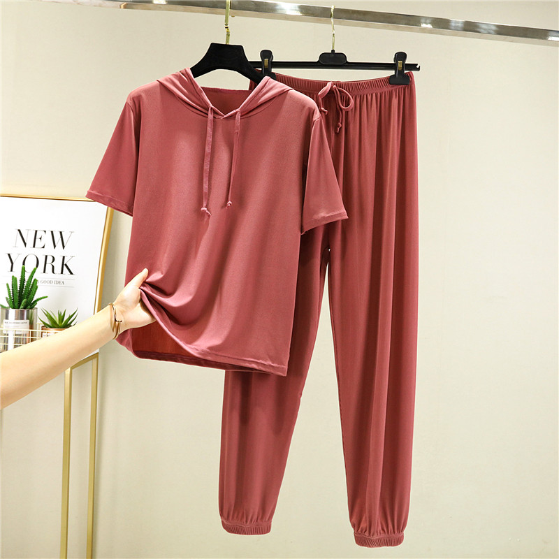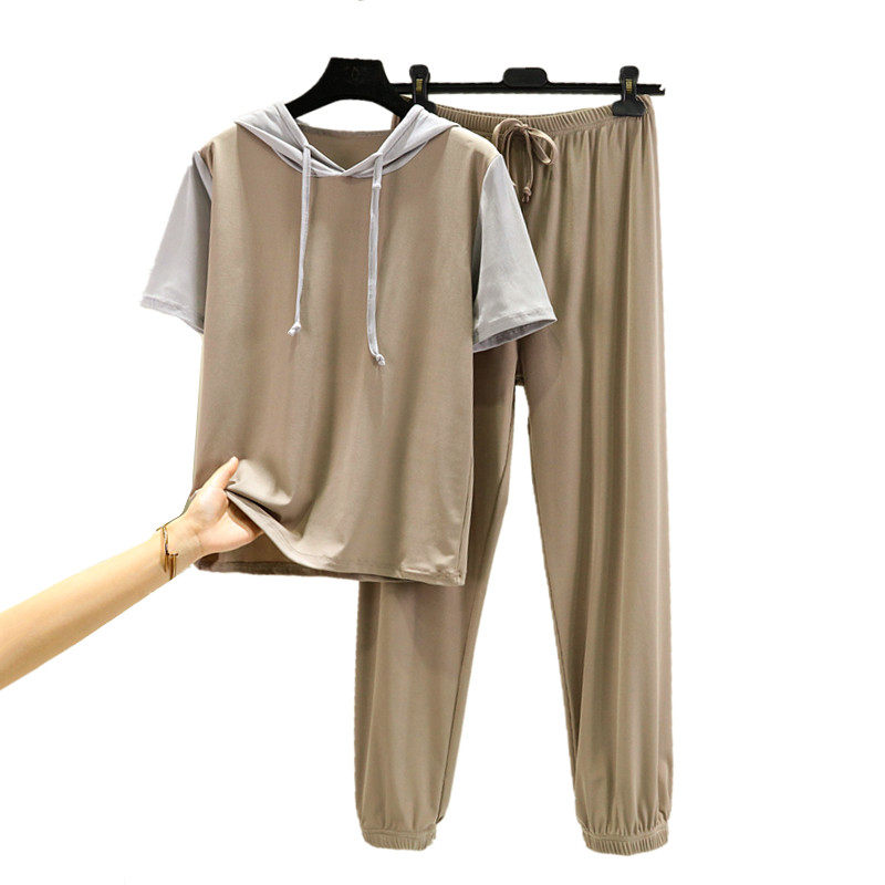 Комплект, тонкая шелковая летняя одежда, футболка с капюшоном, модные штаны, короткий рукав, свободный крой