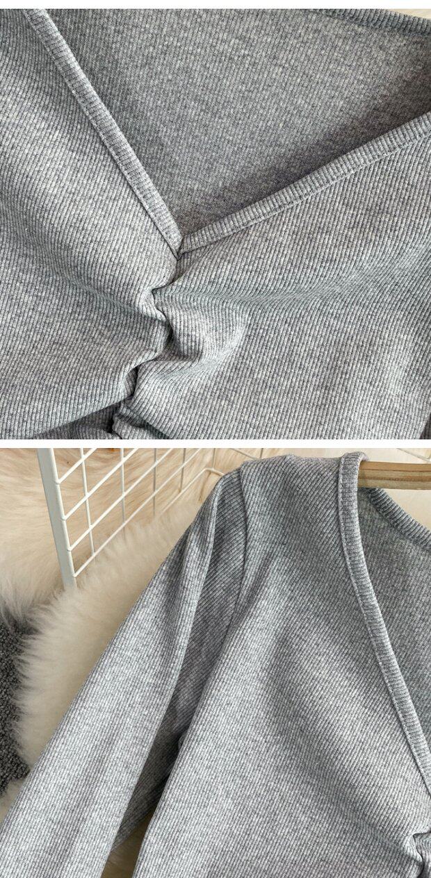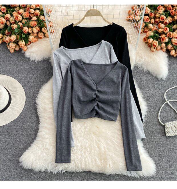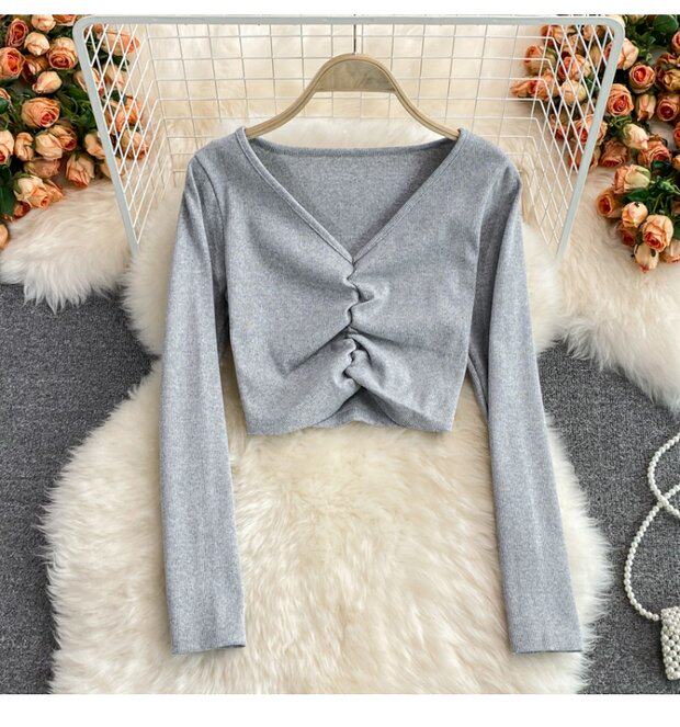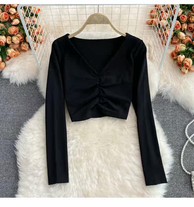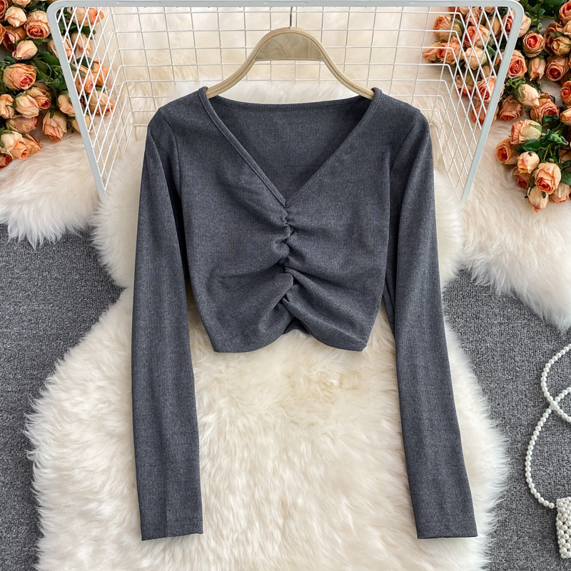Осенний брендовый эластичный лонгслив, короткая базовая футболка, европейский стиль, V-образный вырез, в обтяжку, высокая талия