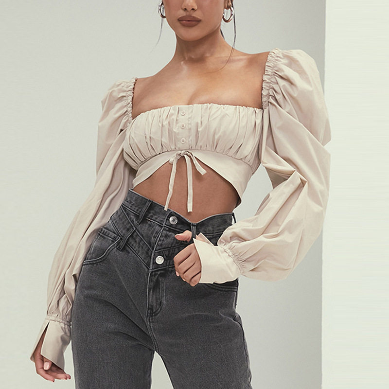 Ретро короткий лонгслив, брендовый фонарь, рубашка, французский стиль, квадратный вырез, рукава фонарики