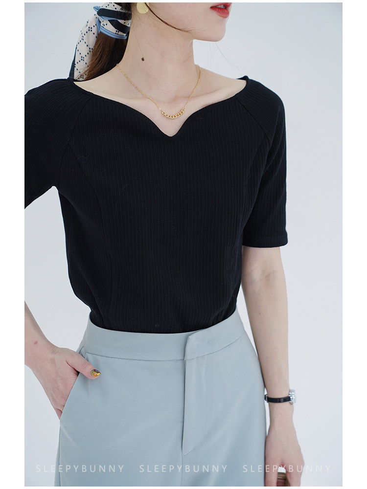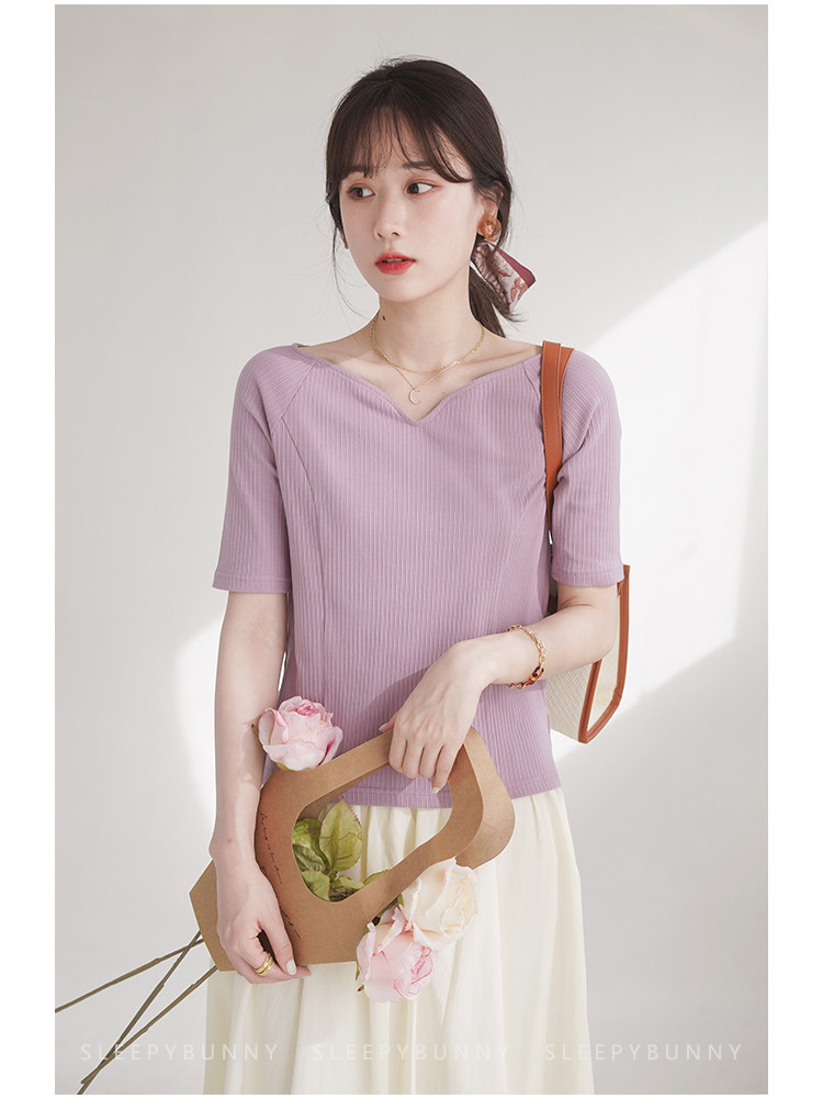 Sleepy Rabbit раскрывает ключицу, воротник в одну линию, утягивает фигуру, вертикальные полосы, белая женская футболка, летний дизайнерский нишевый топ.
