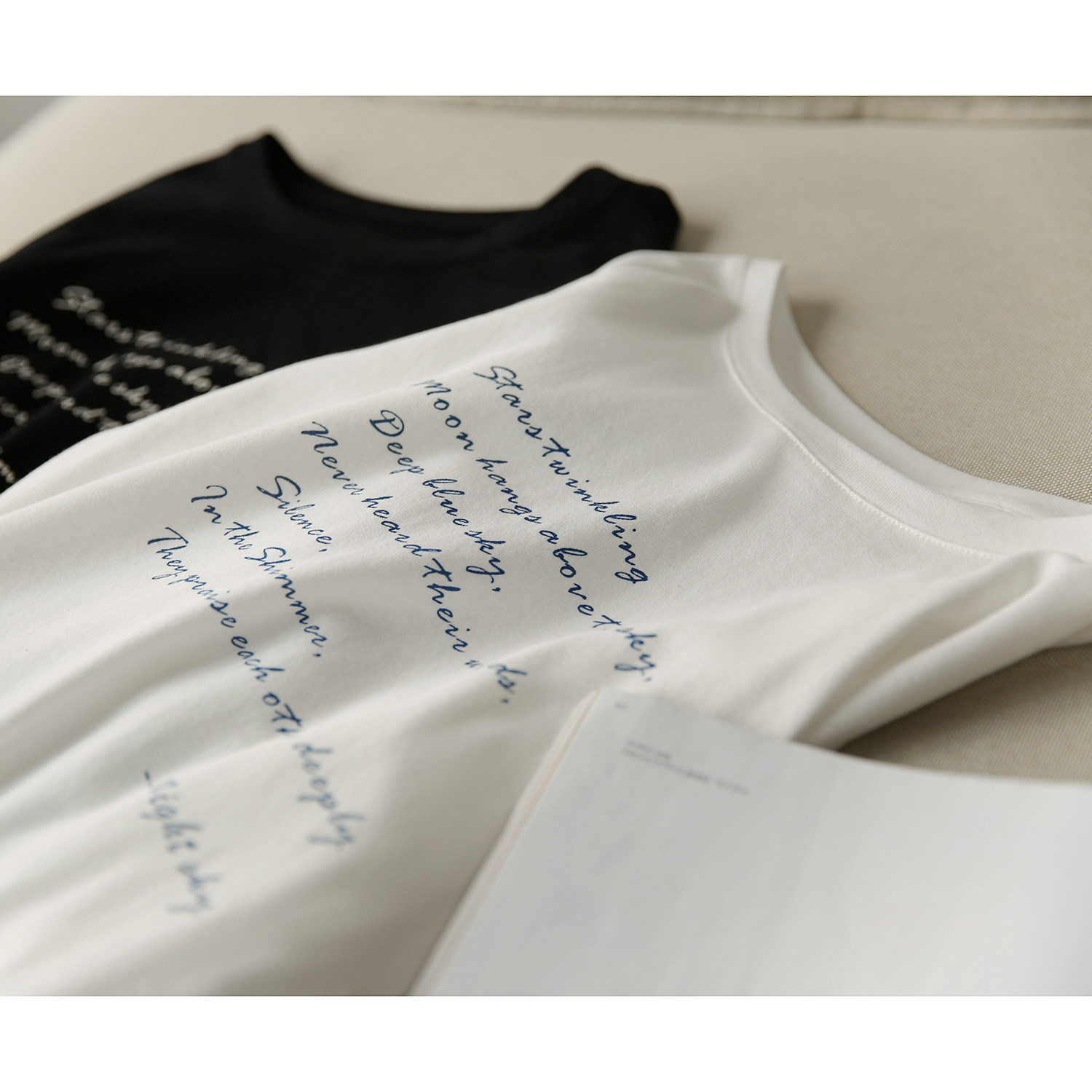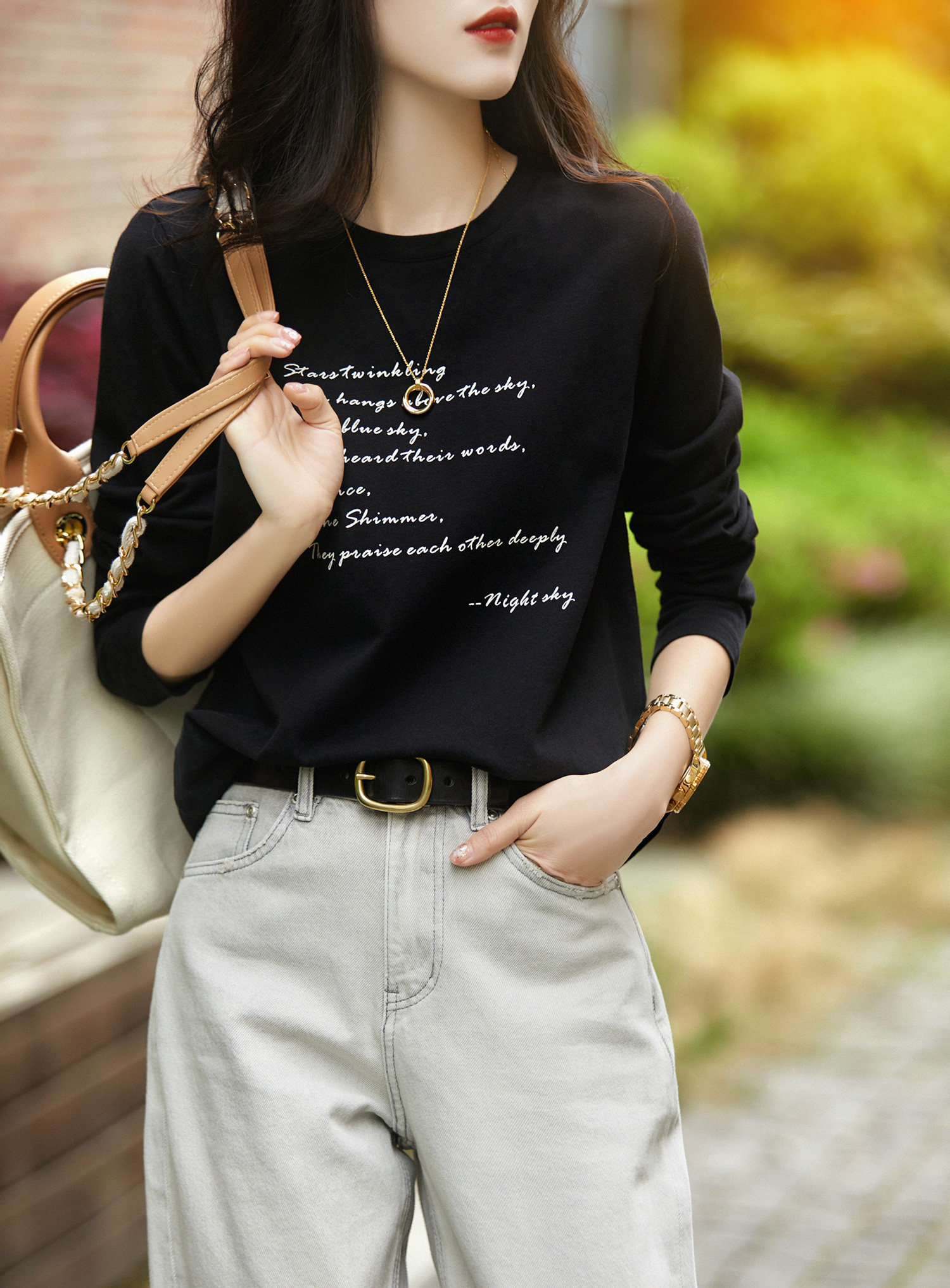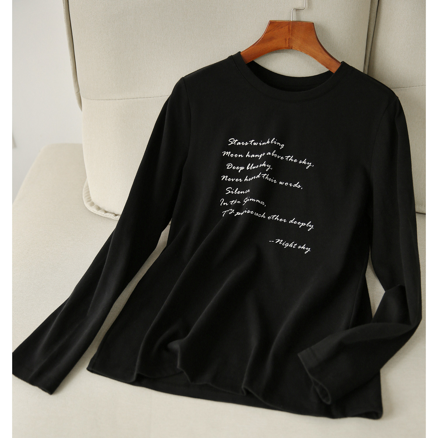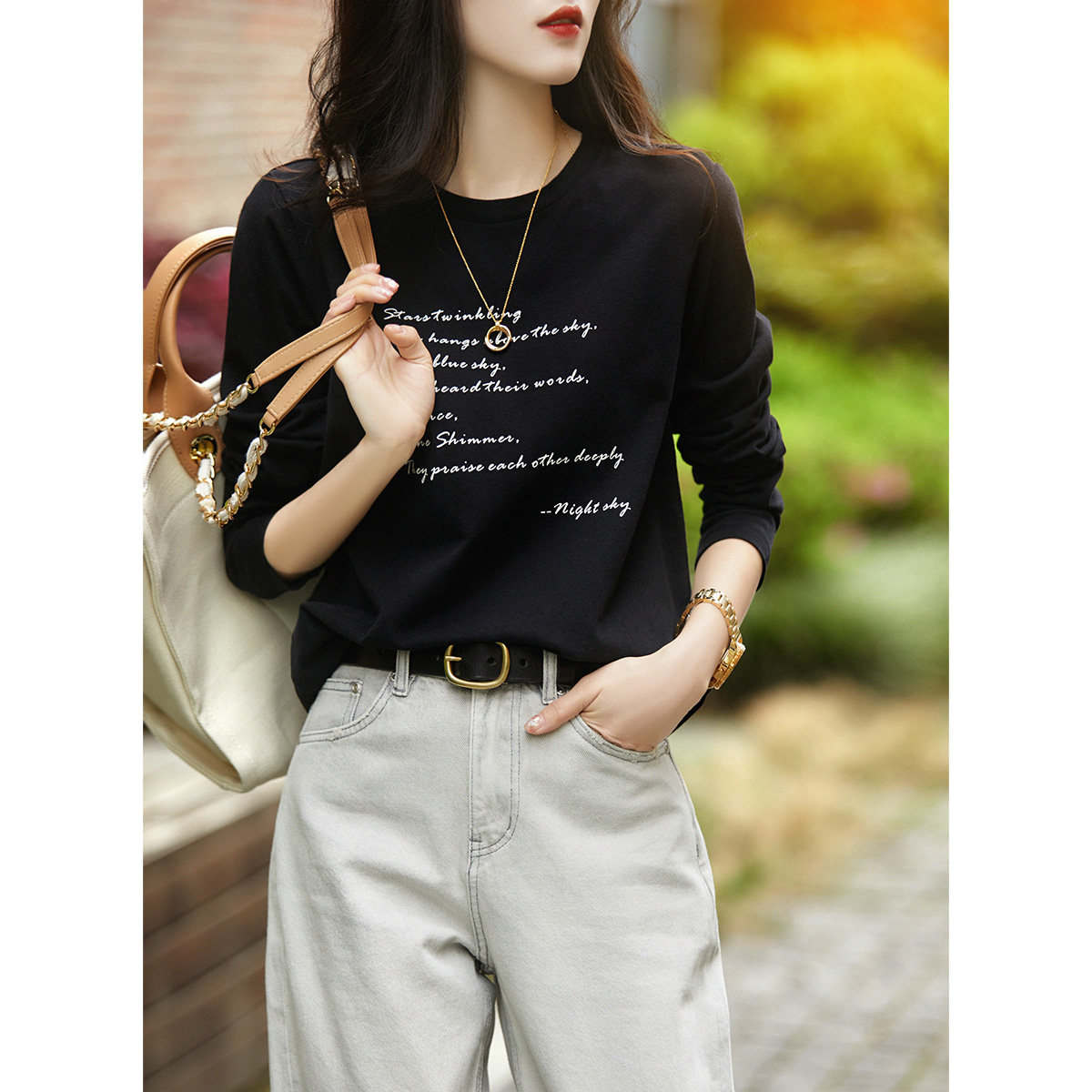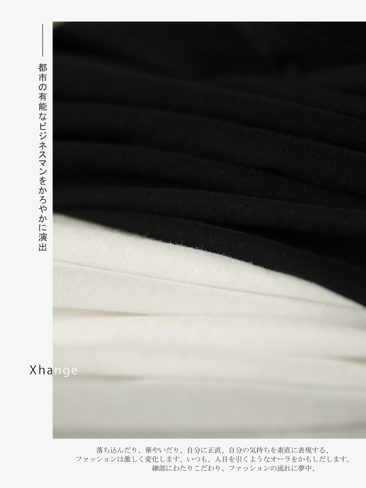 の[XYG381076AG] Xiaohange классическая сложенная черно-белая футболка из чистого хлопка с круглым вырезом и длинными рукавами