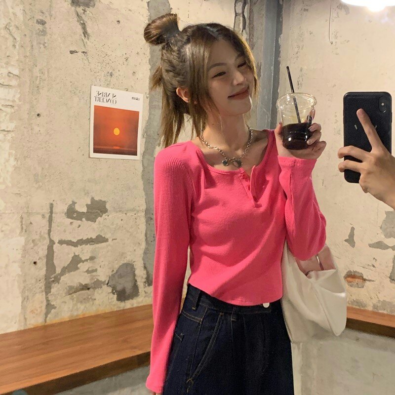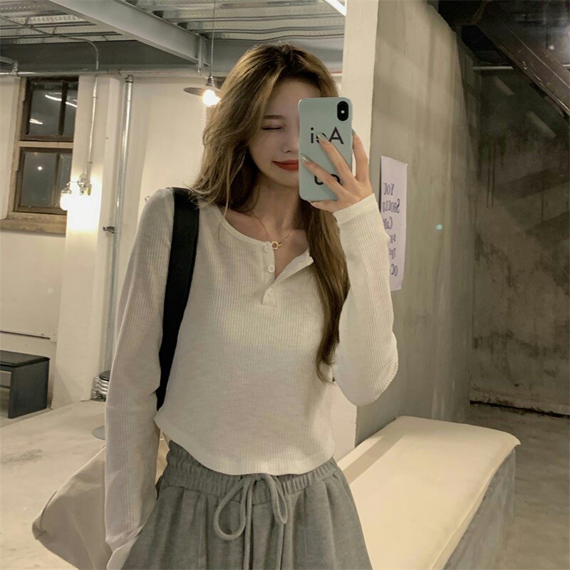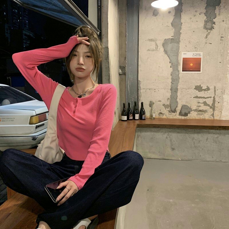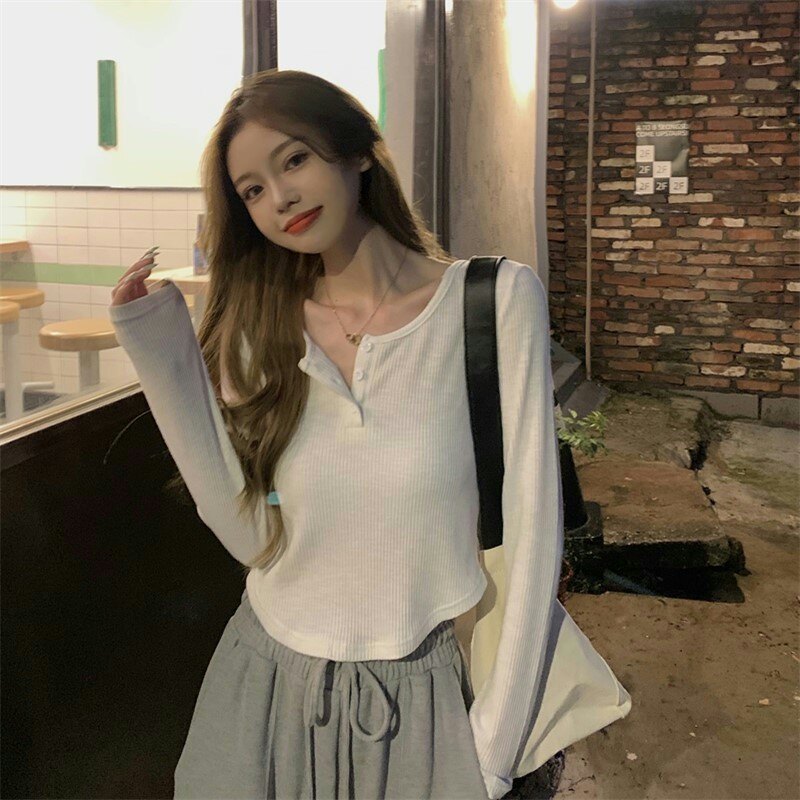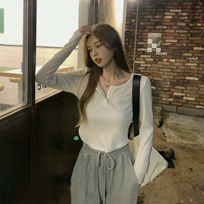 Осенняя футболка, короткий сексуальный брендовый лонгслив, V-образный вырез