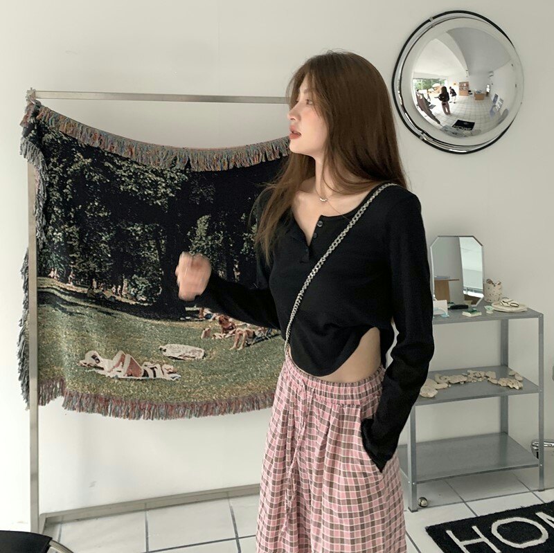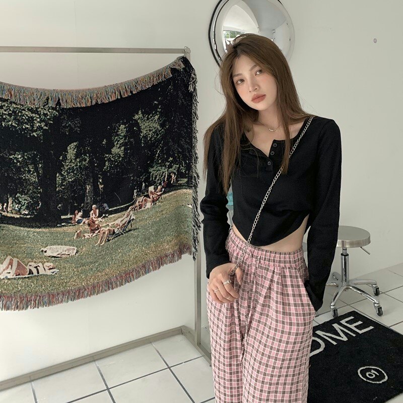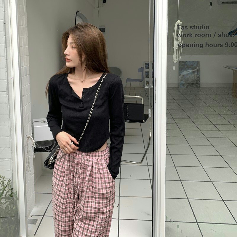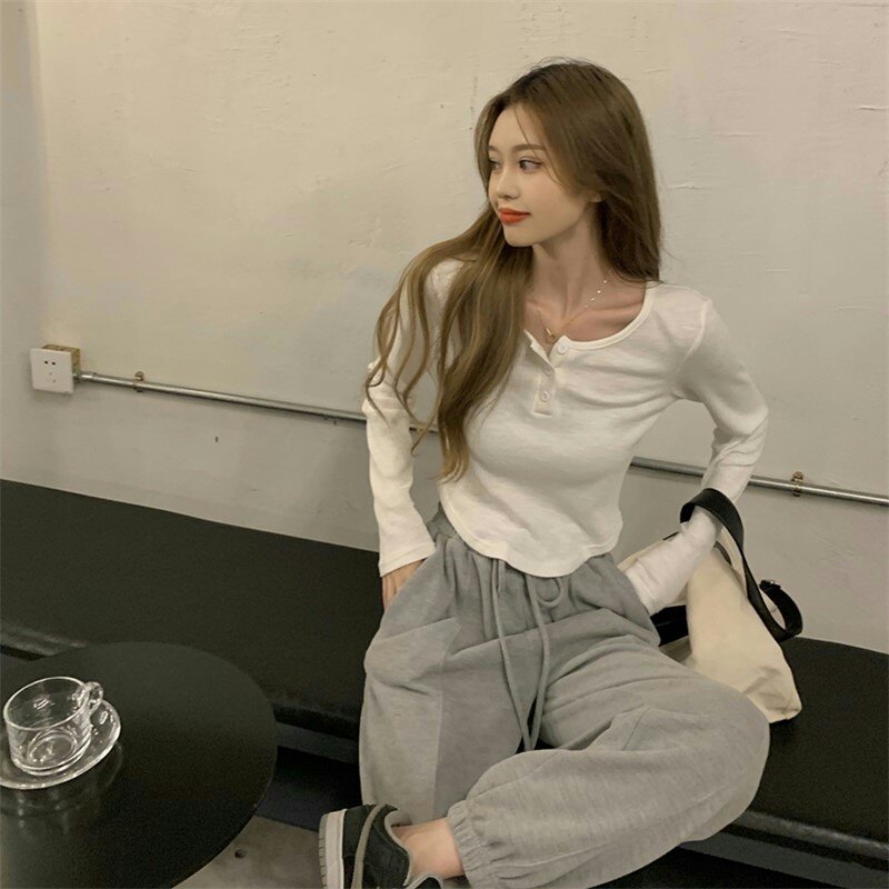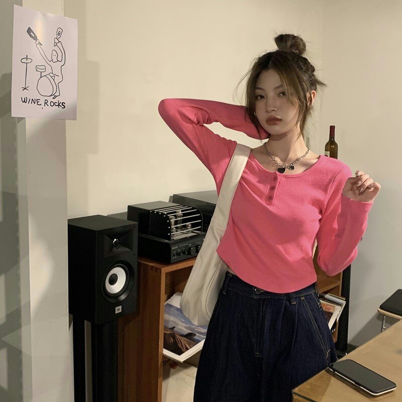 Осенняя футболка, короткий сексуальный брендовый лонгслив, V-образный вырез