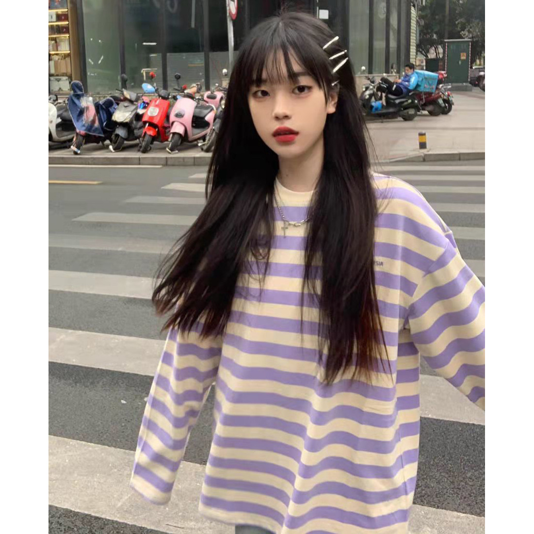 Сиреневый осенний брендовый сексуальный базовый приятный телу лонгслив для школьников, в корейском стиле
