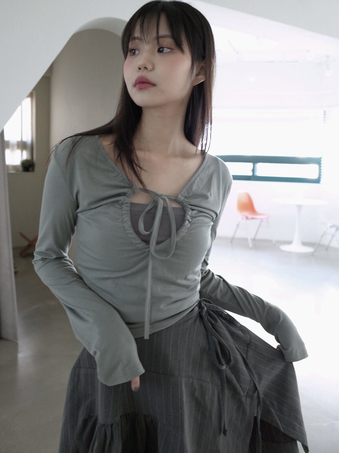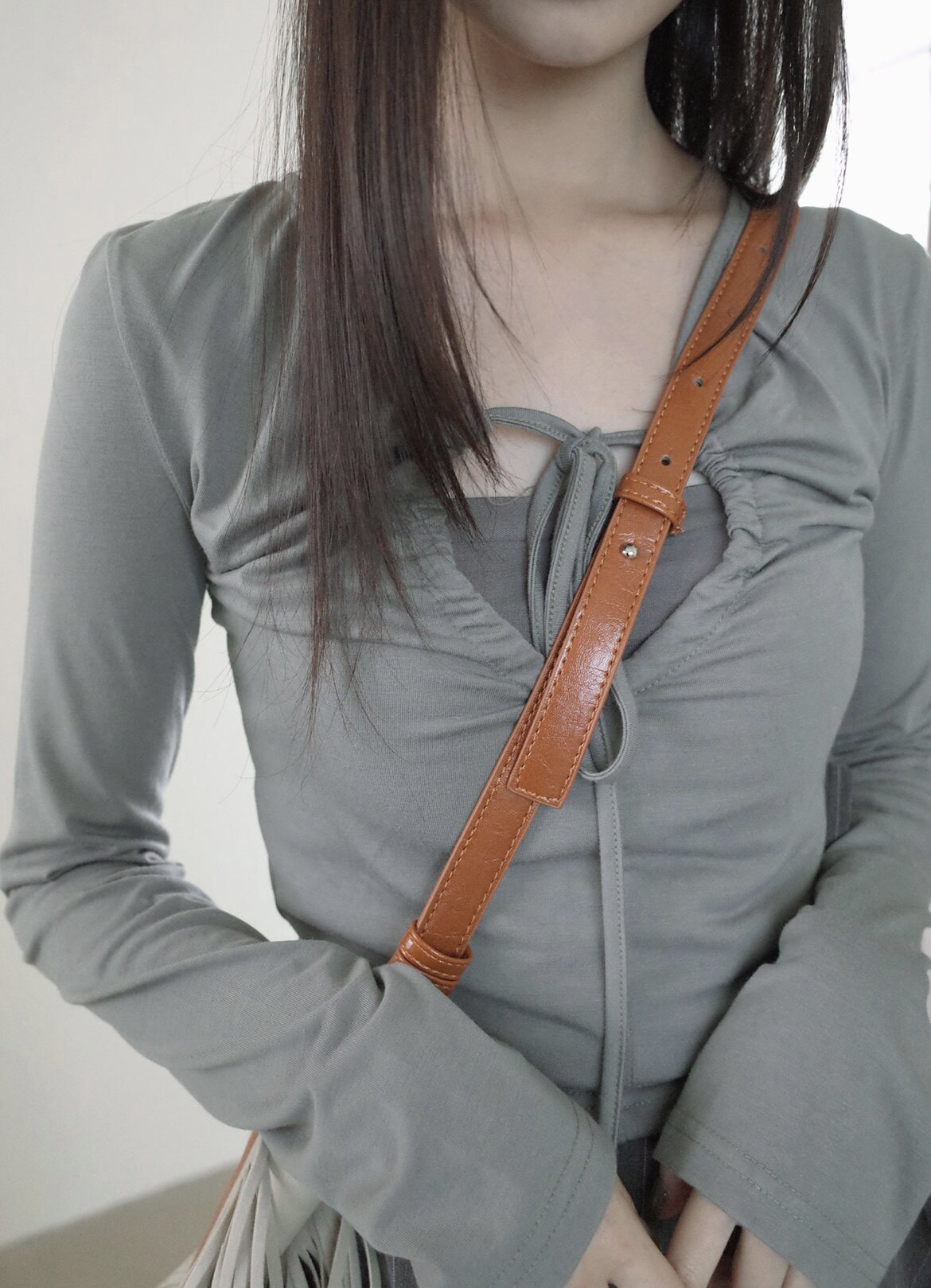 Небольшой дизайнерский эластичный ремень, приталенный лонгслив, приятная телу футболка, на шнурках