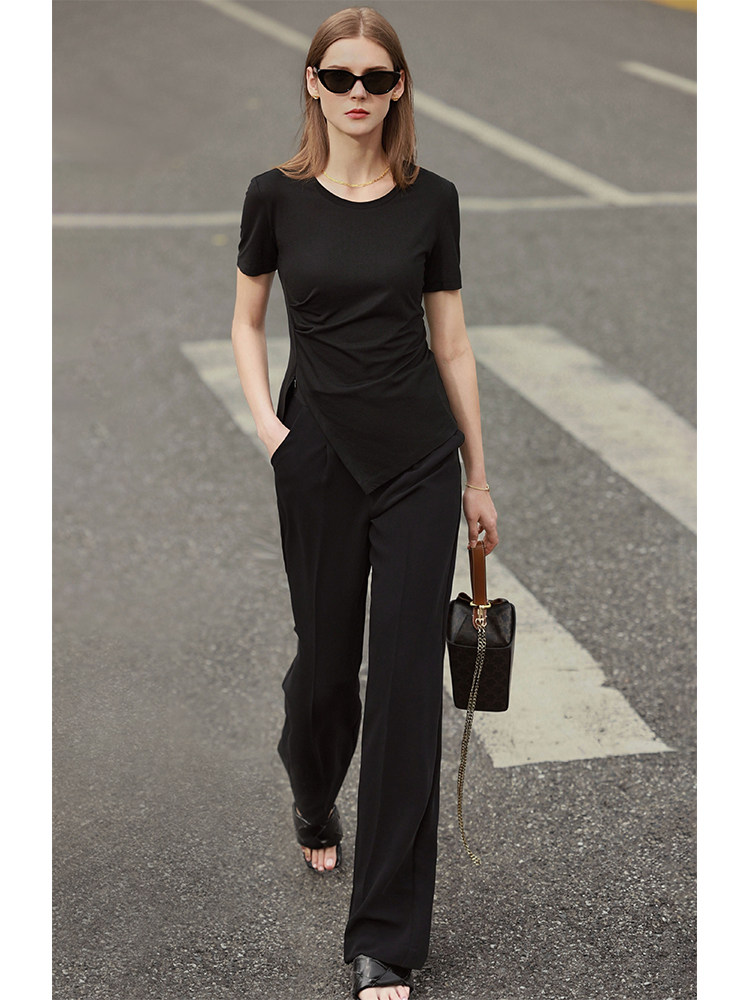 AMII2024 Spring New Short -sleeed T -Fork Lish's Positive Design Plower Design Feel нерегулярная складка модальная топ