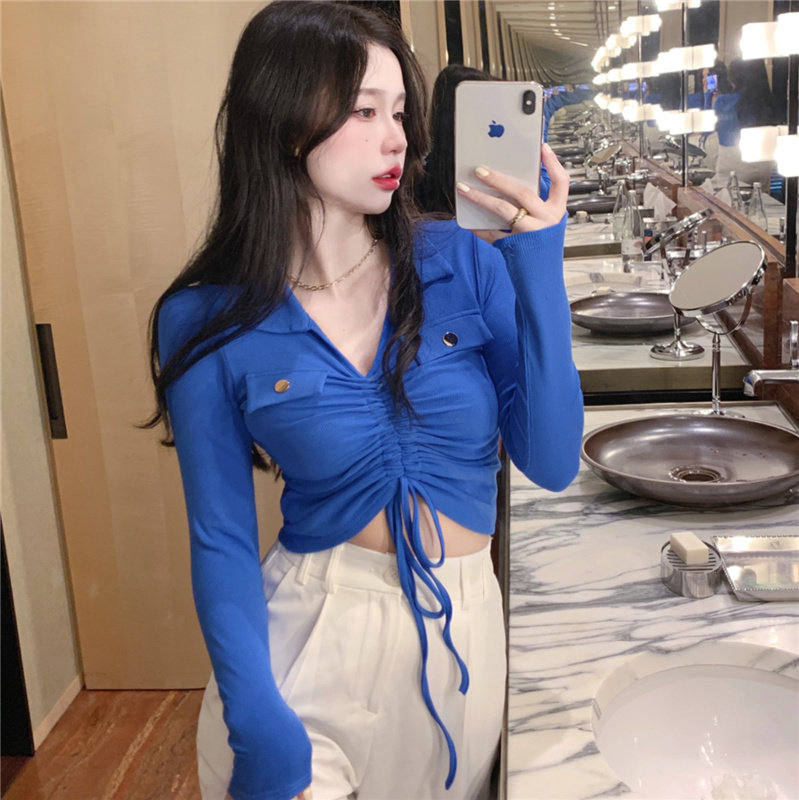 Короткая осенняя приталенная базовая приятная телу футболка, большой размер, воротник поло, на шнурках