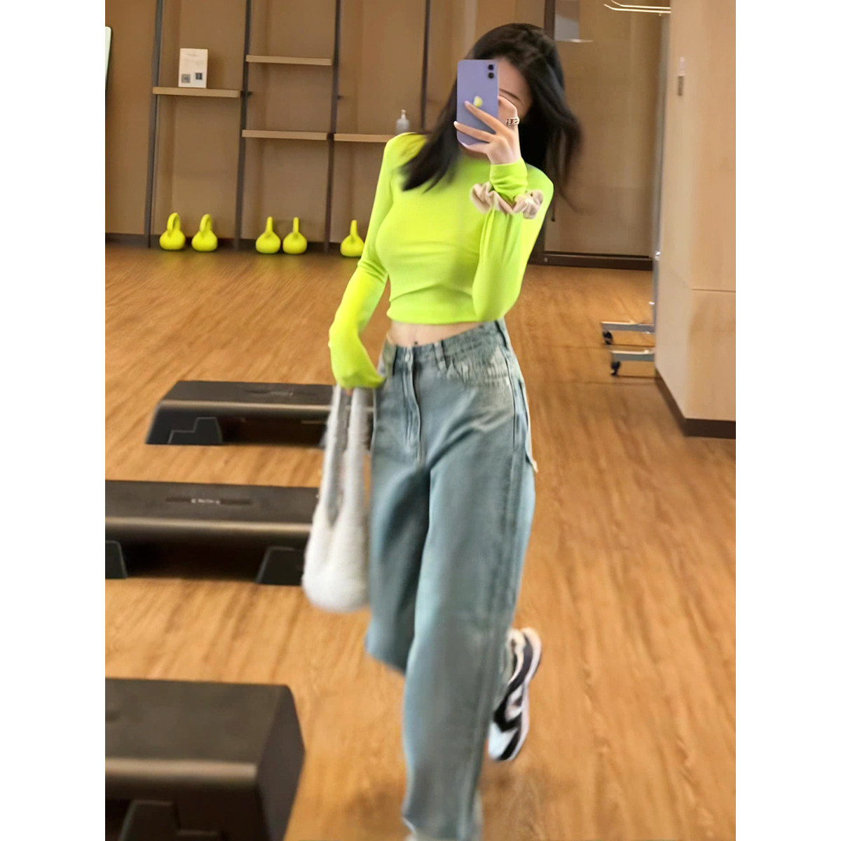 | Цвет: | Зеленый топ, Синие джинсы |