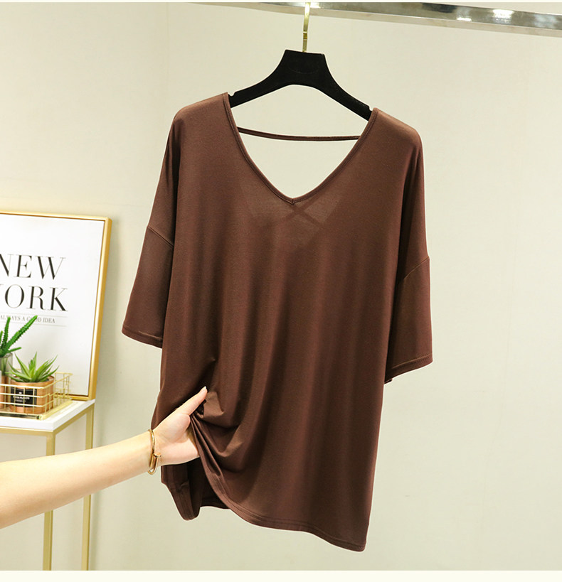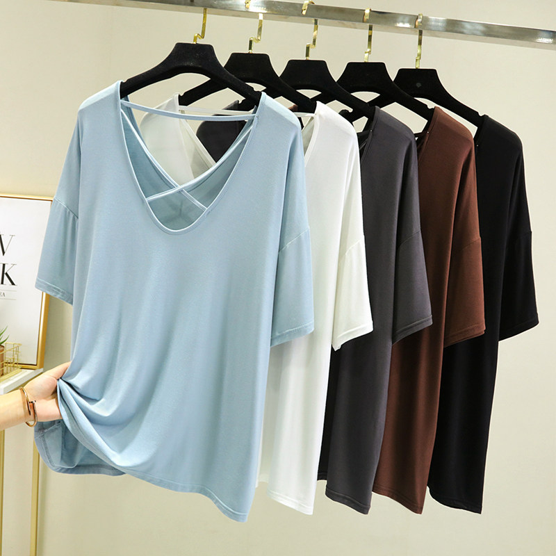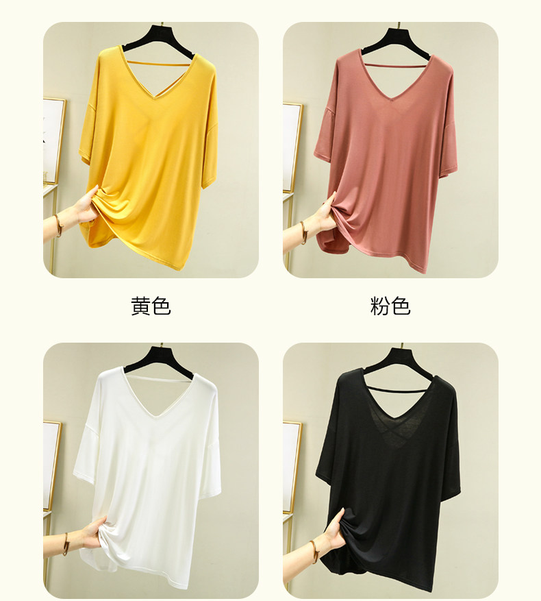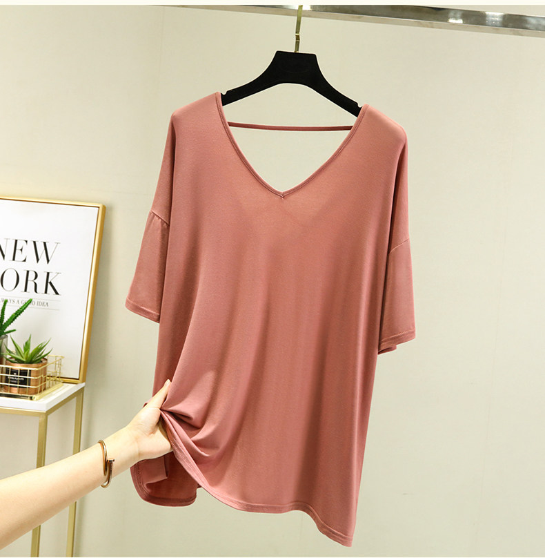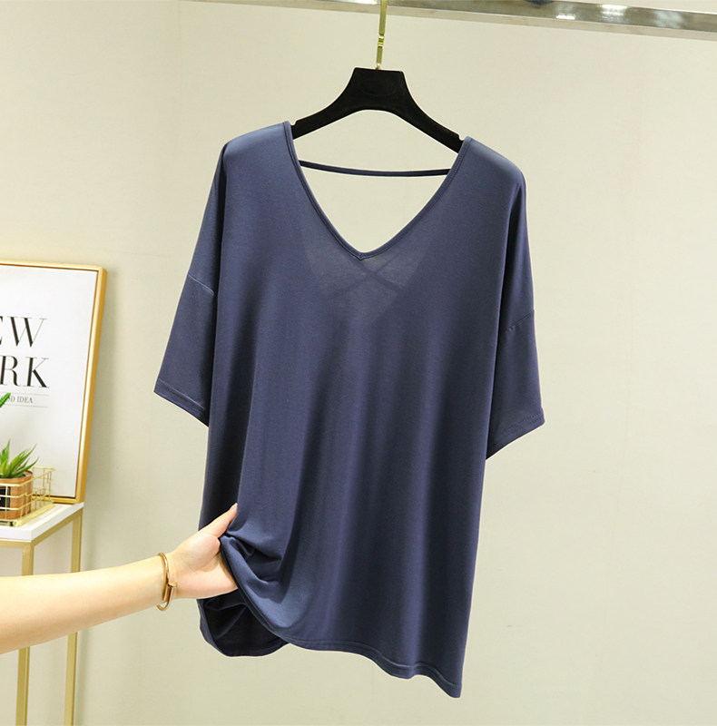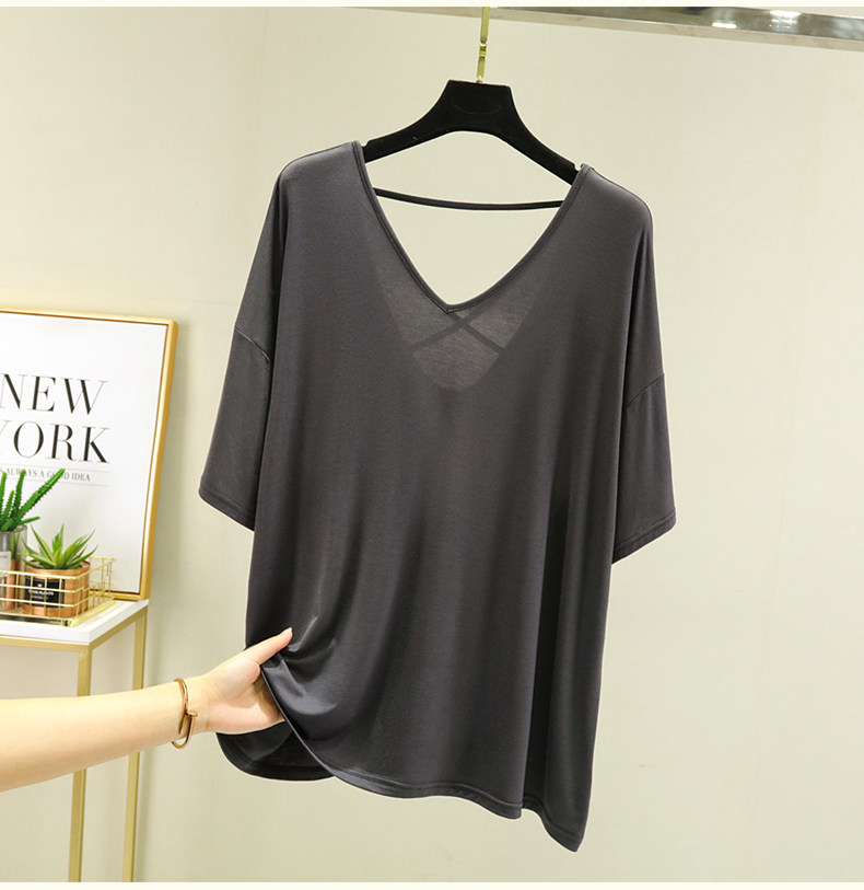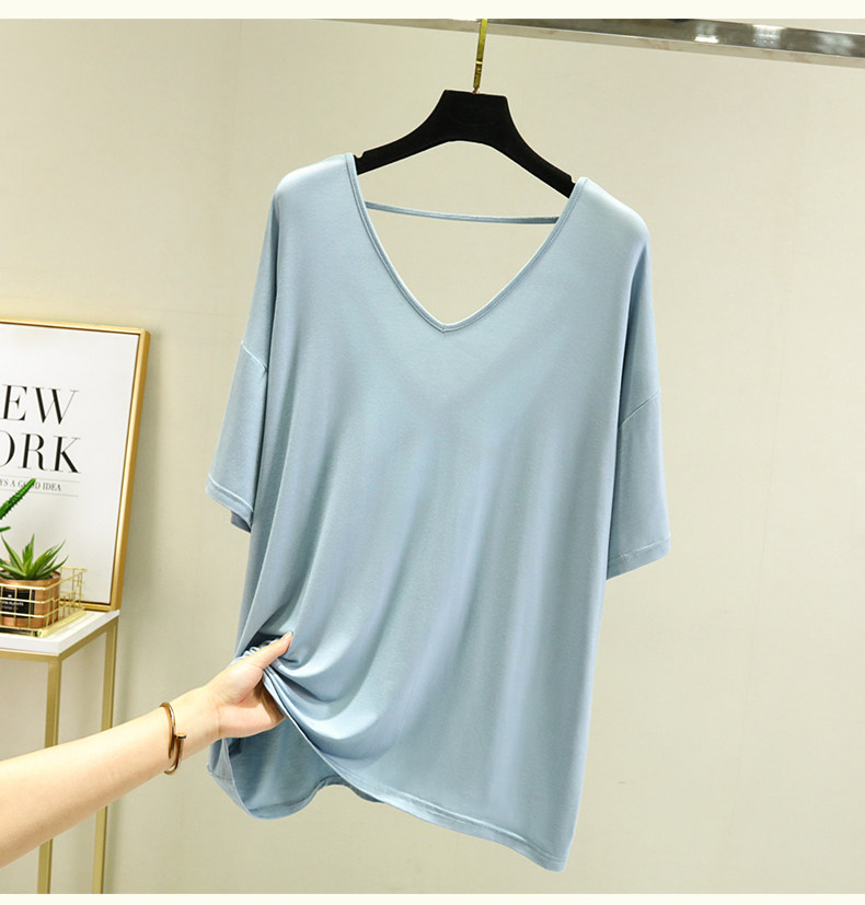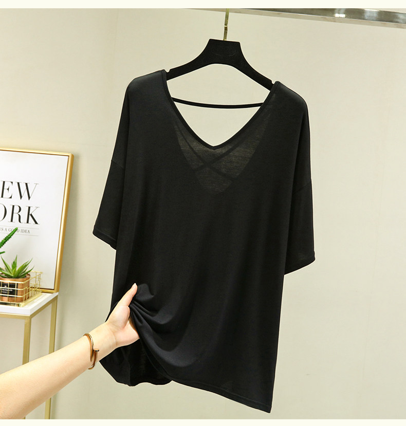 Тонкая базовая приятная телу футболка, свободный крой, V-образный вырез, короткий рукав, красивая спина, с открытой спиной, размер