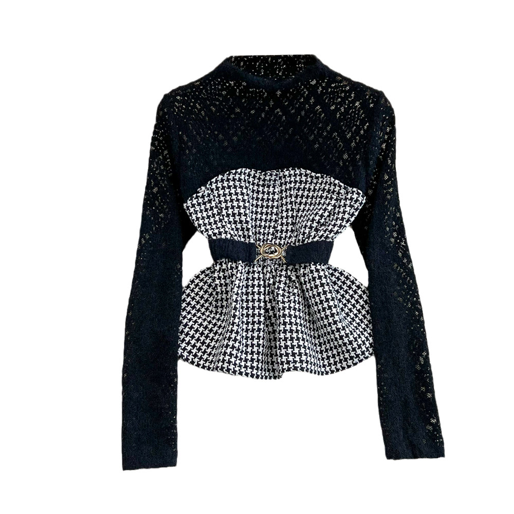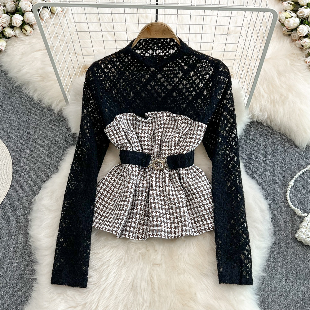 Кружевной весенний модный лонгслив, приталенный корсет, комплект, высокий воротник, тренд сезона, в корейском стиле