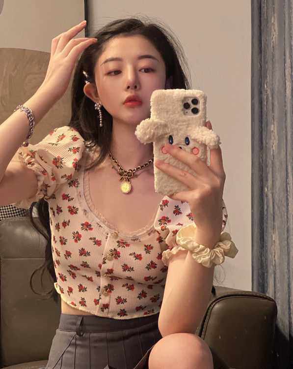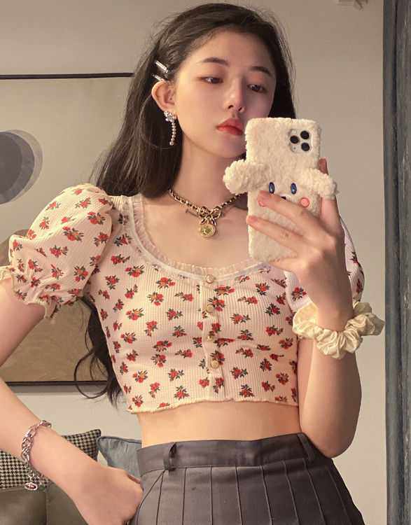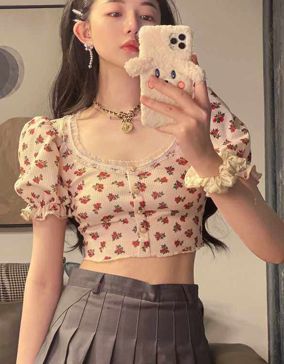 Летняя короткая приталенная футболка, цветочный принт, квадратный вырез, рукава фонарики