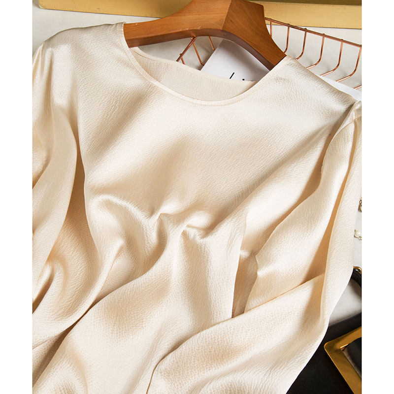 Весенний летний бежевый шелковый лонгслив с круглым воротником