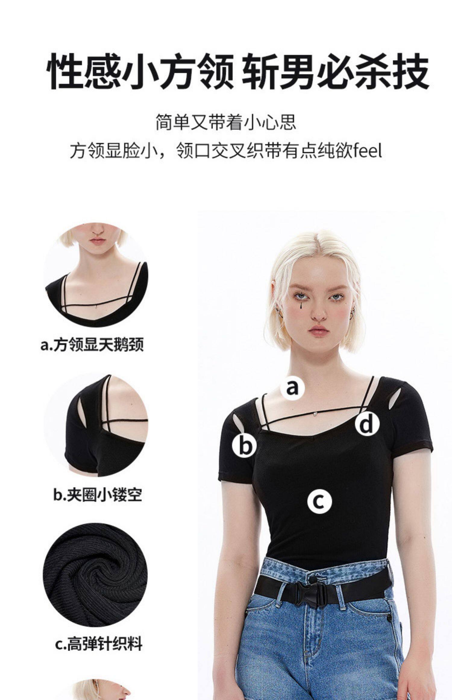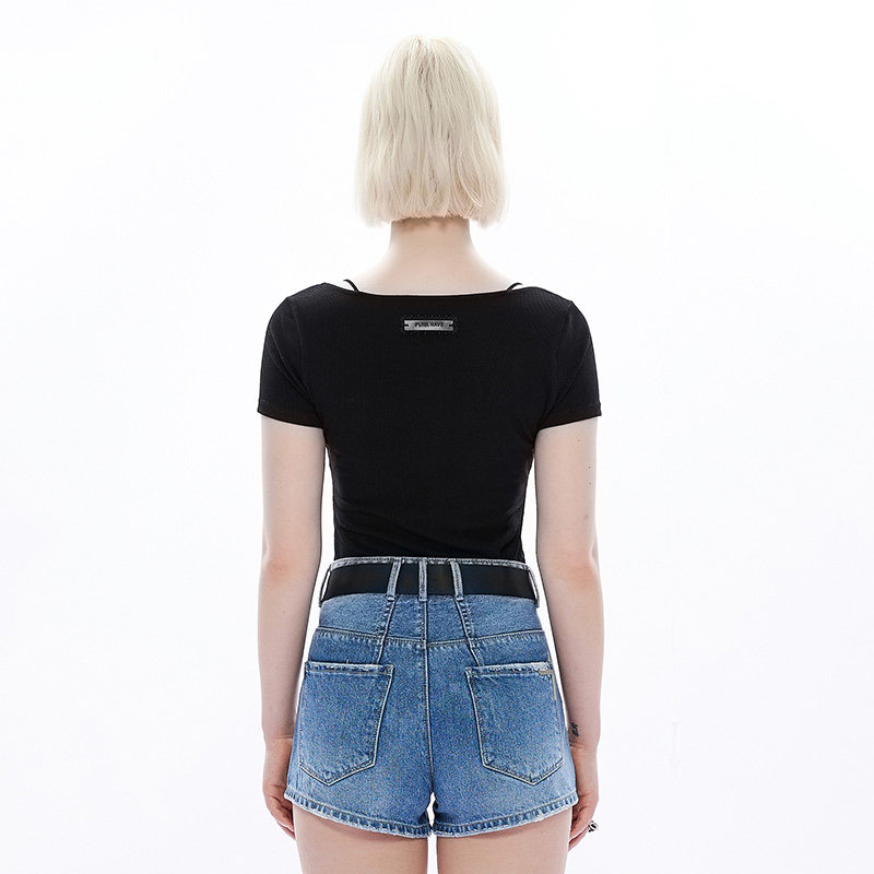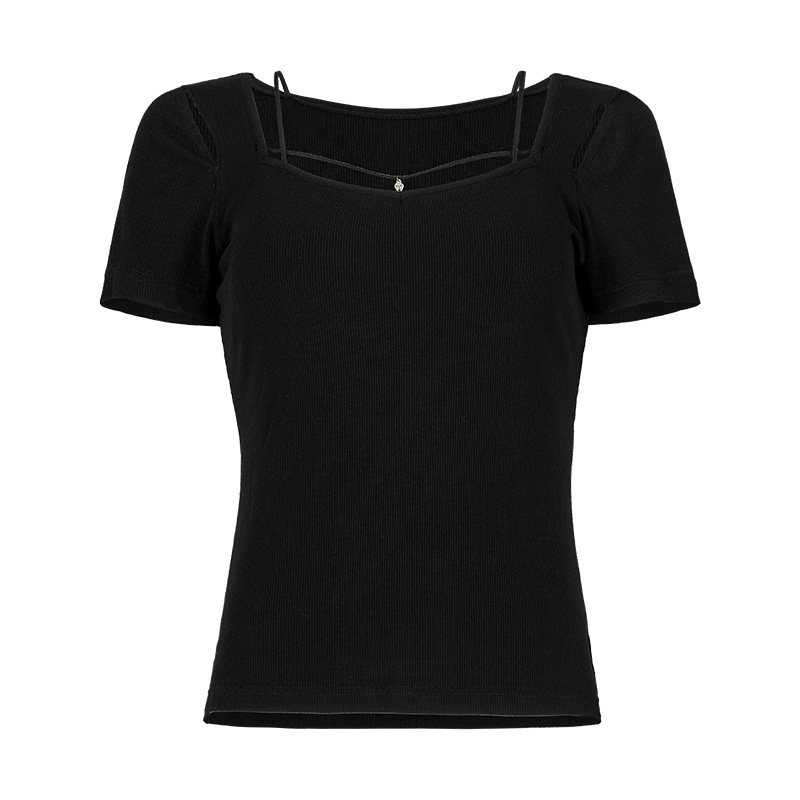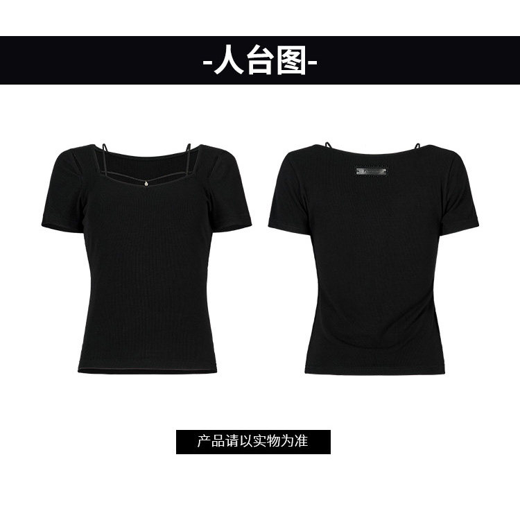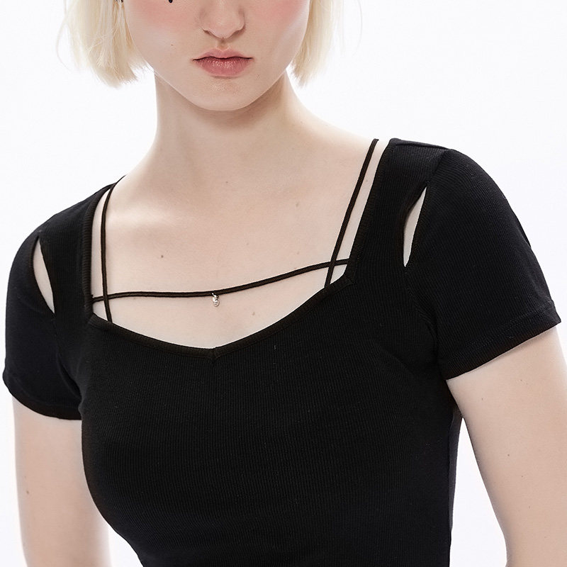 Черная базовая приятная телу футболка, в стиле панк, коллекция 2023, квадратный вырез, в обтяжку