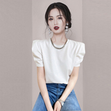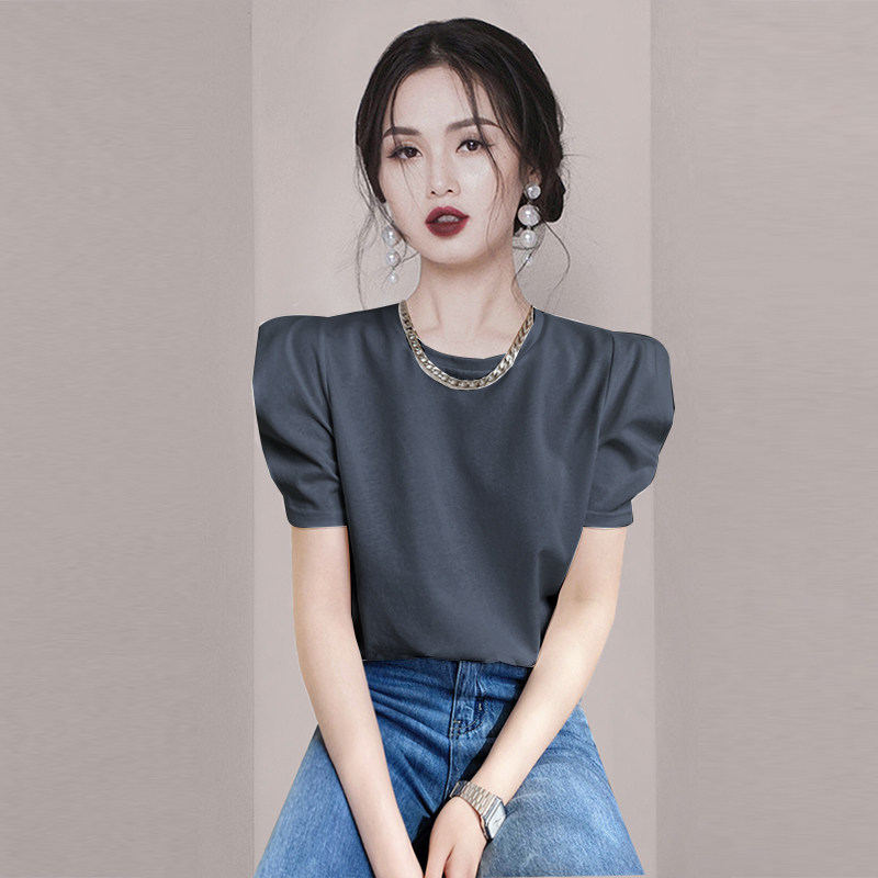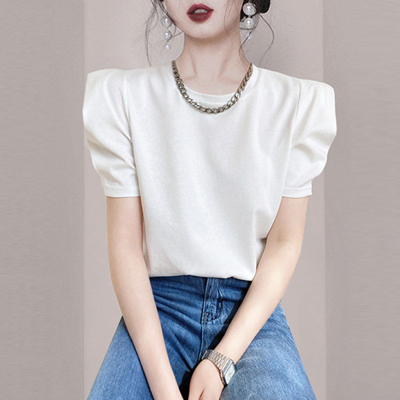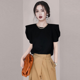 Черная футболка, дизайнерские короткие наплечники, короткий рукав, рукава фонарики, тренд сезона