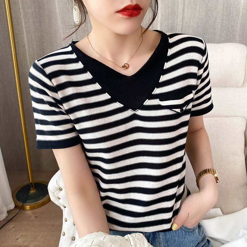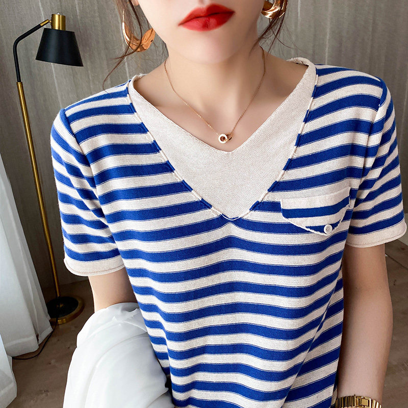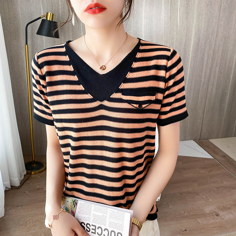 Летний тонкий хлопковый трикотажный комплект, футболка, V-образный вырез, короткий рукав