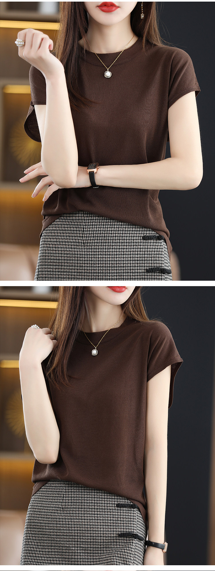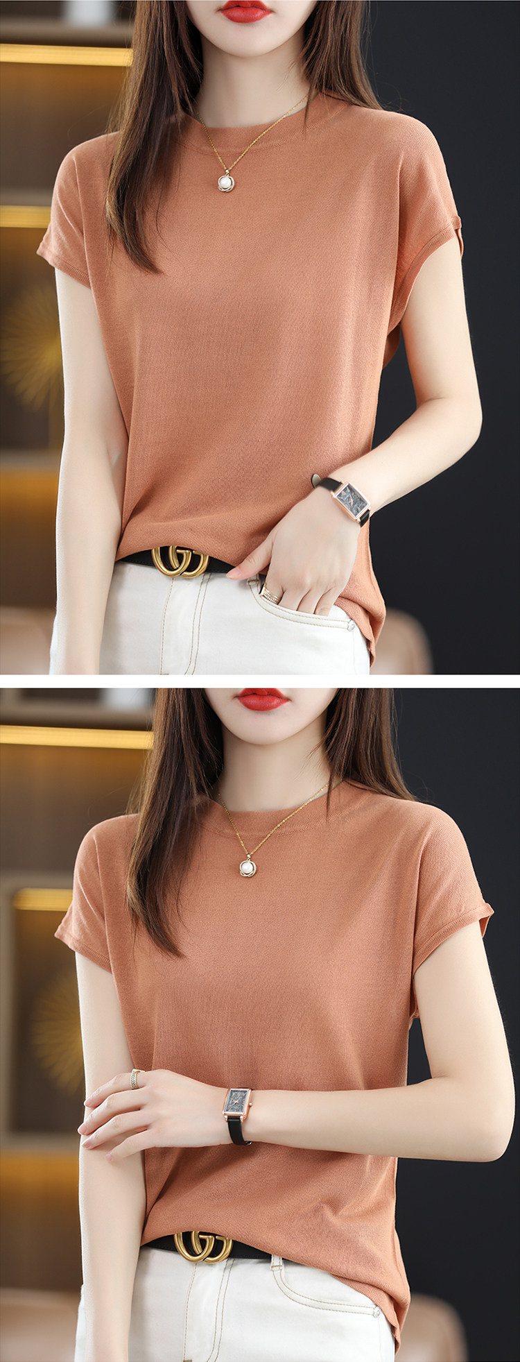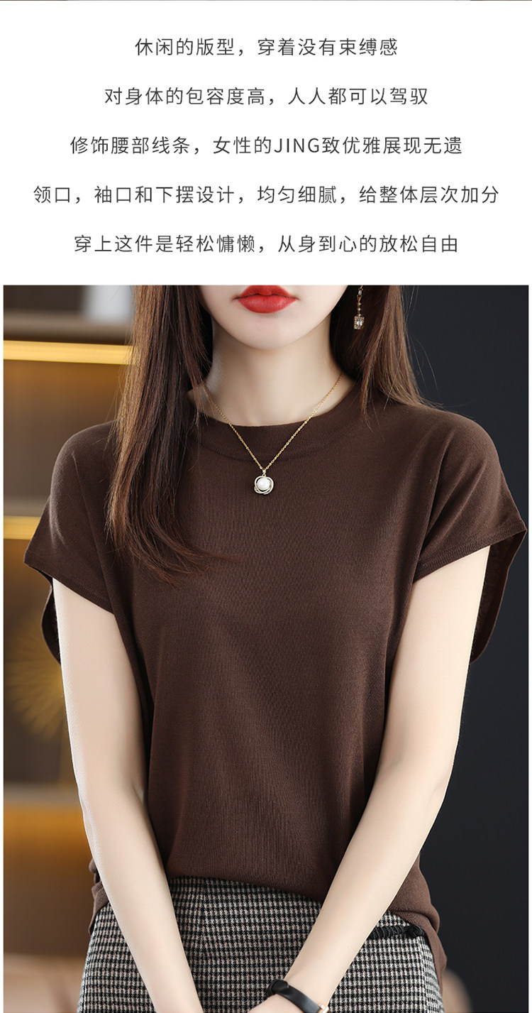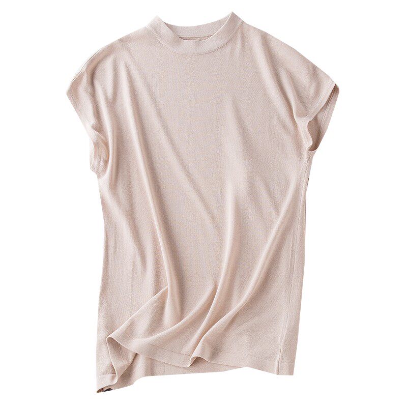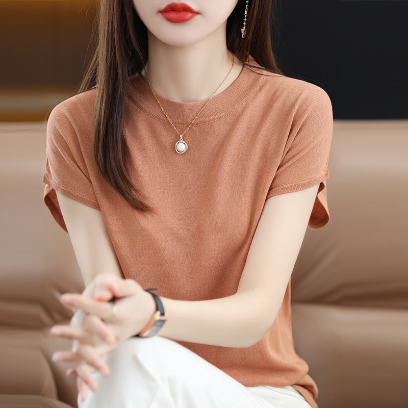 Шелковая трикотажная летняя базовая футболка с коротким рукавом, высокий воротник, свободный крой, 2024 года