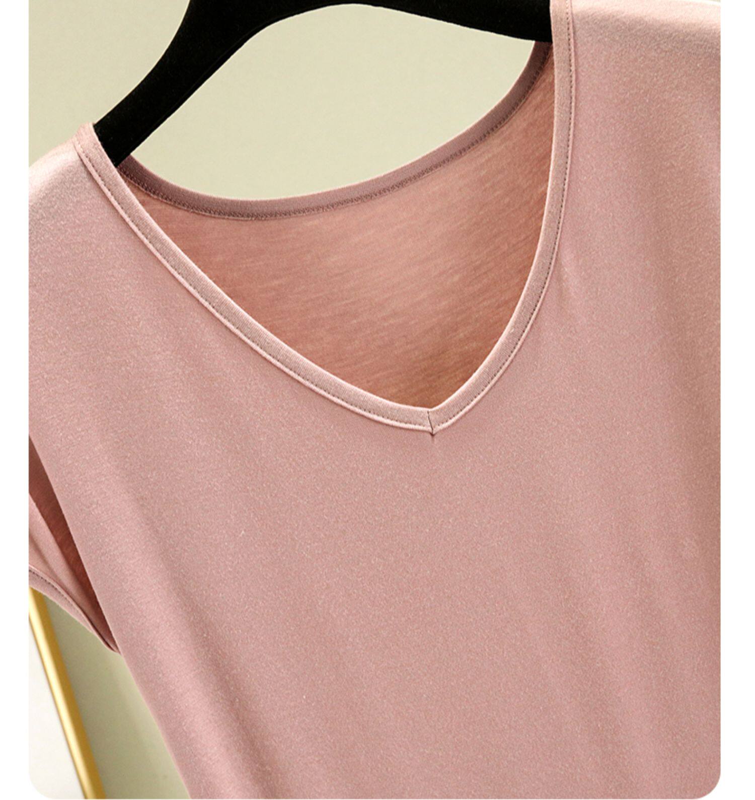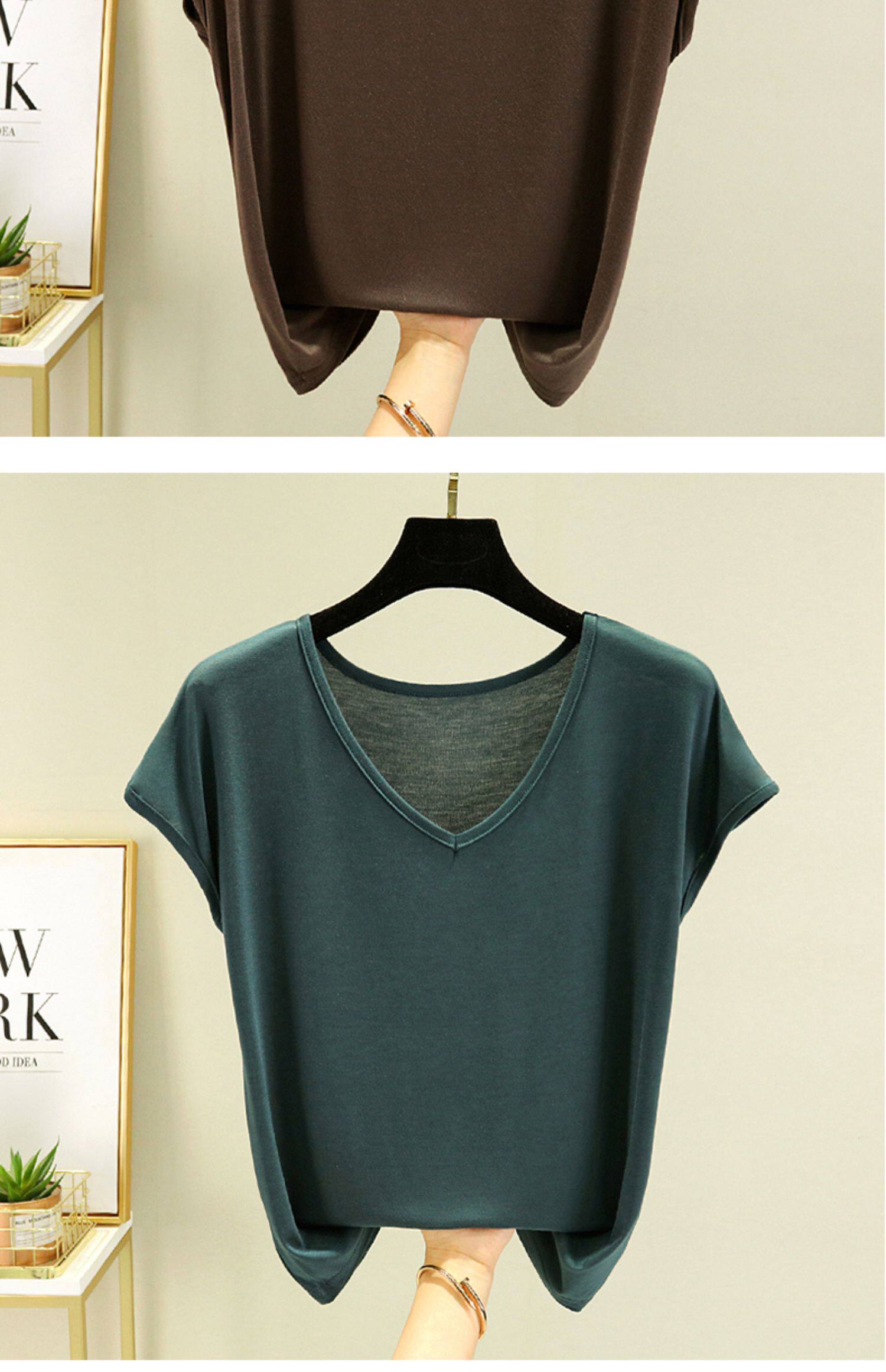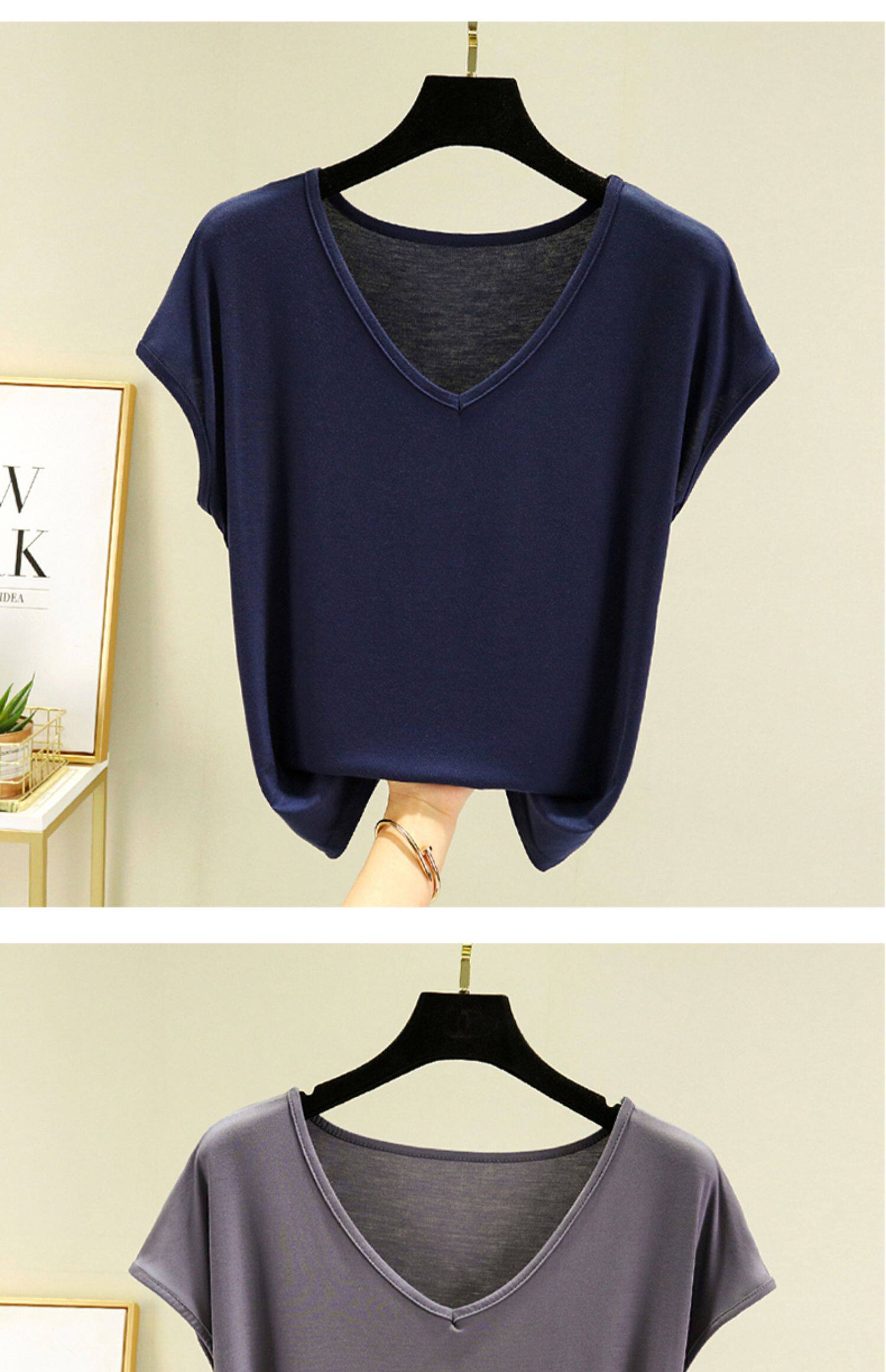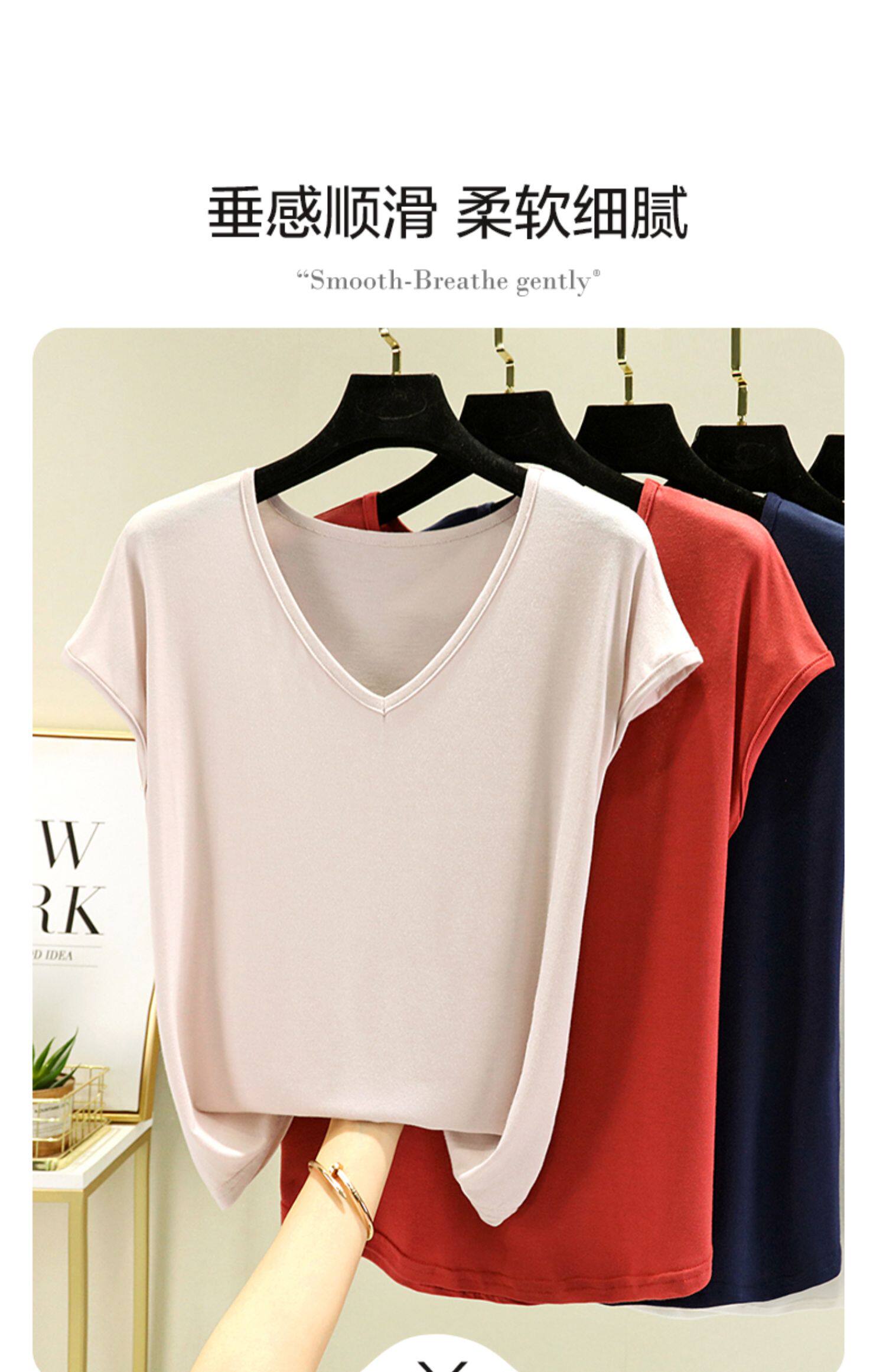 Тонкая базовая приятная телу футболка с коротким рукавом, коллекция 2023, V-образный вырез, высокий воротник, оверсайз