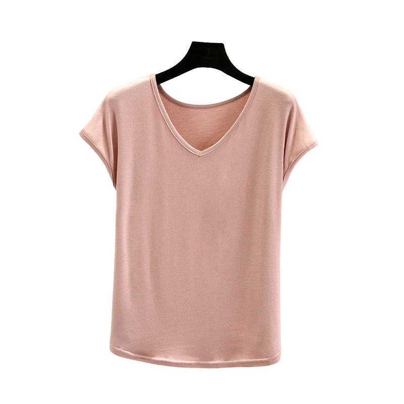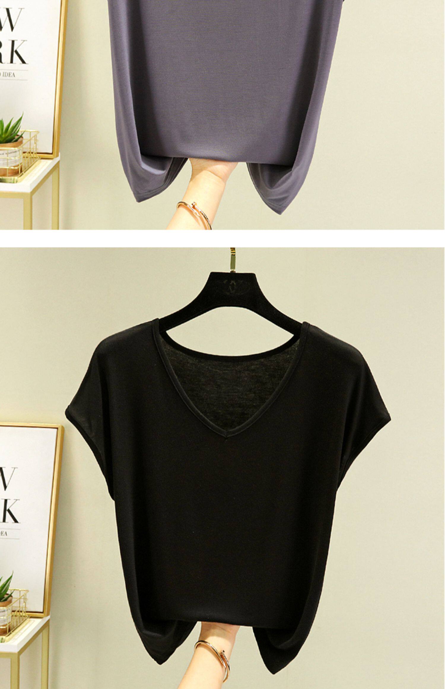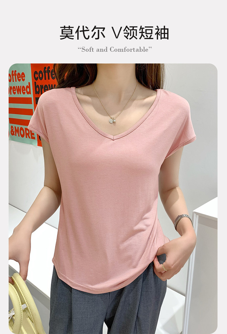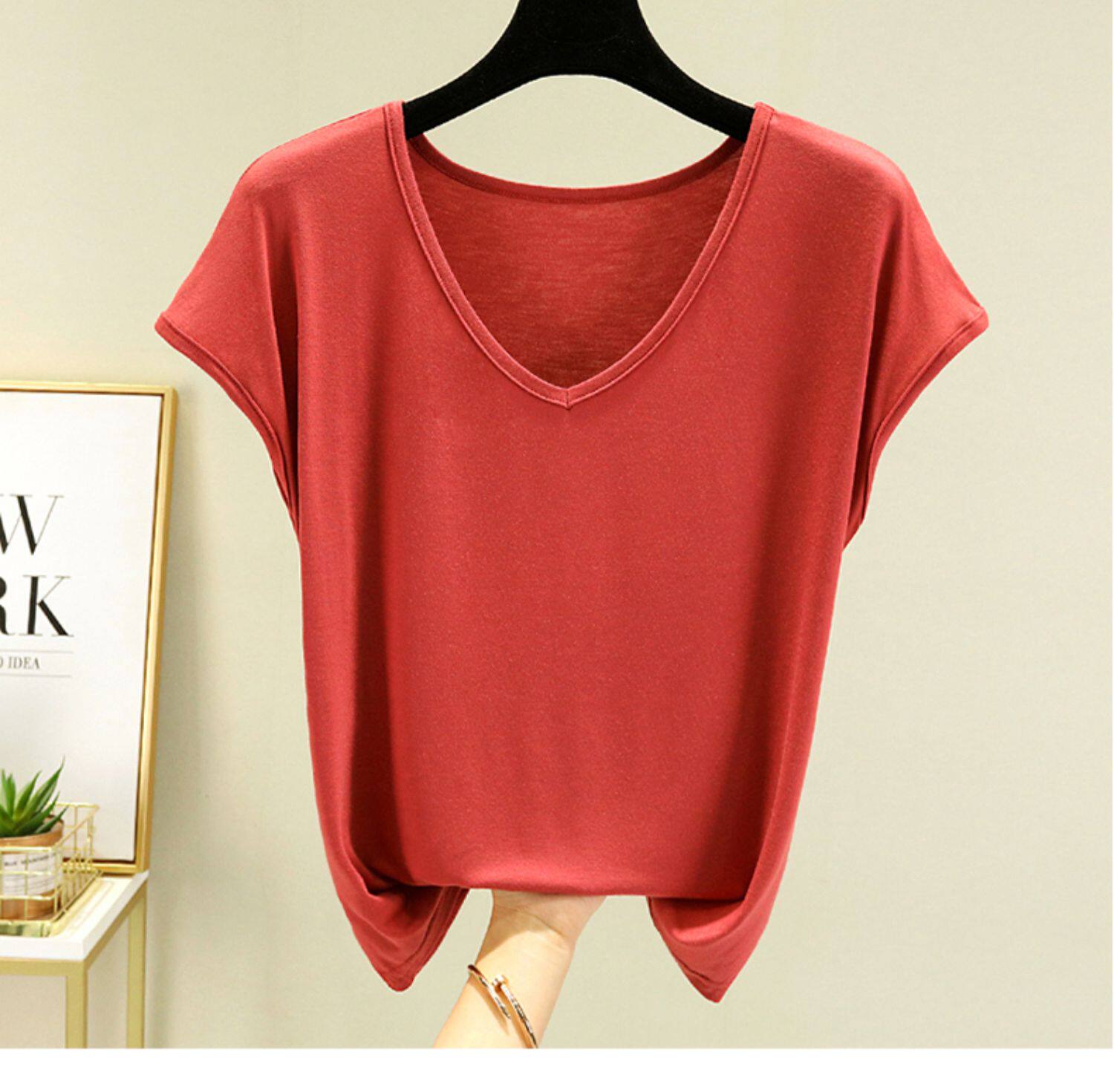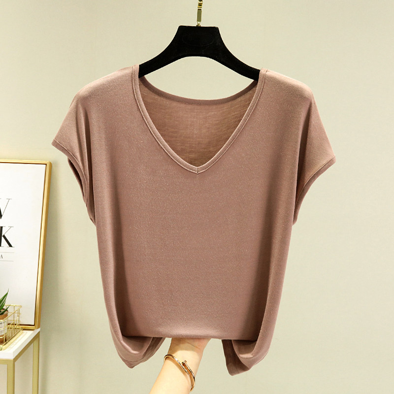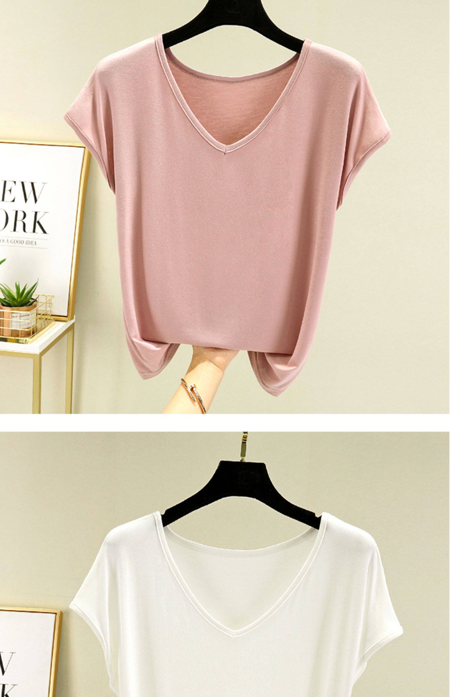 Тонкая базовая приятная телу футболка с коротким рукавом, коллекция 2023, V-образный вырез, высокий воротник, оверсайз