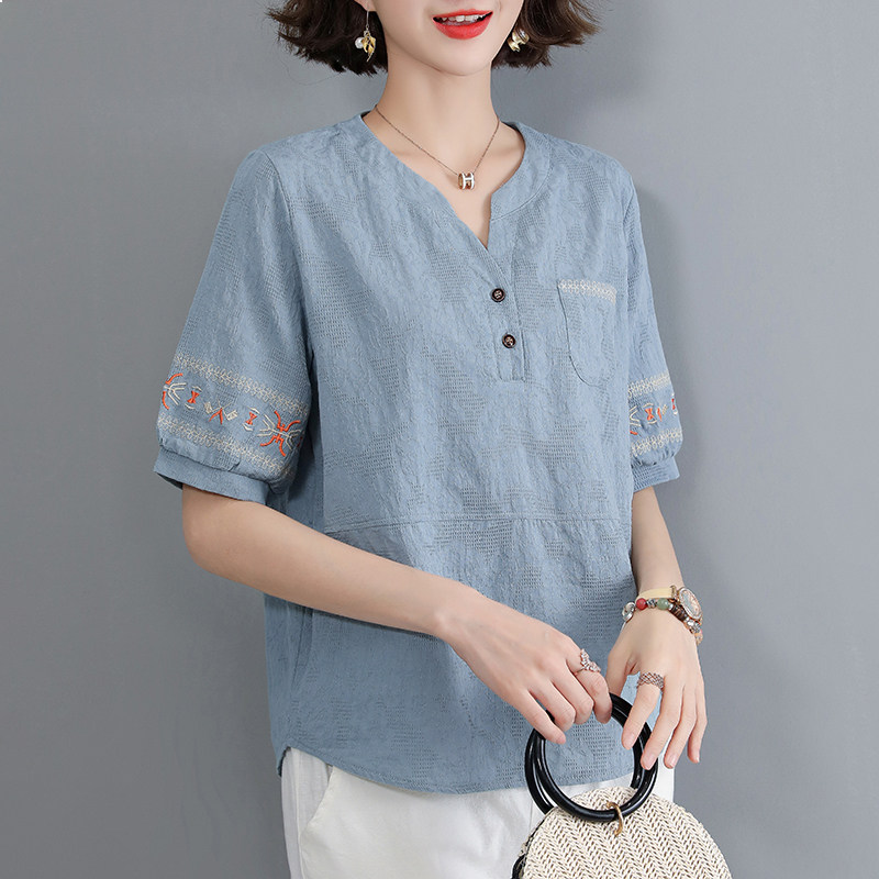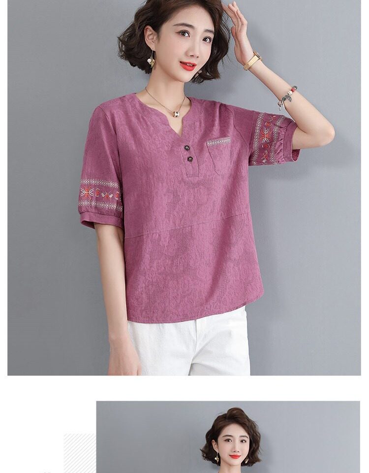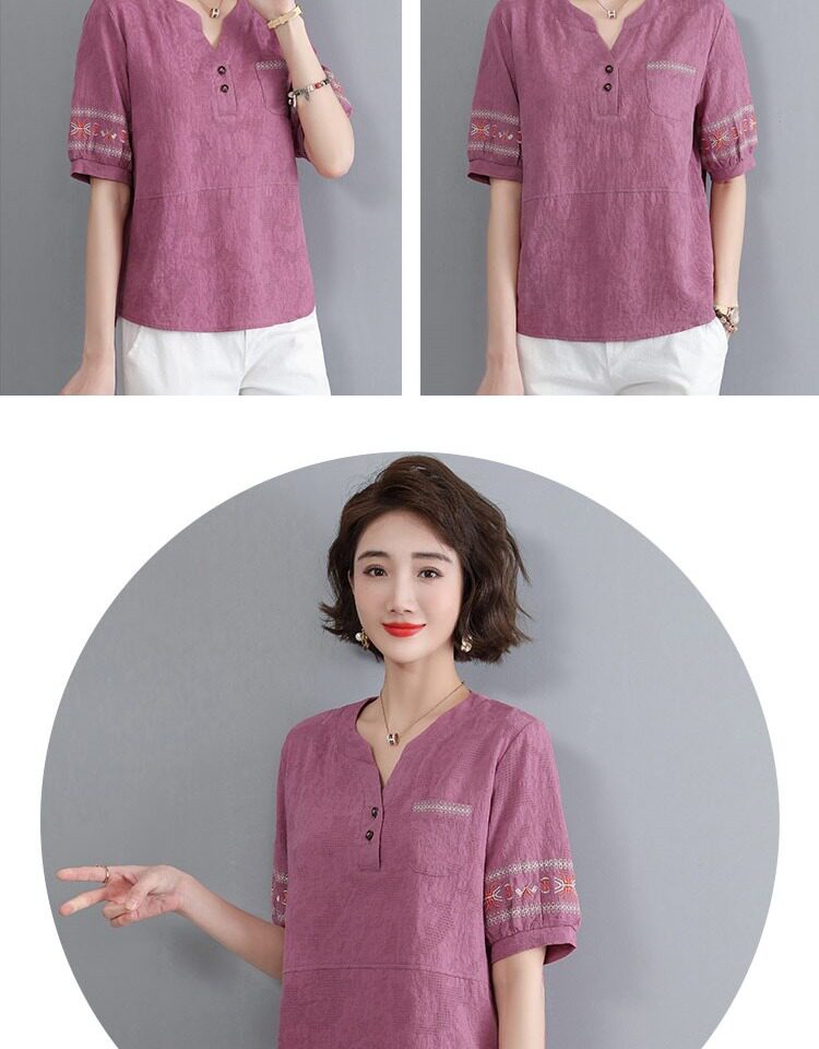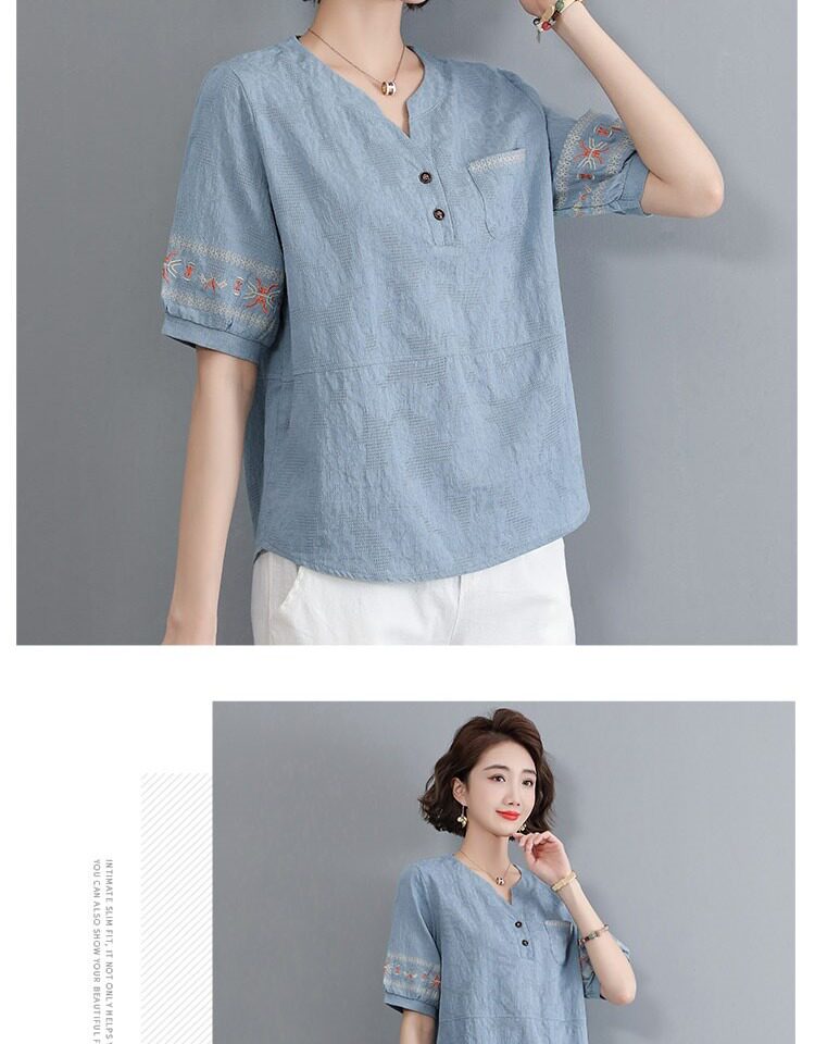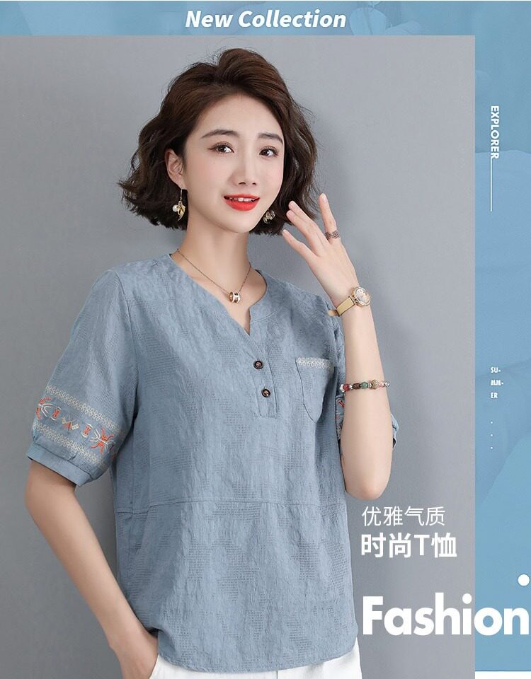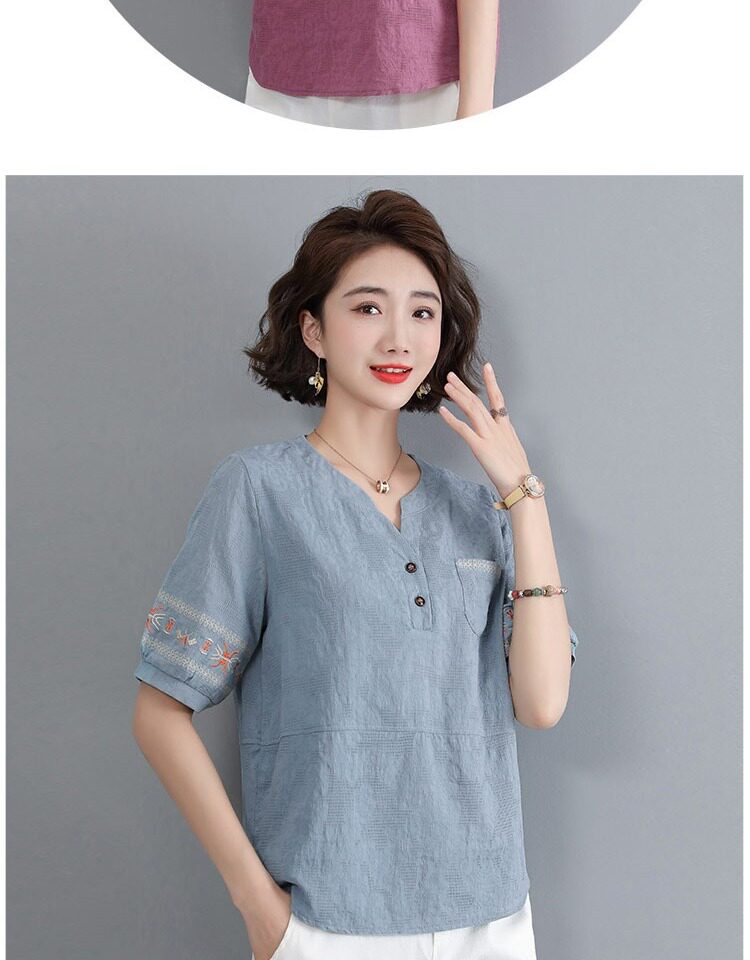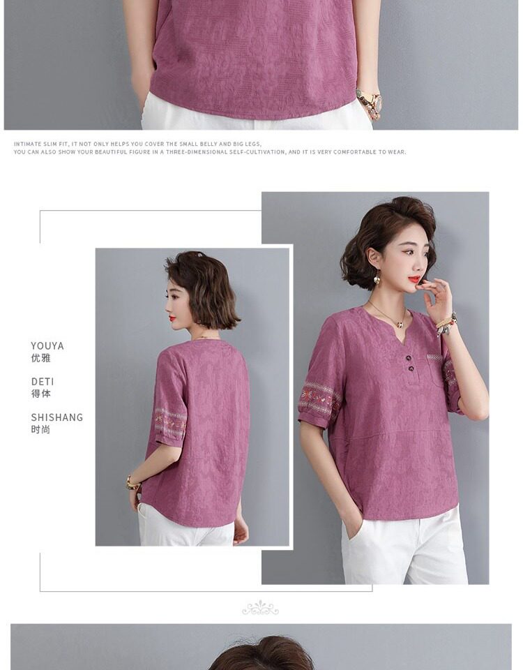 Летняя футболка, летняя одежда, модная рубашка, из хлопка и льна, V-образный вырез, короткий рукав