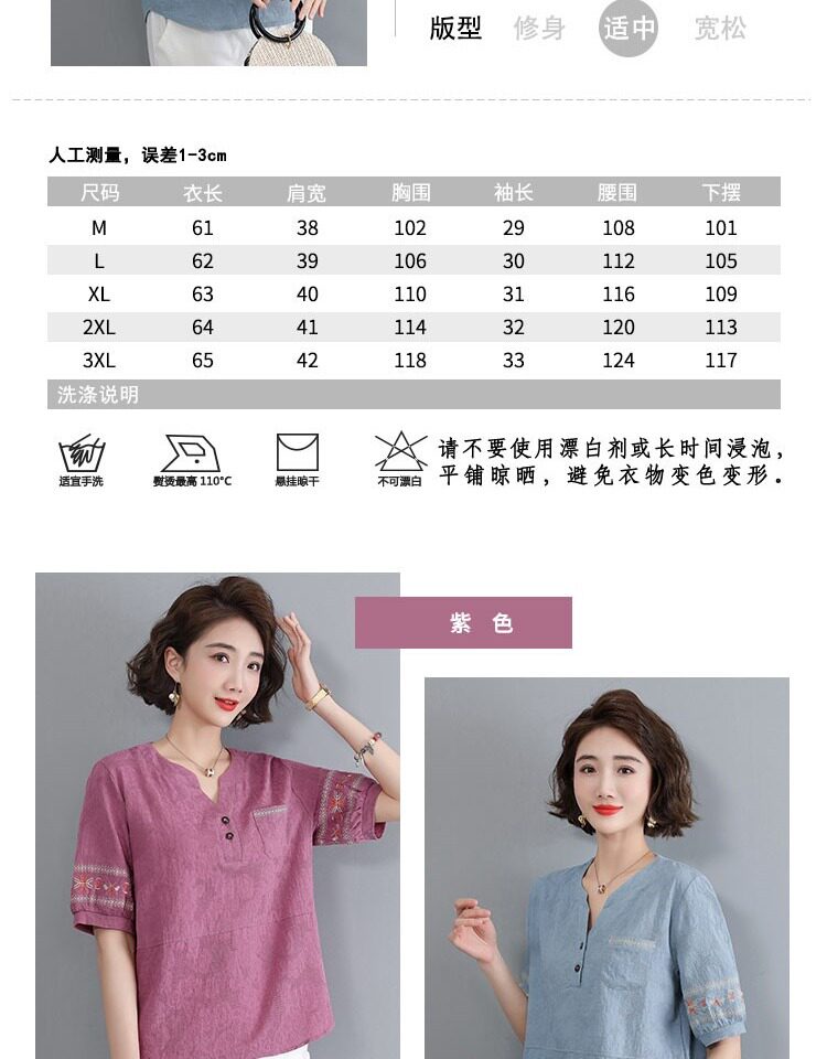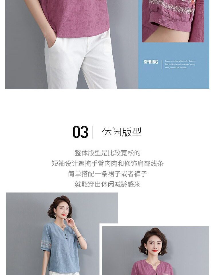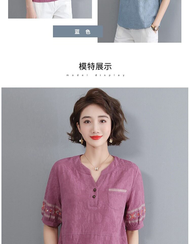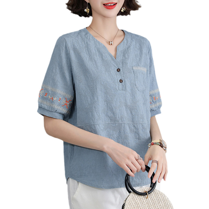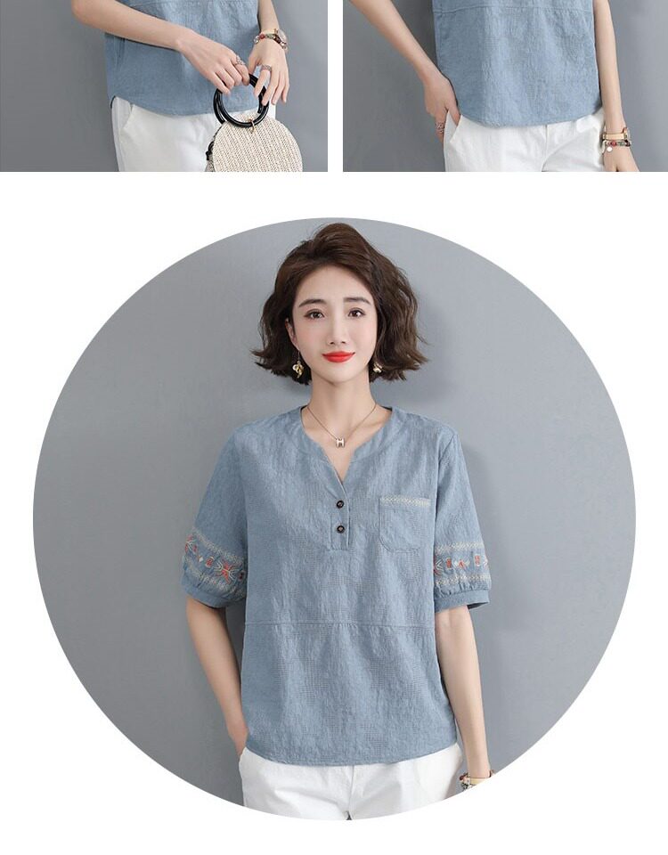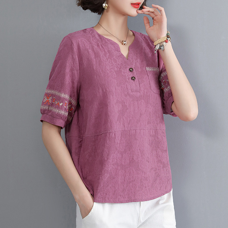 Летняя футболка, летняя одежда, модная рубашка, из хлопка и льна, V-образный вырез, короткий рукав