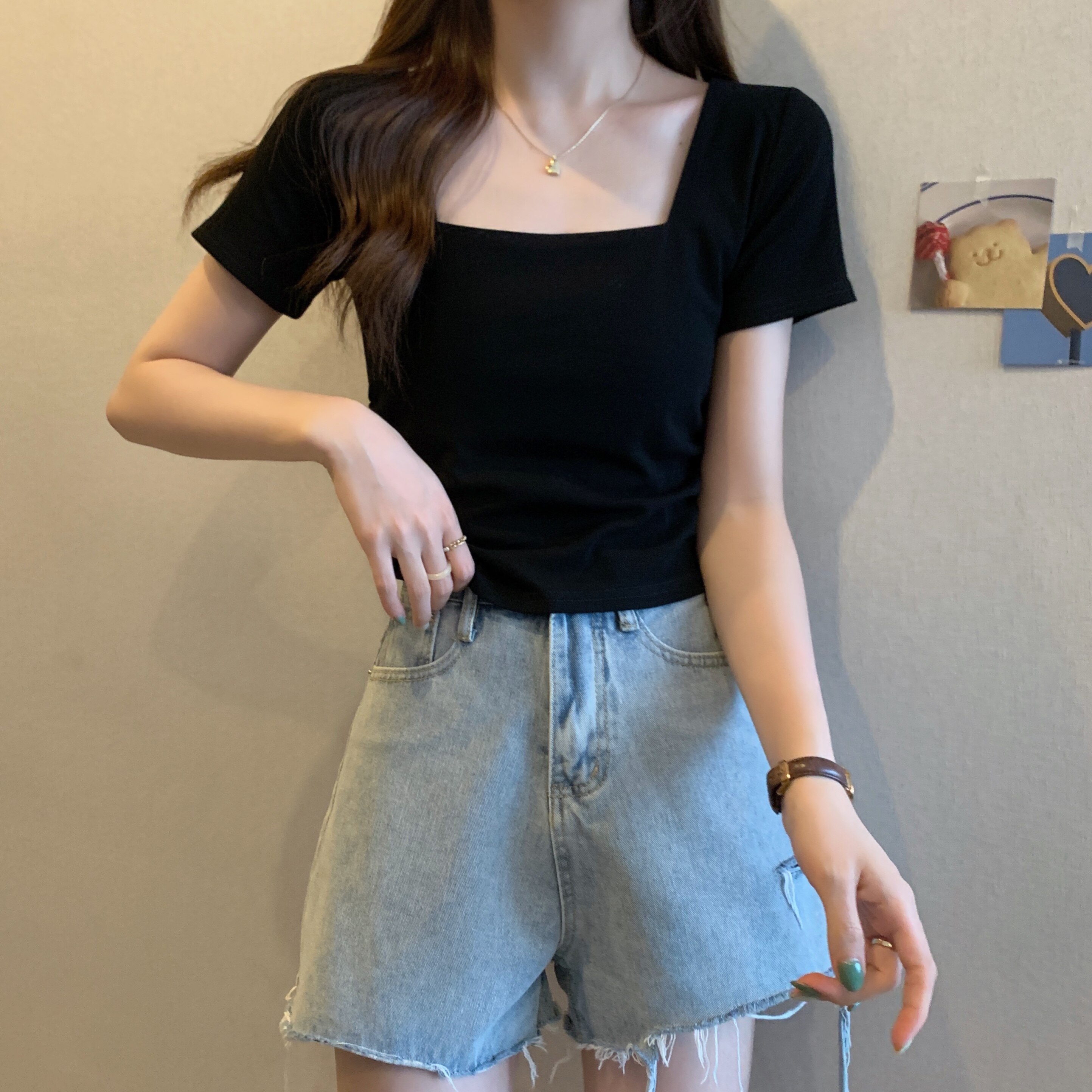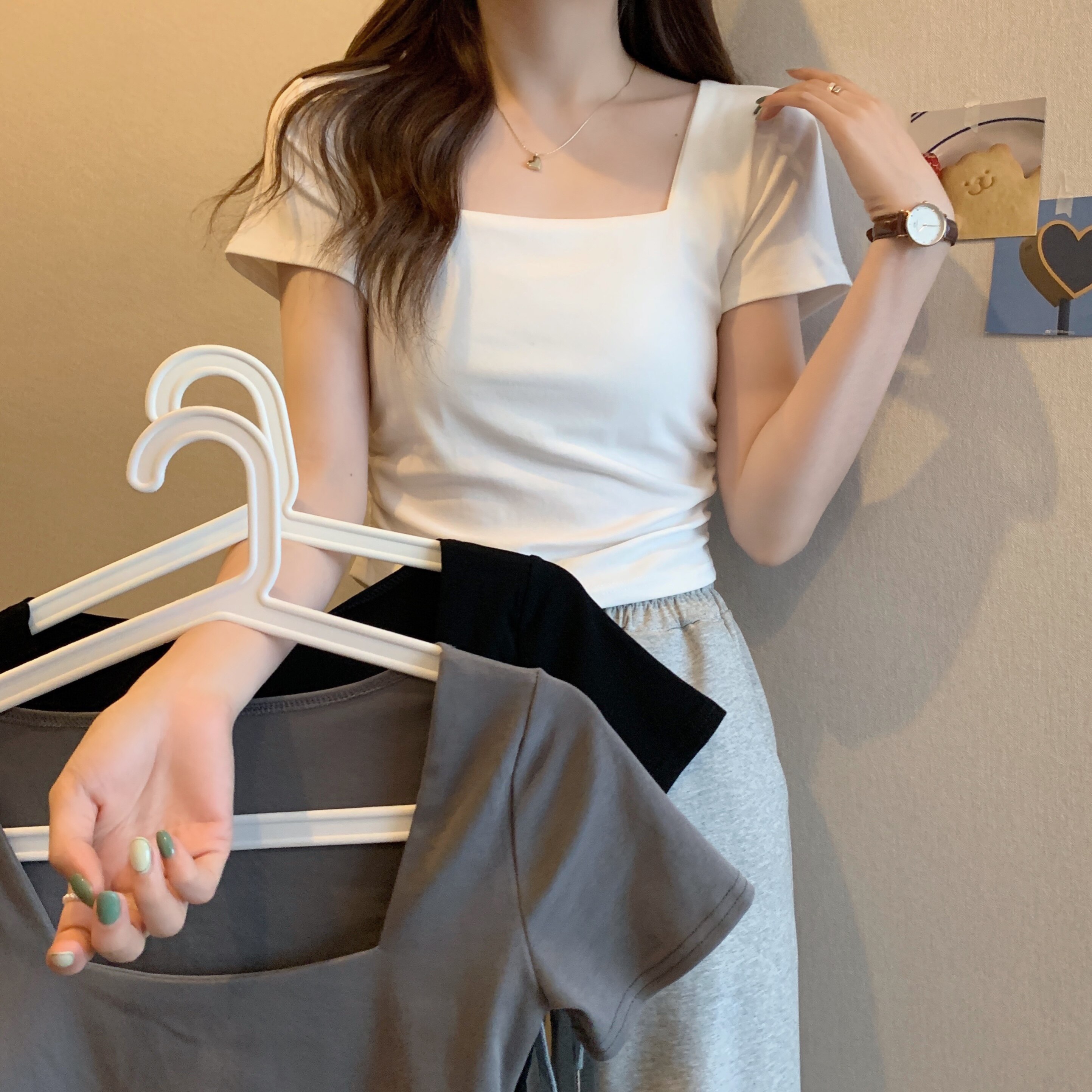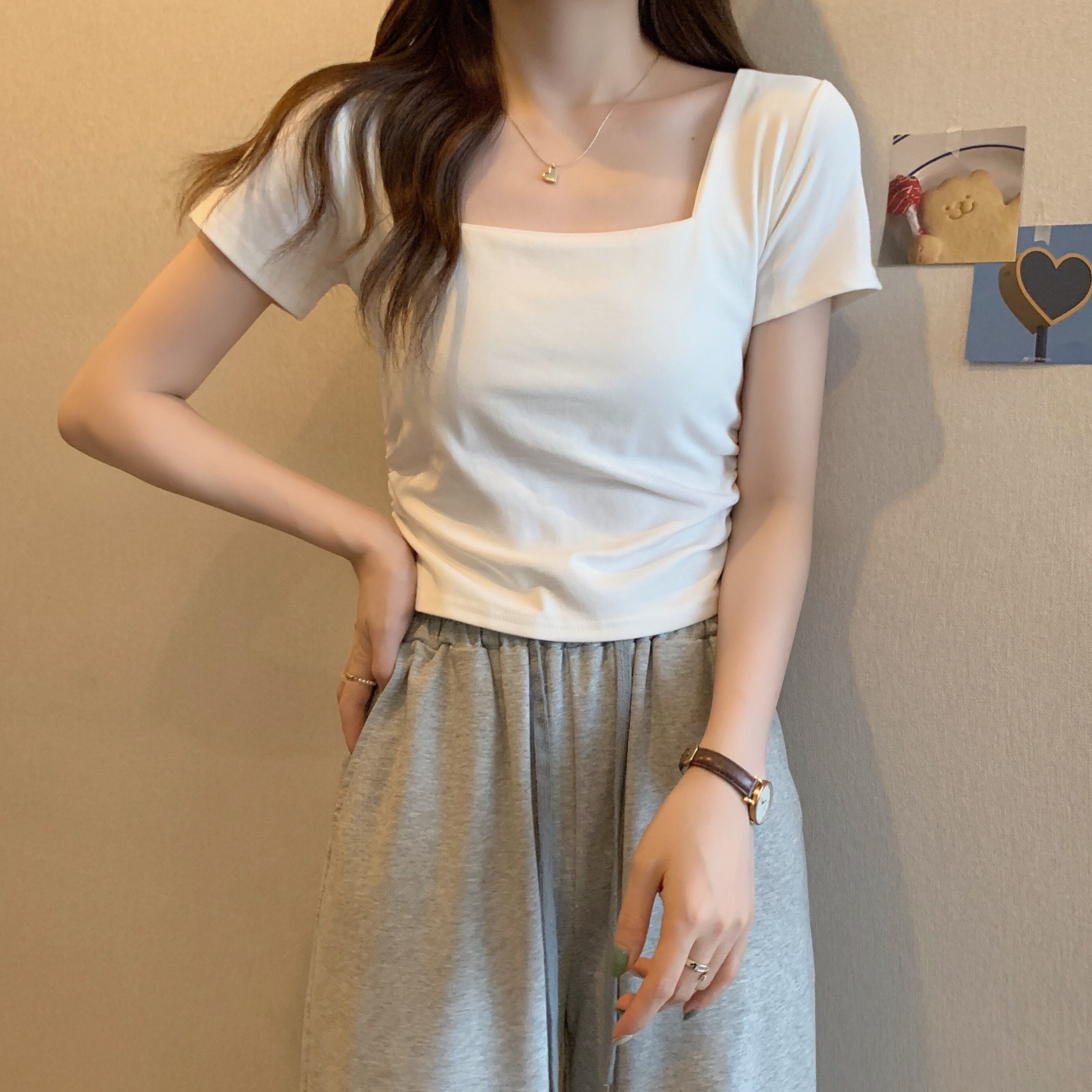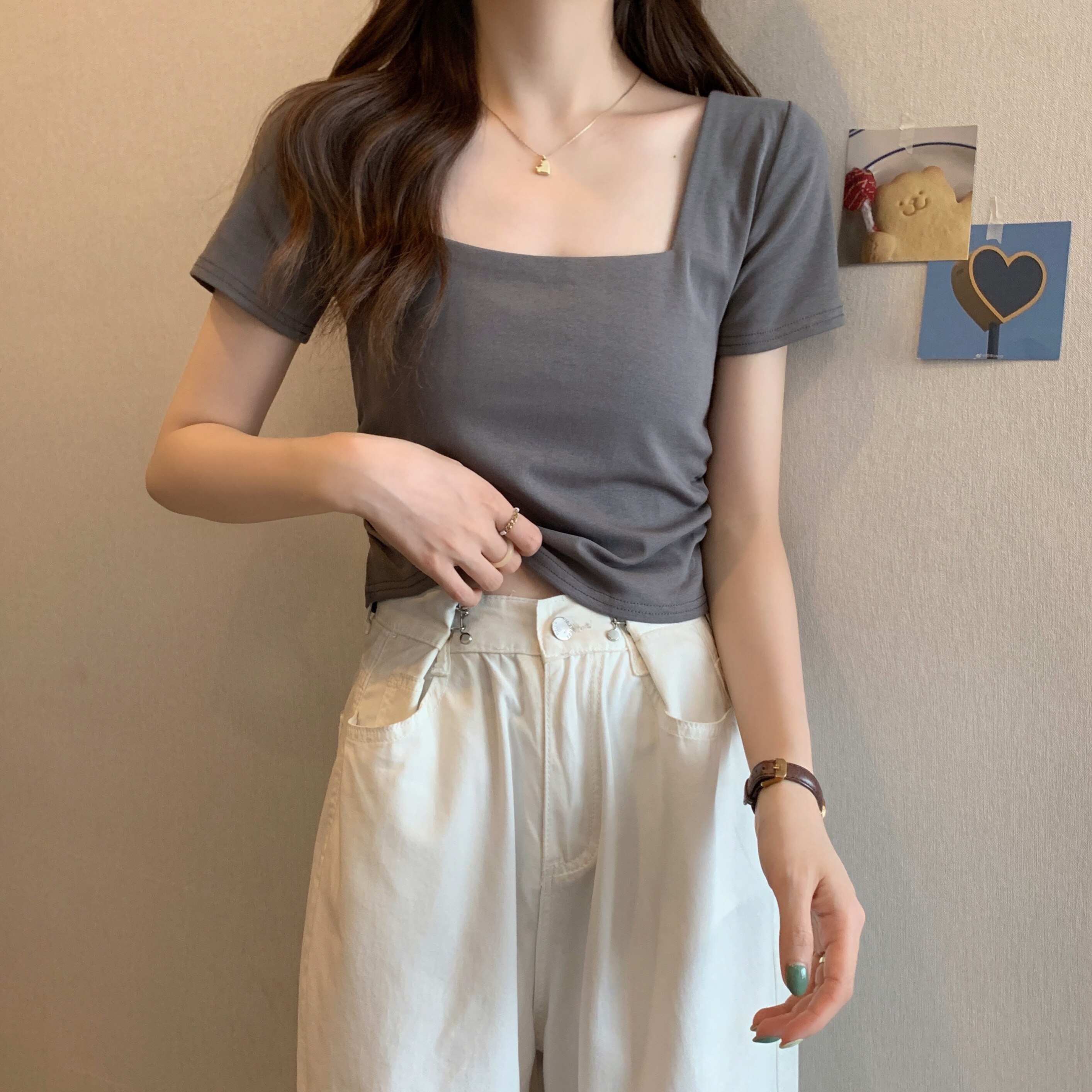 Летняя небольшая дизайнерская футболка, тренд сезона, квадратный вырез