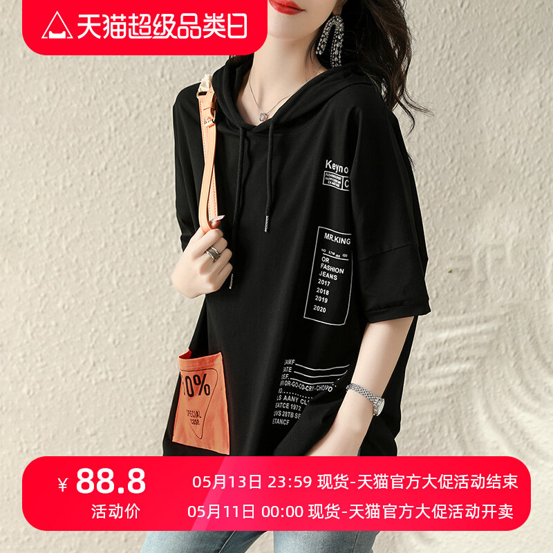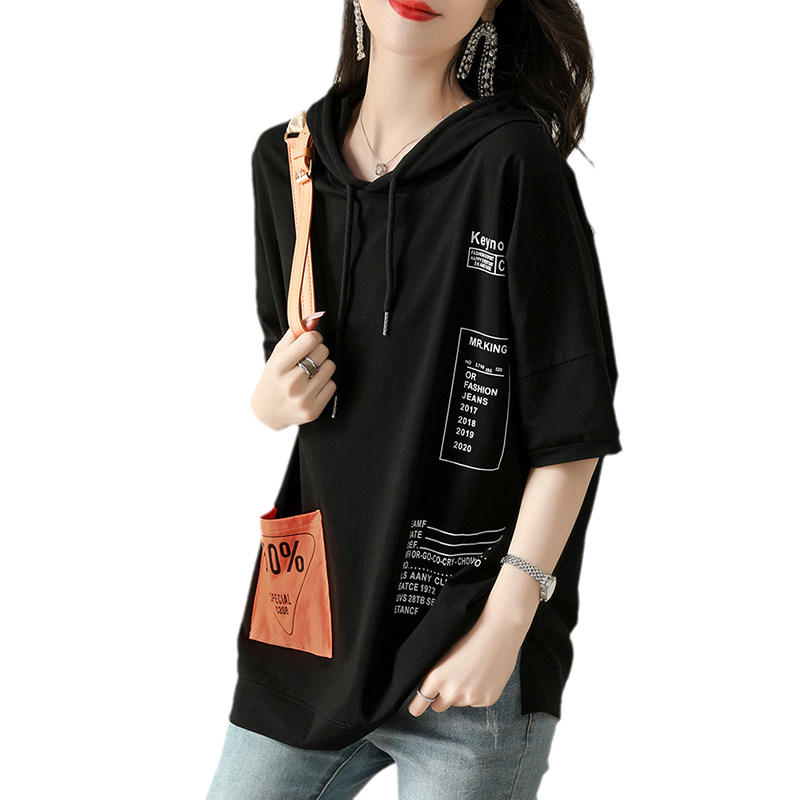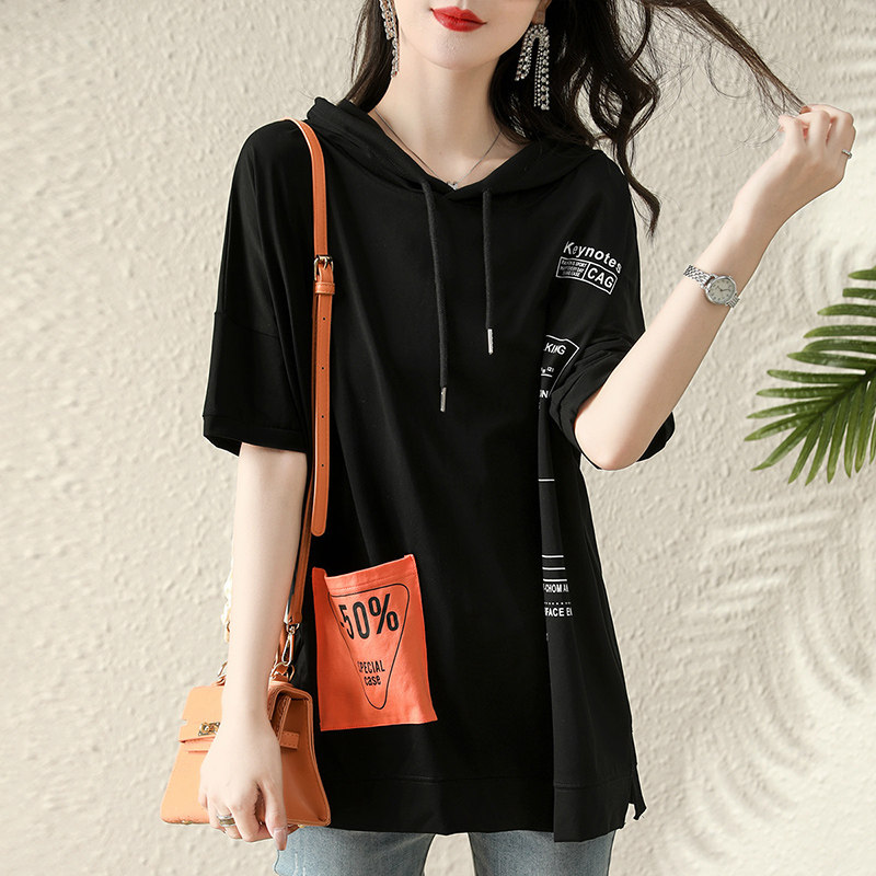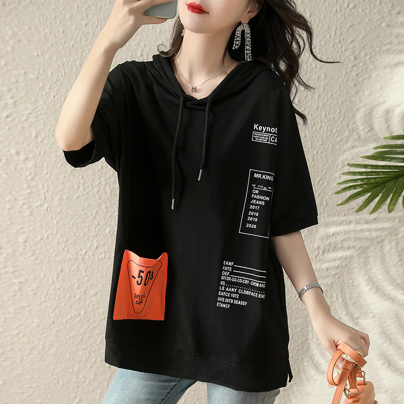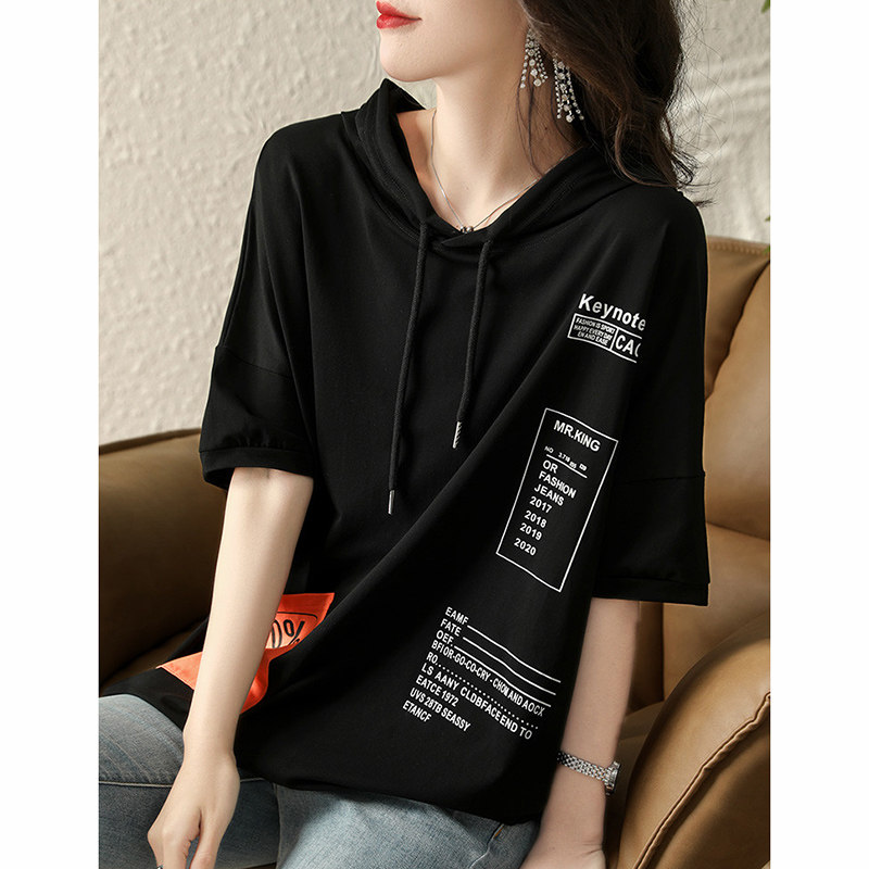 Хлопковая летняя футболка с капюшоном, летняя одежда, 2024 года, свободный крой, в западном стиле, короткий рукав